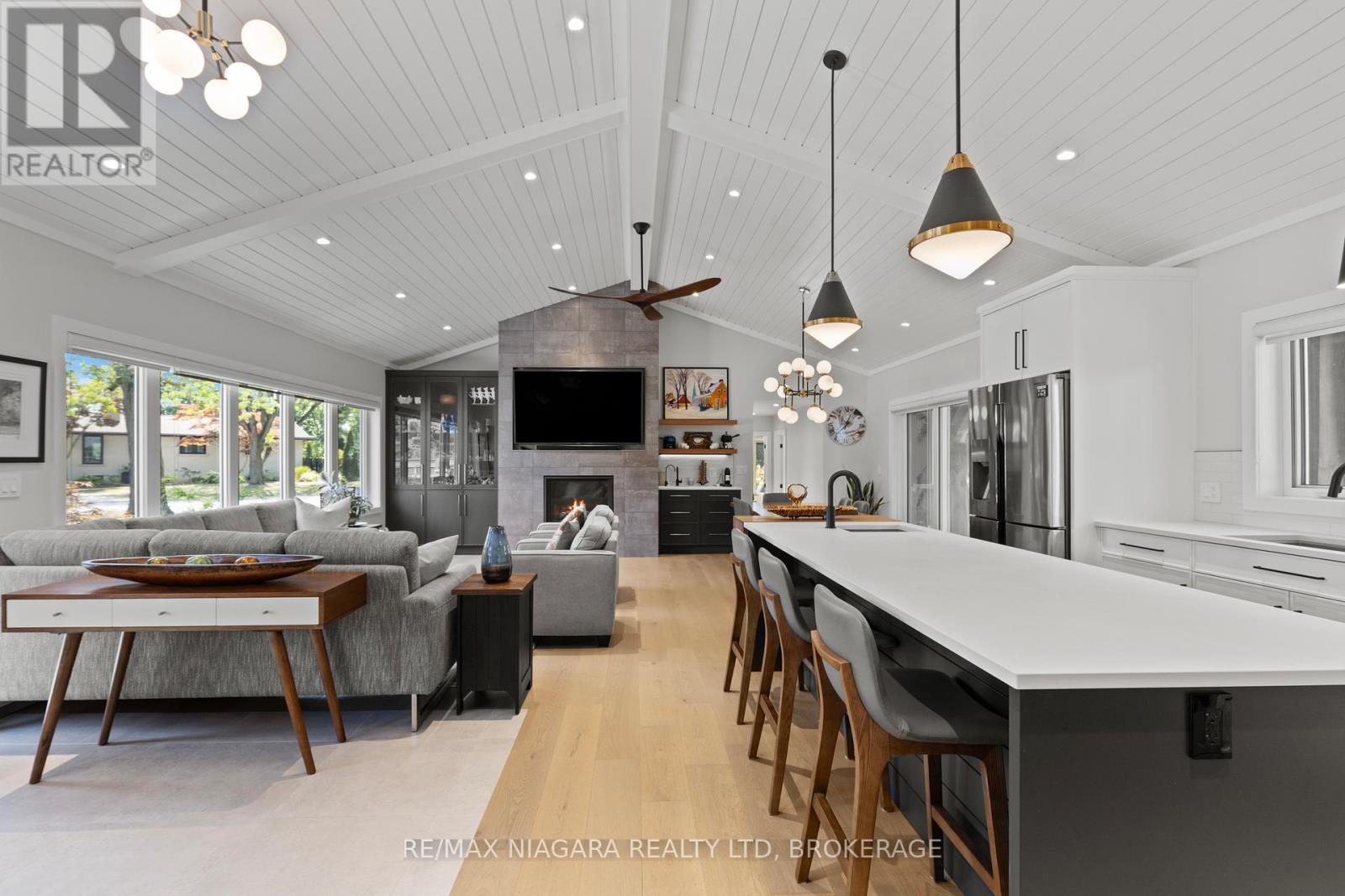 OPEN HOUSE SUNDAY FEB. 1st from 2-4PM. On one of the most desirable streets in the area, this stunning 5-bedroom, 3-bathroom ranch bungalow offers a rare combination of luxury, comfort, and craftsmanship. Completely rebuilt from top to bottom, it has been professionally designed by Jordan Station Design Co., interiors by Jen Nickel (Invision Design Solutions), and built to perfection. Every major system roof, HVAC, plumbing, electrical, insulation, windows, and exterior has been replaced or upgraded for true peace of mind. The inviting exterior features a Hemlock timber portico with a cozy gas fireplace, composite Everlast cladding, decorative stonework, LED soffit lighting, and beautifully landscaped grounds with concrete driveway, walkways, and patios. Step inside to soaring vaulted ceilings, rich engineered hardwood, and custom Millbrook cabinetry that set the tone for sophisticated open-concept living. The chefs kitchen is a showpiece, with Caesarstone counters, a centre island with prep sink, coffee bar, and premium appliances including a 48 GE Monogram gas range, Miele dishwasher, and Samsung 4-door fridge. The great rooms floor-to-ceiling tiled gas fireplace and oversized windows create a bright, inviting space for gatherings. The primary suite is a private retreat with a spa-inspired ensuite. A fully finished lower level features a second kitchen, custom bar with wine fridge, gas fireplace, and large egress windows ideal for entertaining, guests, or multi-generational living. Additional highlights include spray foam insulation, Carrier humidity-controlled HVAC, tankless water heater, water softener, and designer fixtures throughout. This is more than a home its a turnkey lifestyle in one of Niagara's most sought-after locations. (id:64974)