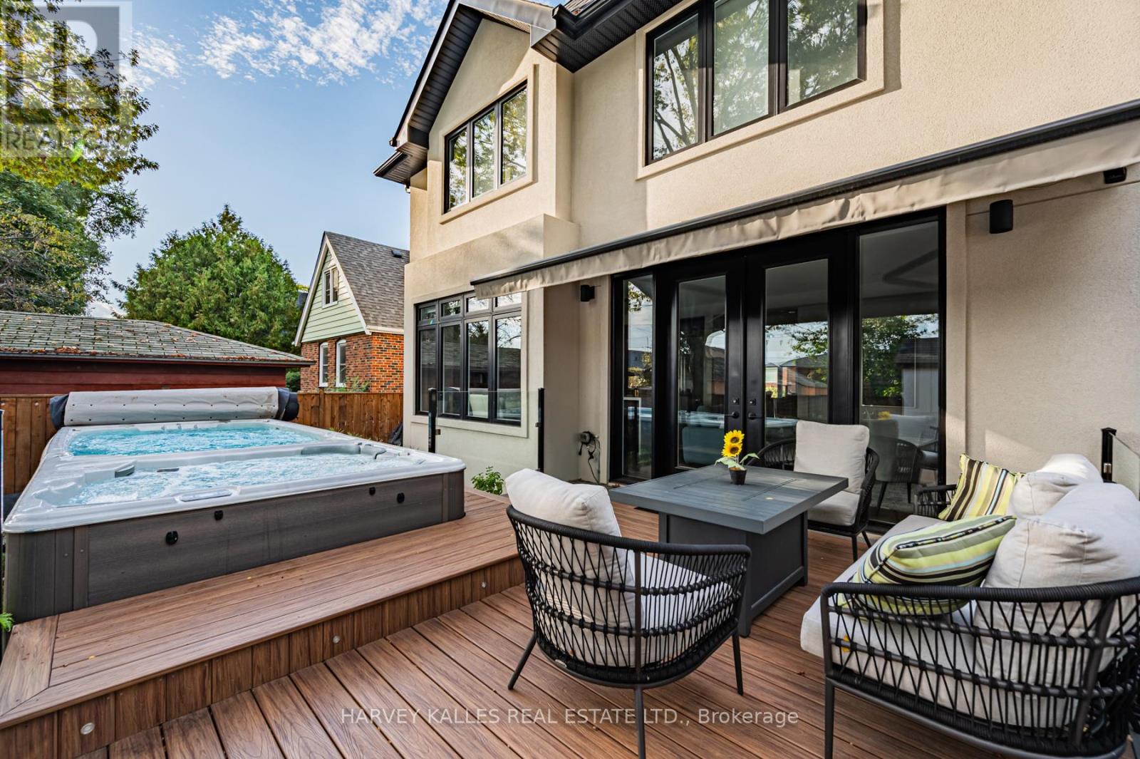 Set on a 40-foot wide lot in sought-after Topham Park, this custom-built (2020) home offers exceptional scale with over 3,500 square feet of indoor living space plus a south facing resort-style backyard sanctuary. High ceilings and expansive windows fill the home with natural light. The main floor is designed for daily routines and effortless entertaining, with elegant living and dining areas & a powder room. The show-stopping kitchen features a walk-through pantry/dry bar, sunny breakfast area, oversized quartz waterfall island, and premium Dacor appliances including a gas stove. Relax fireside in the handsome family room and step out to a backyard that defines luxury living, complete with year-round heated swim spa & hot tub, upgraded composite deck with glass railings and motorized awning, gas line for bbq, plus a lower garden retreat with mini putting green, outdoor TV lounge, water feature and dining area. Upstairs, every bedroom has an ensuite. The king-sized primary boasts a custom walk-in closet and dreamy spa-like bath with dual vanity, freestanding tub, and oversized shower. A large skylight illuminates the upper level, and convenient second-floor laundry adds everyday ease. The fully finished lower level, accessible via a side entrance, is ready for movie nights and includes space for a home gym & office, plus a fifth bedroom, full bath, and abundant storage. Central vac, a rough-in for a second laundry room, high-efficiency mechanicals, and dual sump pumps provide added flexibility and peace of mind. Smart upgrades include automated blinds, USB ports, and a Tesla/electric vehicle charger in the built-in garage. Beautiful landscaping and interlock paving enhance curb appeal. Close to the DVP for easy commuting, rapid transit incl TTC Crosstown, great schools, shopping, dining, parks, public tennis courts and nature trails. This is more than a house; it's a place where lifelong memories are made. (id:64974)