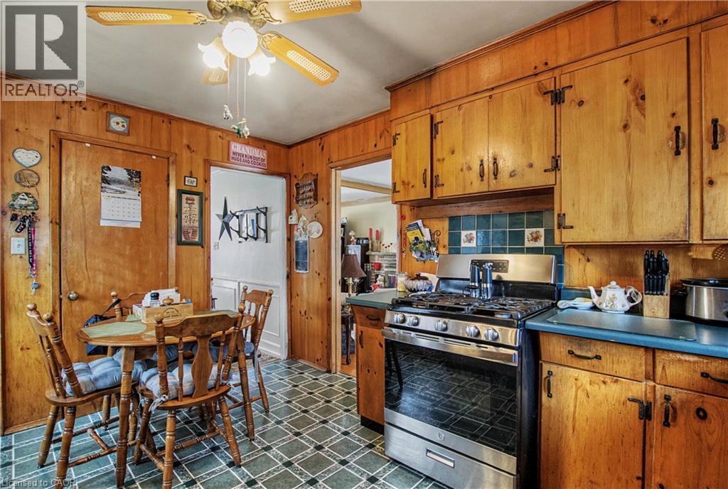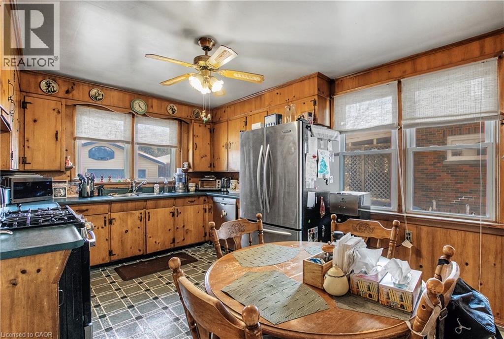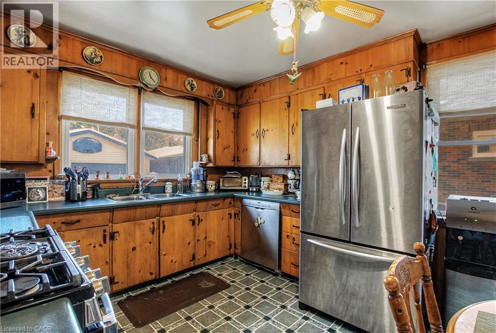 Welcome to this charming two-story home offering a cozy and comforting living space. This home is walking distance to parks, schools and downtown Galt area. The main level features a bright open-concept living and dining area with sliding doors that lead out to a stamped concrete patio, perfect for everyday living, relaxing or hosting guests. The kitchen is well equipped with ample storage, including a pantry and features a gas range (approx. 2 years old), stainless steel refrigerator and a Bosch dishwasher. Upstairs you will find three well-sized bedrooms filled with natural light and good sized closets, and a 3-piece bathroom that was renovated in 2024. The finished basement adds excellent value and flexibility for an in law suite or income potential. It is complete with a second kitchen, good sized bedroom, 3-piece bathroom and a generous sized recreation room with durable laminate flooring. This area is perfect for extended family, guests or additional living space. Oversized garage 21ft. X 21ft. with 2 storage sections. This home has had some major updates in the last two years (2024) which include: Brand new furnace 2026 with a 5 year warranty and first year with free service, high end laminate flooring in the basement, a new driveway, a cement stamped walkway out front, a 21X19 cement stamped pad at the back, egress windows and new window wells all around, new bathroom upstairs, new drains from the main kitchen sink to the main stack in the basement. New drain from the upstairs bathroom to the main floor bathroom. From the main drain (stack) pipe there is a new drain pipe all the way out to the main flush out. The foundation was re-built 9 ft down to the footings with cement re-bar and the basement wrapped in Blueskin WP200 and sealed from the back right corner to the front left corner. With it's warm character, functional layout and income potential this home is ready to welcome its next owner. (id:64974)