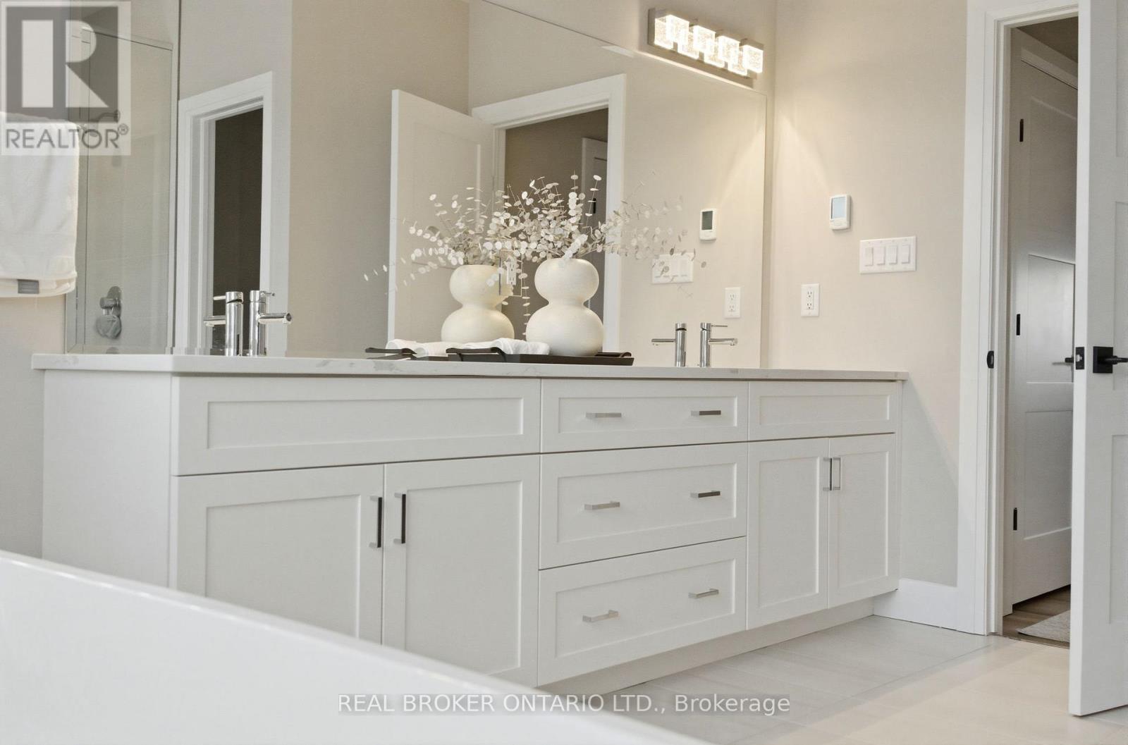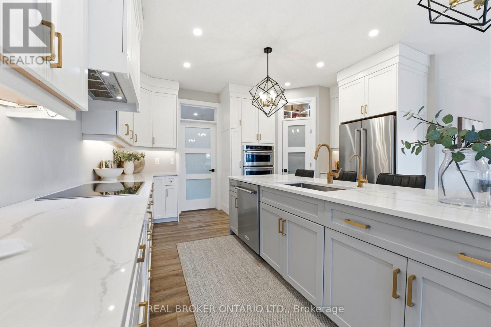 Experience the pinnacle of modern luxury in this 2021 custom-built masterpiece, situated on a premium 50-foot lot backing onto the serene Conestoga River and protected green space. The main floor welcomes you with a bright, open, and modern layout that flows seamlessly into a chef's dream kitchen, complete with professional KitchenAid appliances, granite countertops, a massive walk-in pantry, and tons of storage for ultimate organization. This carpet-free home boasts over $150,000 in upgrades, featuring custom hardwood stairs and dedicated office spaces throughout, while the primary retreat offers a spa-like ensuite with heated floors and a double sink vanity. The exterior shines with Gemstone architectural lighting, a triple-car tandem garage, and a maintenance-free TREX deck equipped with gas lines for both your BBQ and outdoor fireplace. Offering an incredible value-add opportunity, the walk-out basement comes with an active, fully-paid building permit, allowing you to bypass municipal delays and finish the space to your exact taste. Perfectly located just minutes from the St. Jacobs Farmers' Market, trails, and boutique shopping, this home seamlessly blends high-end sophistication with a tranquil, small-town lifestyle. (id:64974)