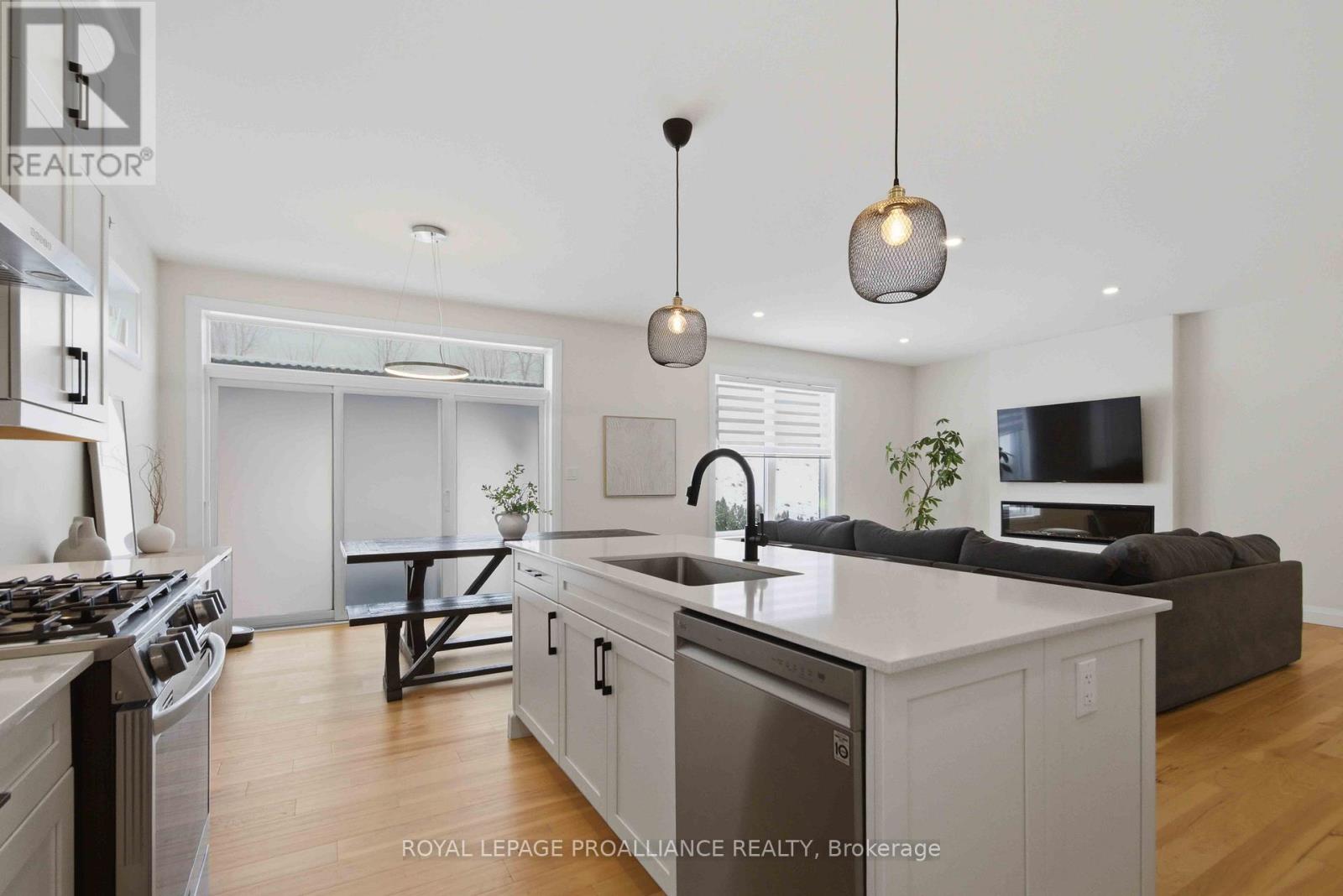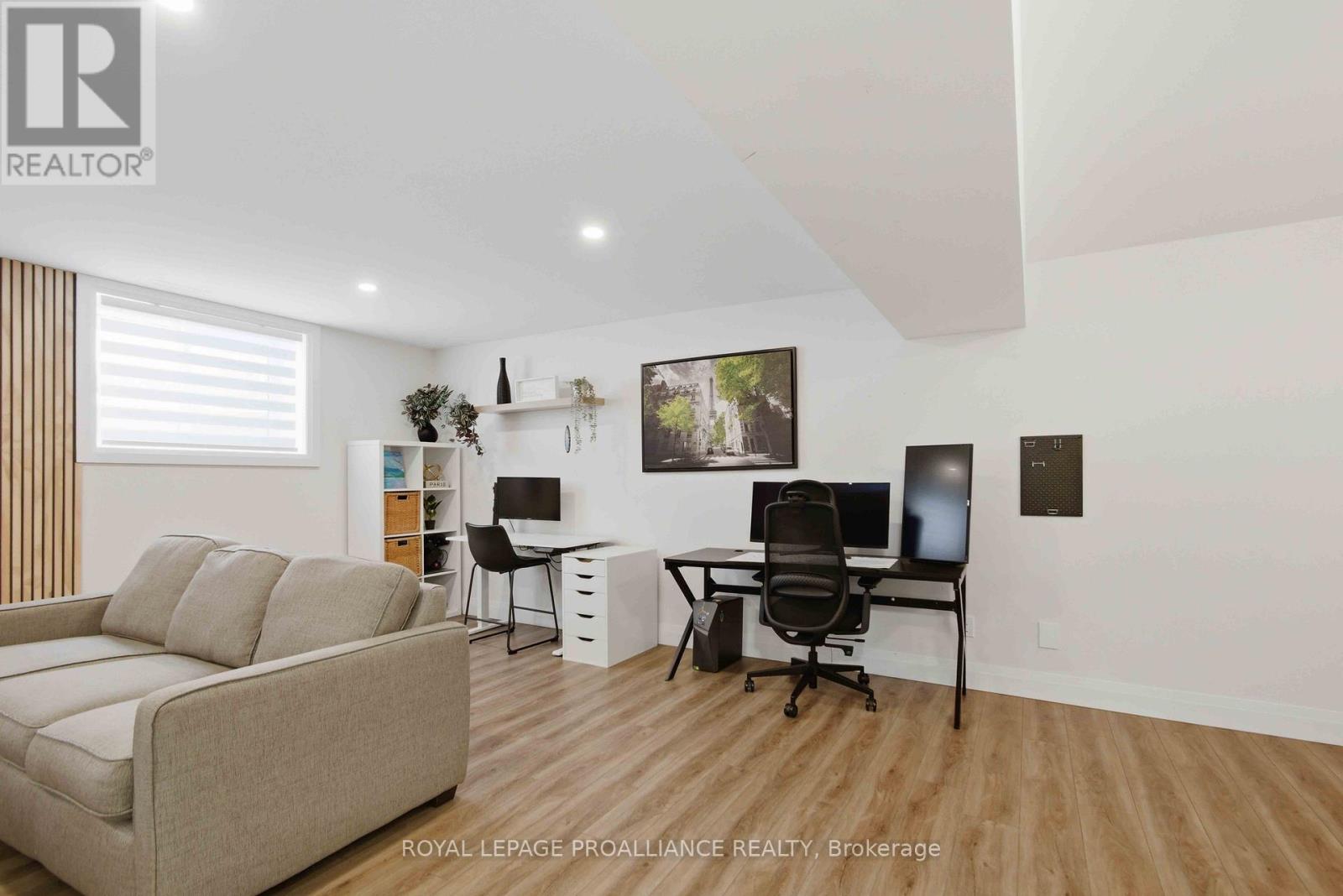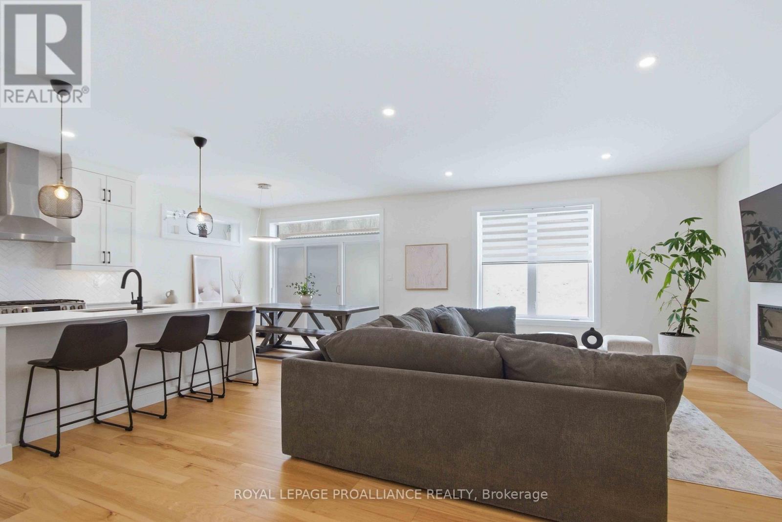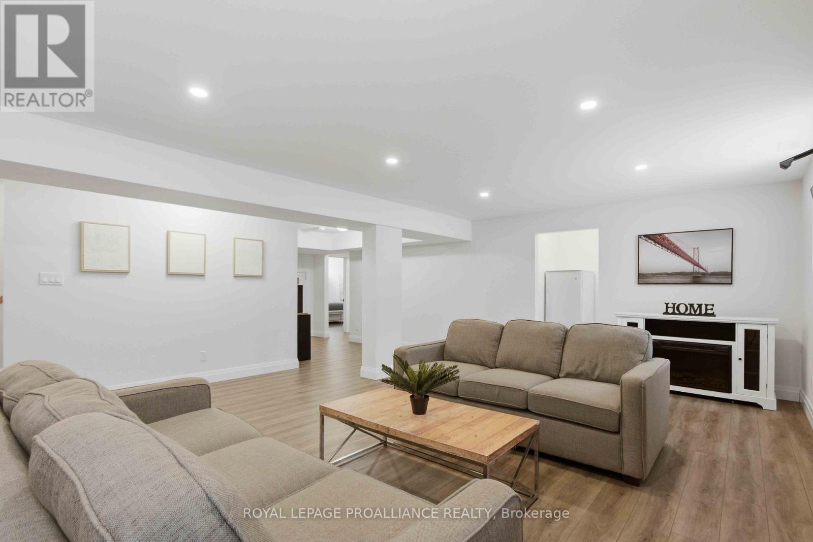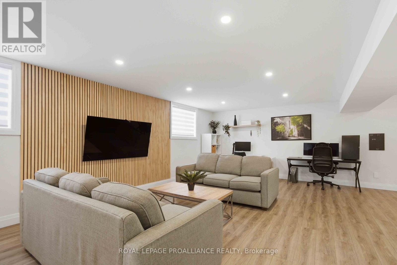Wow here it is - a spacious home with a fully finished lower level with lots of upgrades and an extra deep lot. From the stately covered front entranceway and oversized foyer the tone is set. Four bedrooms plus an office/exercise room and three bathrooms, a double garage PLUS a mezzanine storage area above. Spacious kitchen with an abundant amount of cabinets to the ceiling with crown moulding, large island with quartz countertops and more storage, backsplash, transom window for more natural light, 9 foot patio door to deck AND a spacious kitchen pantry. Living room with oversized window and electric fireplace is bright and inviting. Primary bedroom easily handles the king size bed with another large window over looking the private backyard. Ensuite bath with glass and tile shower, double sinks in the vanity plus the walk in closet which is also oversized. The lower level boasts a recreation room that could easily fit a large sectional and pool table and it has a beautiful accent wall. Two additional bedrooms plus an exercise room/office area plus the third full bath complete this primeau package. Located in the very desirable Orchard Lane development with its own park but no townhouses or apartments, you are 5 mins to 401/Walmart, 10 mins to YMCA/CFB Trenton, Prince Edward County and Marina. This is the one you have been waiting for. (id:64974)