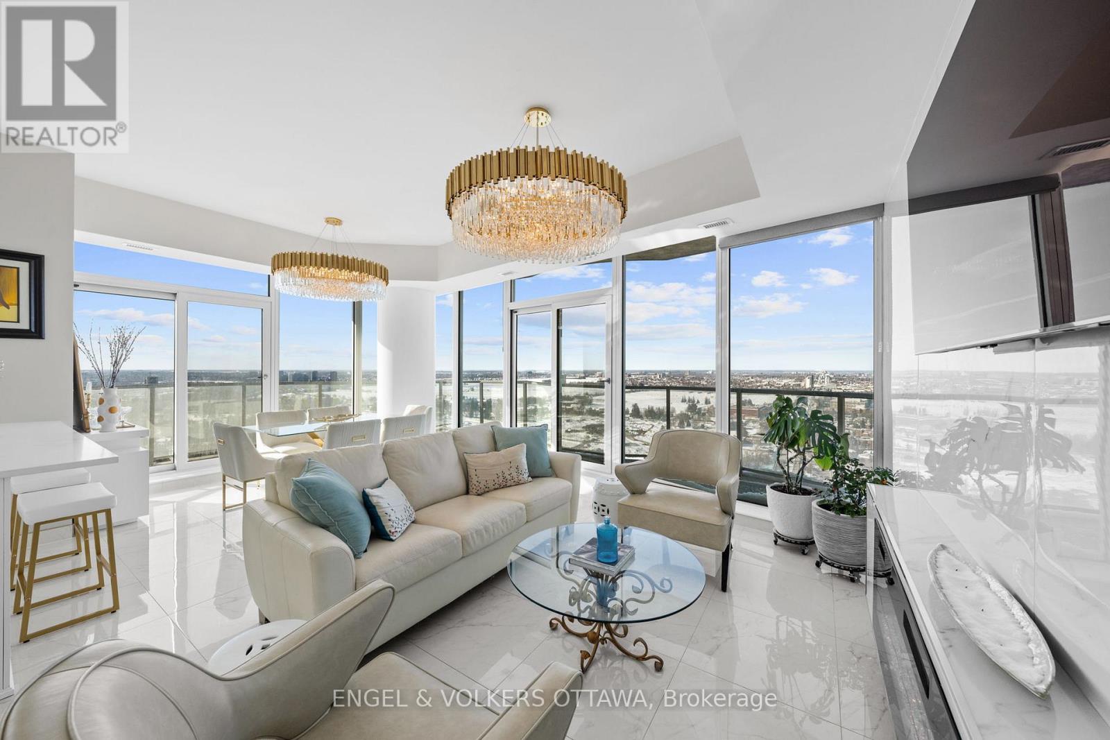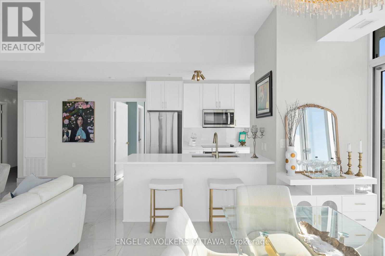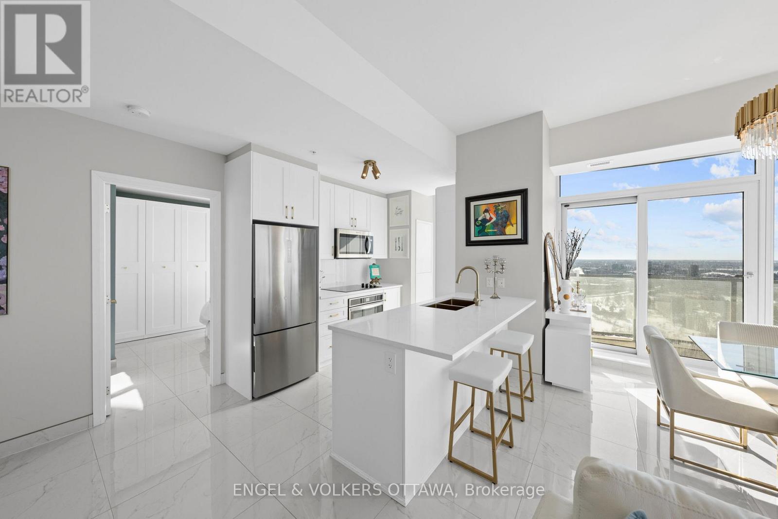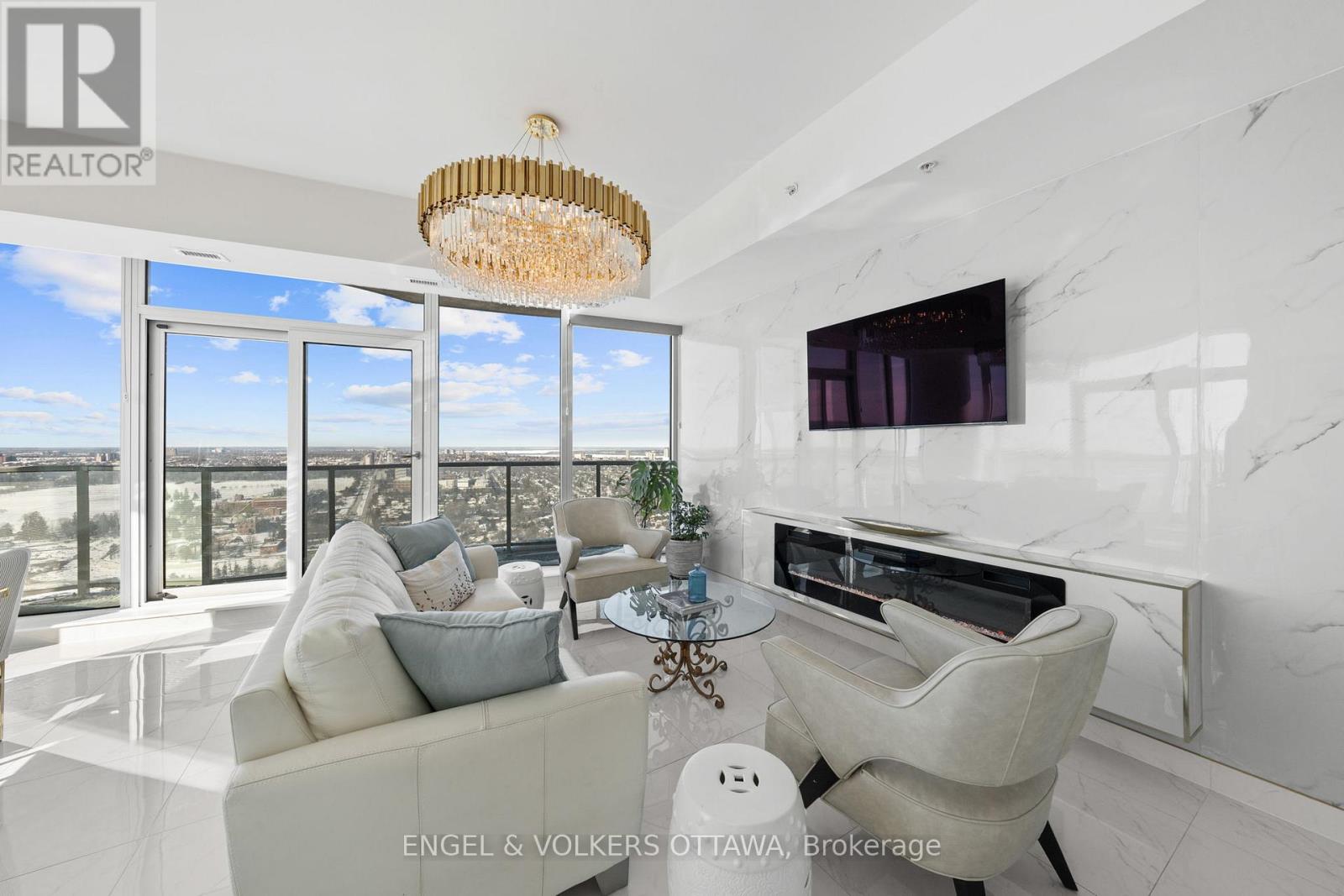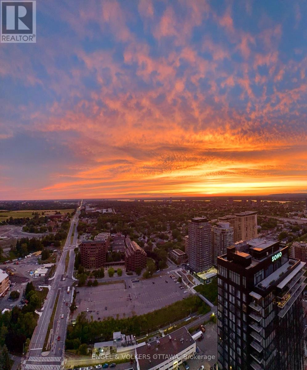 A SKY RESIDENCE ABOVE IT ALL. Perched high above Little Italy in The Icon, this beautiful 1,160 sq.ft. 2-bedroom, 2-bath condo captures breathtaking panoramic views from the Gatineau Hills across Dow's Lake and beyond, with spectacular light from sunrise to sunset. 3 private balconies extend from the principal rooms, creating a sense of openness. Recently reimagined with exquisite porcelain flooring, the interior feels sophisticated and entirely bespoke. A dramatic marble-inspired feature wall anchors the living space, paired with a sleek contemporary fireplace that introduces warmth and striking visual impact. Two imported statement chandeliers bring sculptural elegance and unmistakable glamour. Brushed gold detailing is integrated throughout the main living areas, from custom baseboard trim to upgraded faucets, hardware and kitchen sink, creating an elevated aesthetic. The kitchen is sleek with quartz surfaces and stainless-steel appliances. The primary suite offers a serene retreat with a beautifully designed walk-in closet and an elegant ensuite featuring a glass shower. A well-proportioned second bedroom provides flexibility for guests or a sophisticated home office. A beautifully appointed main 4-piece bathroom completes the home, finished with refined materials and a clean, timeless aesthetic. Electronic sun and heat screens and blackout blinds offer comfort and privacy at the touch of a button. In-unit laundry adds everyday convenience. Included is one of the building's most desirable three-sided parking spaces with two storage units. Life at The Icon places you moments from Dow's Lake, the Rideau Canal, and the restaurants of Little Italy. With a pool, sauna, gym, theatre, and guest suites. The Icon delivers an amenity-rich lifestyle with the feel of an urban resort. An exceptional opportunity to own a meticulously upgraded residence in one of Ottawa's most dynamic neighbourhoods. This is elevated living: Architectural. Intentional. Unforgettable. (id:64974)