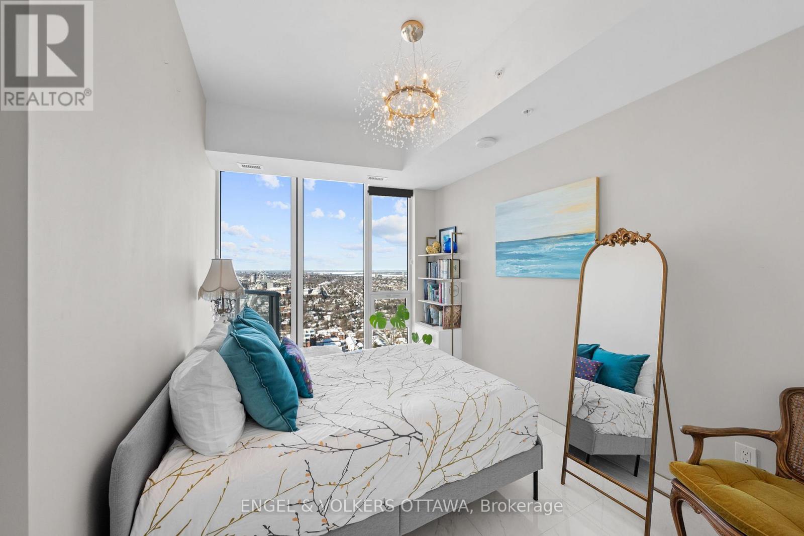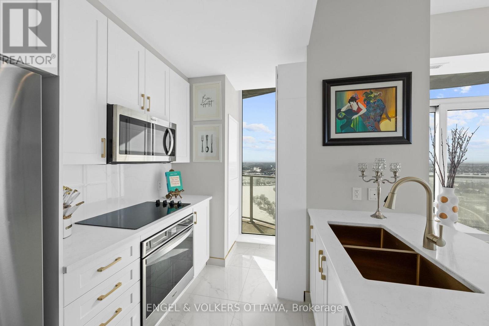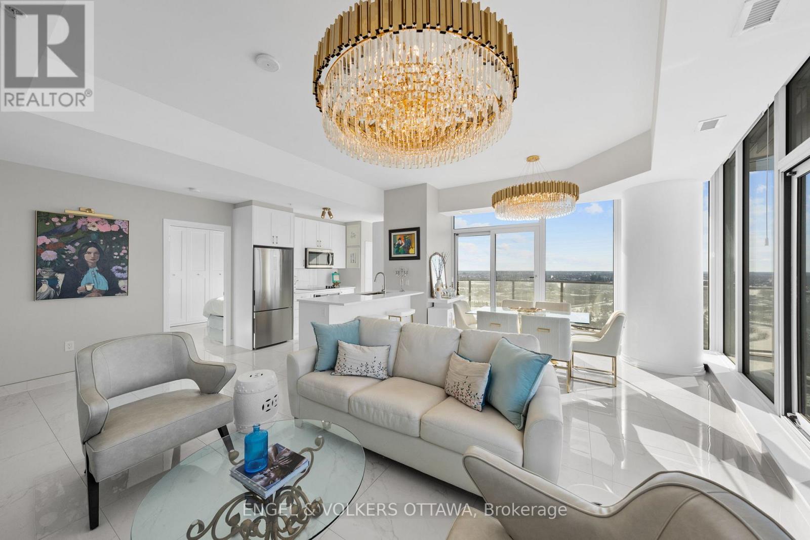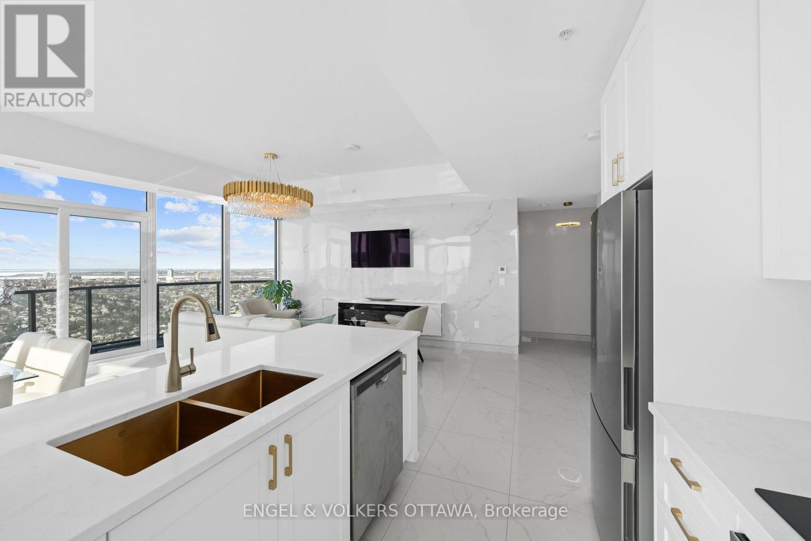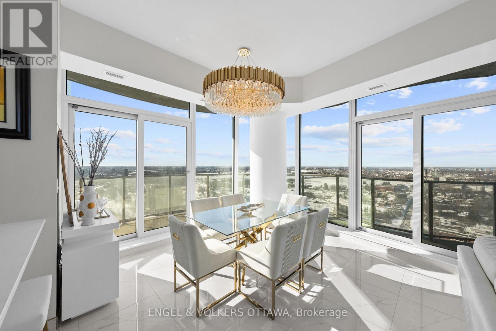 A SKY RESIDENCE ABOVE IT ALL. Perched high above Little Italy in The Icon, this beautiful 1,160 sq.ft. 2-bedroom, 2-bath condo captures breathtaking panoramic views from the Gatineau Hills across Dow's Lake and beyond, with spectacular light from sunrise to sunset. 3 private balconies extend from the principal rooms, creating a sense of openness. Recently reimagined with exquisite porcelain flooring, the interior feels sophisticated and entirely bespoke. A dramatic marble-inspired feature wall anchors the living space, paired with a sleek contemporary fireplace that introduces warmth and striking visual impact. Two imported statement chandeliers bring sculptural elegance and unmistakable glamour. Brushed gold detailing is integrated throughout the main living areas, from custom baseboard trim to upgraded faucets, hardware and kitchen sink, creating an elevated aesthetic. The kitchen is sleek with quartz surfaces and stainless-steel appliances. The primary suite offers a serene retreat with a beautifully designed walk-in closet and an elegant ensuite featuring a glass shower. A well-proportioned second bedroom provides flexibility for guests or a sophisticated home office. A beautifully appointed main 4-piece bathroom completes the home, finished with refined materials and a clean, timeless aesthetic. Electronic sun and heat screens and blackout blinds offer comfort and privacy at the touch of a button. In-unit laundry adds everyday convenience. Included is one of the building's most desirable three-sided parking spaces with two storage units. Life at The Icon places you moments from Dow's Lake, the Rideau Canal, and the restaurants of Little Italy. With a pool, sauna, gym, theatre, and guest suites. The Icon delivers an amenity-rich lifestyle with the feel of an urban resort. An exceptional opportunity to own a meticulously upgraded residence in one of Ottawa's most dynamic neighbourhoods. This is elevated living: Architectural. Intentional. Unforgettable. (id:64974)