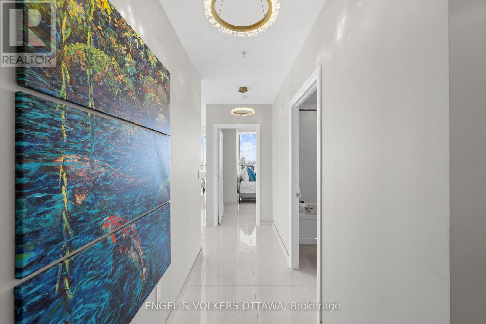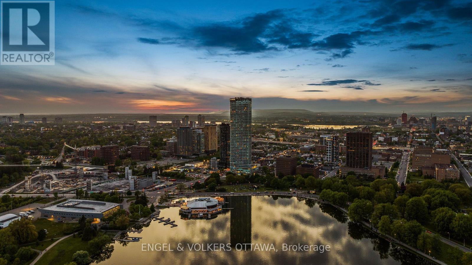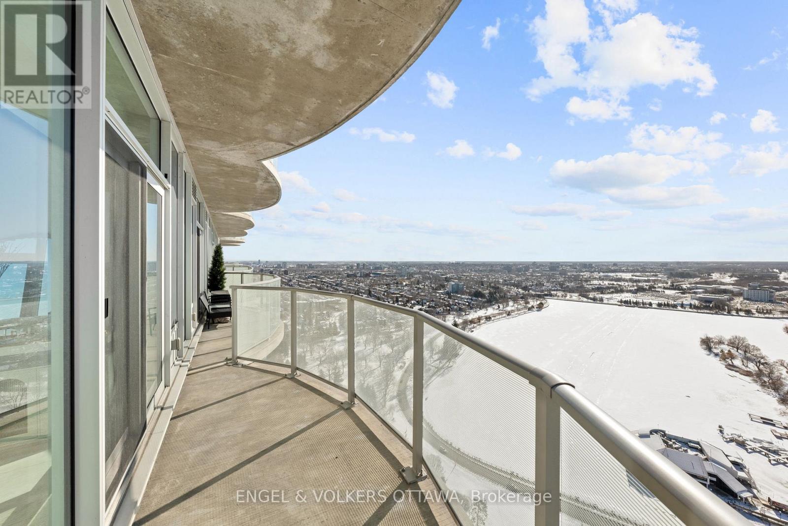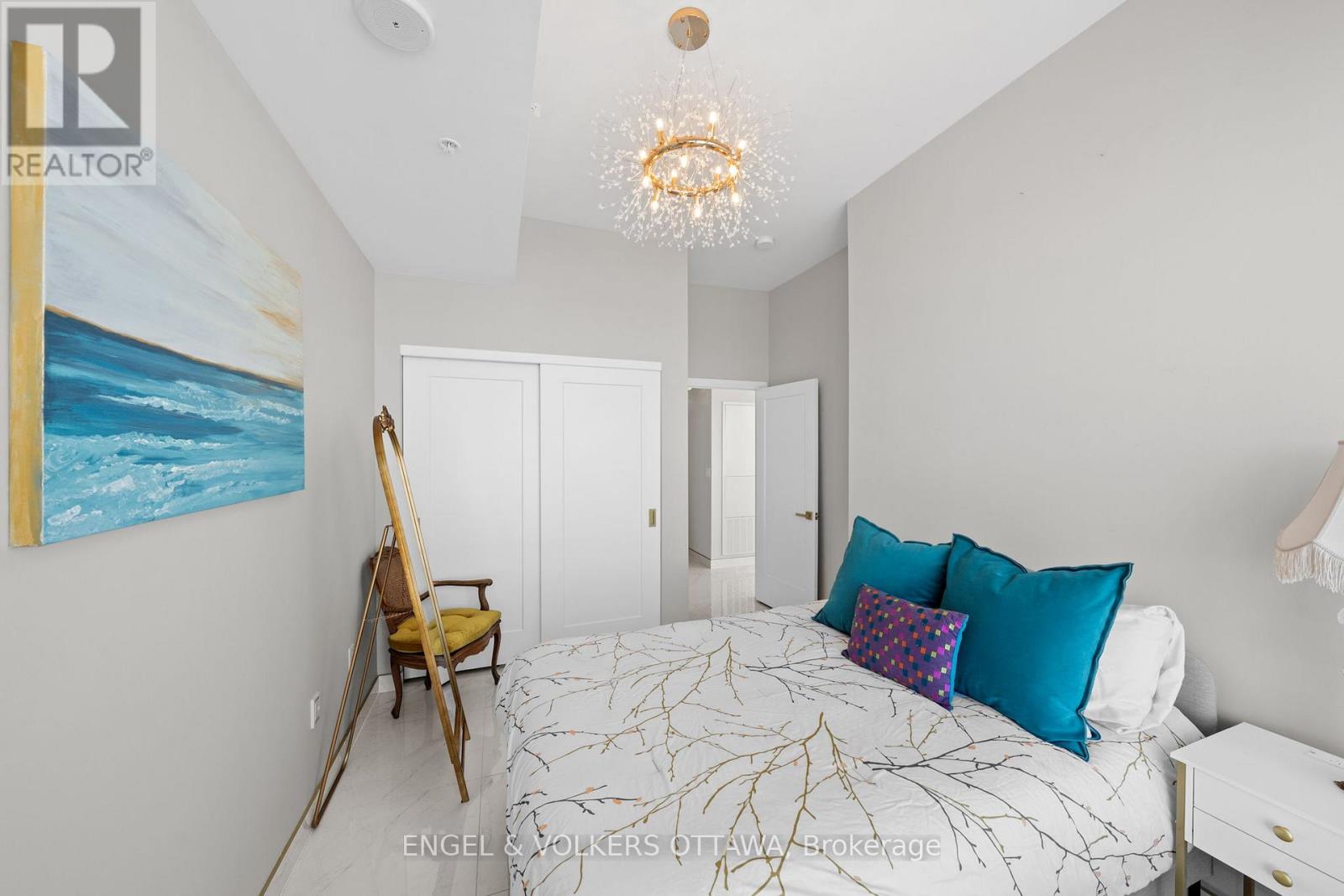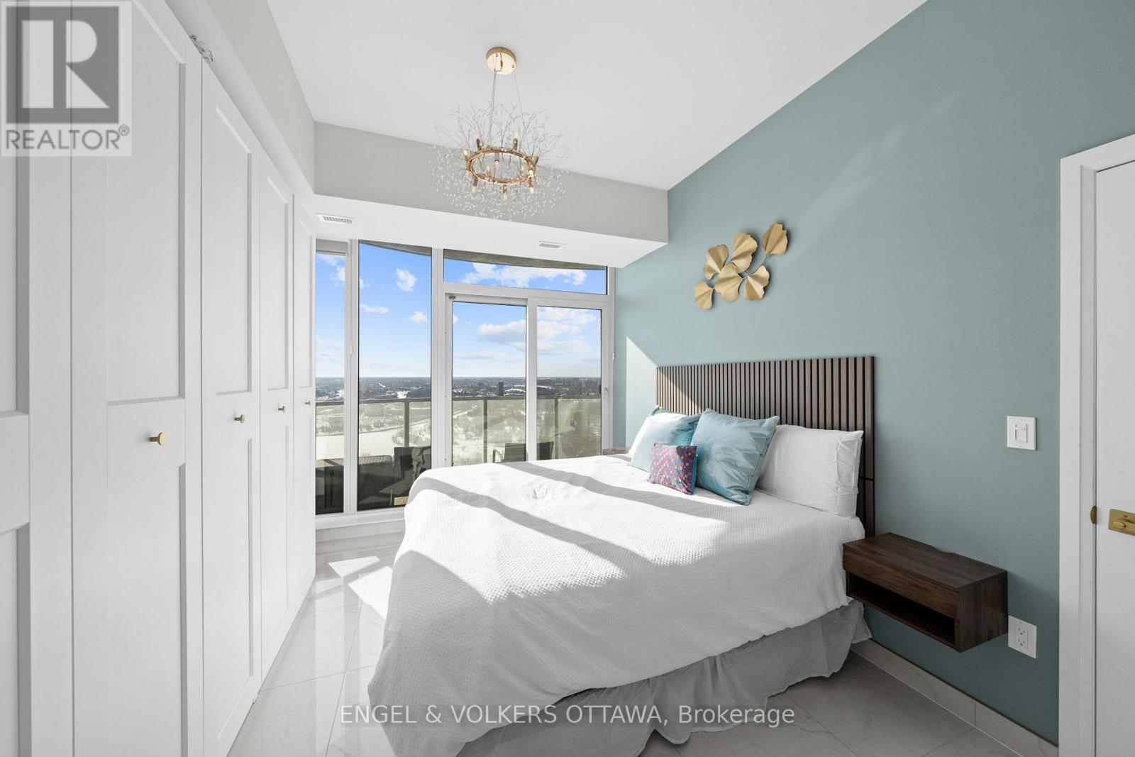 A SKY RESIDENCE ABOVE IT ALL. Perched high above Little Italy in The Icon, this beautiful 1,160 sq.ft. 2-bedroom, 2-bath condo captures breathtaking panoramic views from the Gatineau Hills across Dow's Lake and beyond, with spectacular light from sunrise to sunset. 3 private balconies extend from the principal rooms, creating a sense of openness. Recently reimagined with exquisite porcelain flooring, the interior feels sophisticated and entirely bespoke. A dramatic marble-inspired feature wall anchors the living space, paired with a sleek contemporary fireplace that introduces warmth and striking visual impact. Two imported statement chandeliers bring sculptural elegance and unmistakable glamour. Brushed gold detailing is integrated throughout the main living areas, from custom baseboard trim to upgraded faucets, hardware and kitchen sink, creating an elevated aesthetic. The kitchen is sleek with quartz surfaces and stainless-steel appliances. The primary suite offers a serene retreat with a beautifully designed walk-in closet and an elegant ensuite featuring a glass shower. A well-proportioned second bedroom provides flexibility for guests or a sophisticated home office. A beautifully appointed main 4-piece bathroom completes the home, finished with refined materials and a clean, timeless aesthetic. Electronic sun and heat screens and blackout blinds offer comfort and privacy at the touch of a button. In-unit laundry adds everyday convenience. Included is one of the building's most desirable three-sided parking spaces with two storage units. Life at The Icon places you moments from Dow's Lake, the Rideau Canal, and the restaurants of Little Italy. With a pool, sauna, gym, theatre, and guest suites. The Icon delivers an amenity-rich lifestyle with the feel of an urban resort. An exceptional opportunity to own a meticulously upgraded residence in one of Ottawa's most dynamic neighbourhoods. This is elevated living: Architectural. Intentional. Unforgettable. (id:64974)
