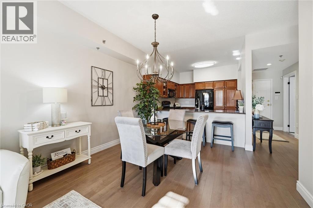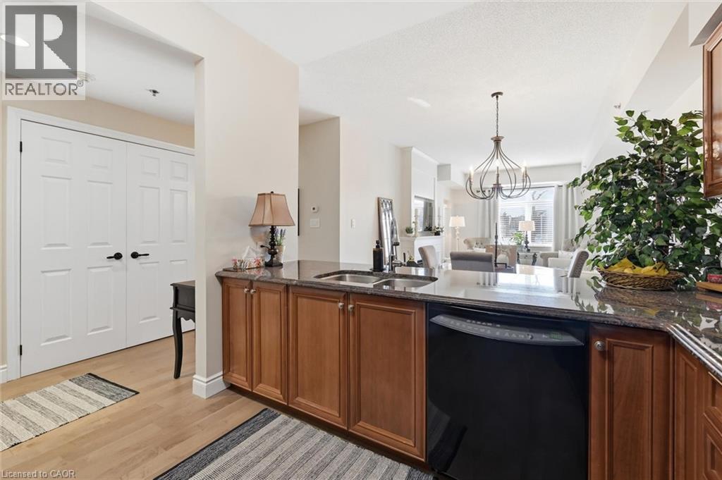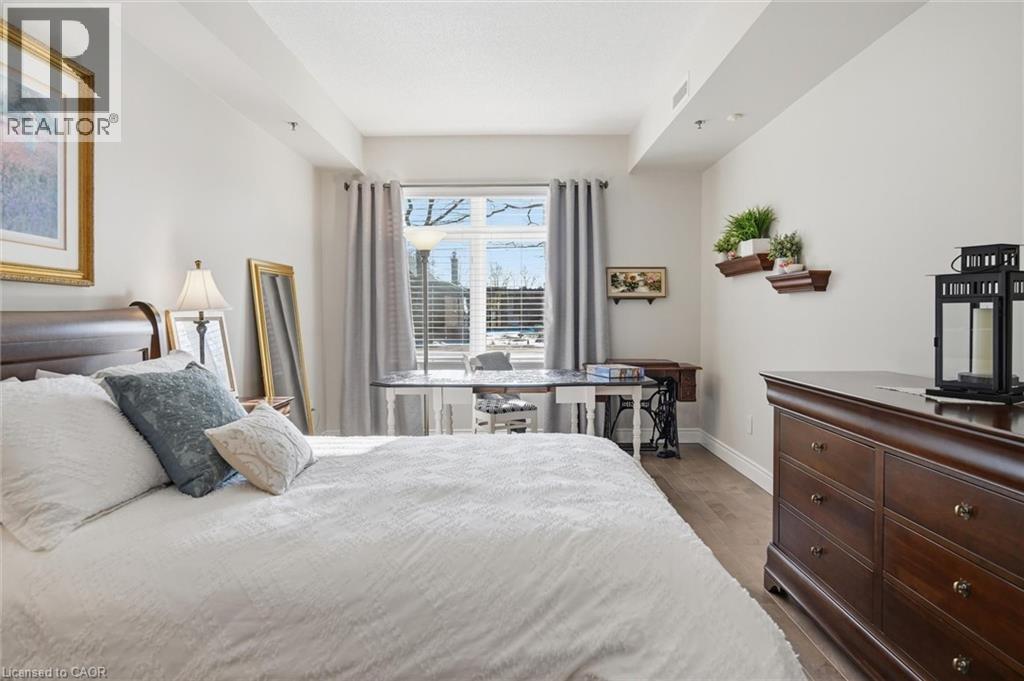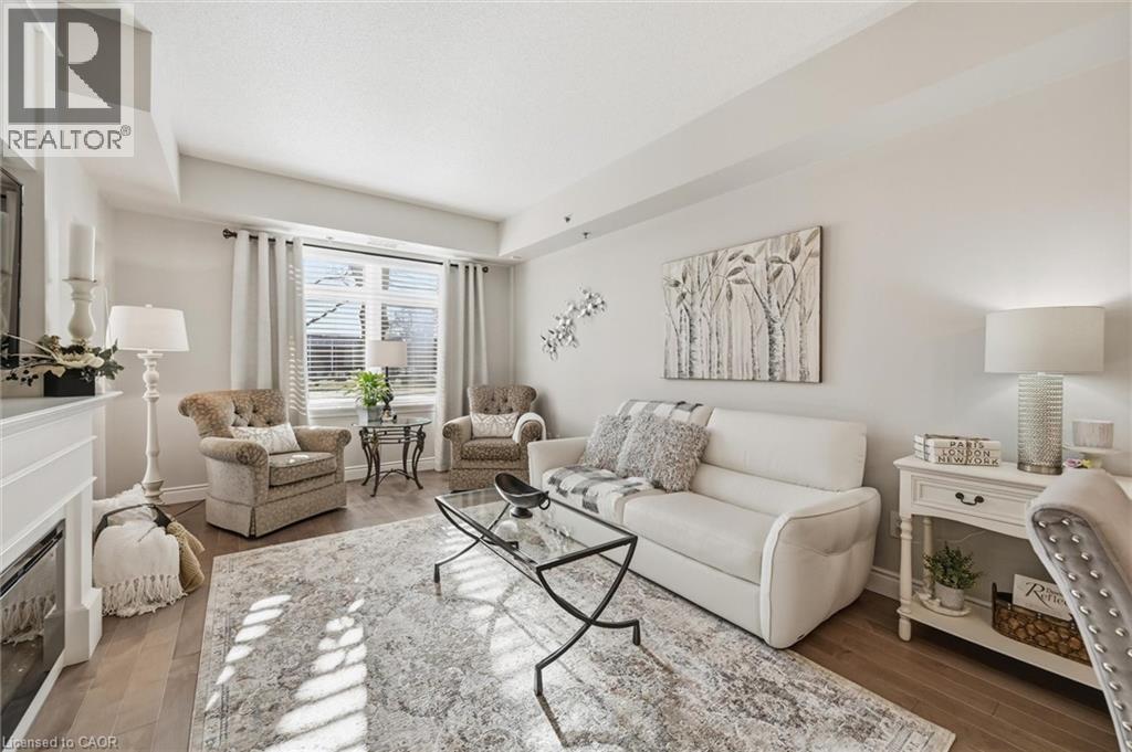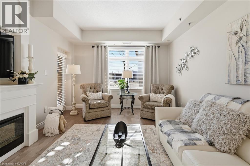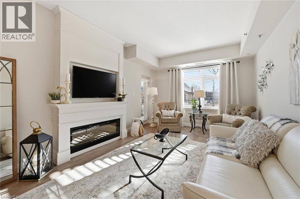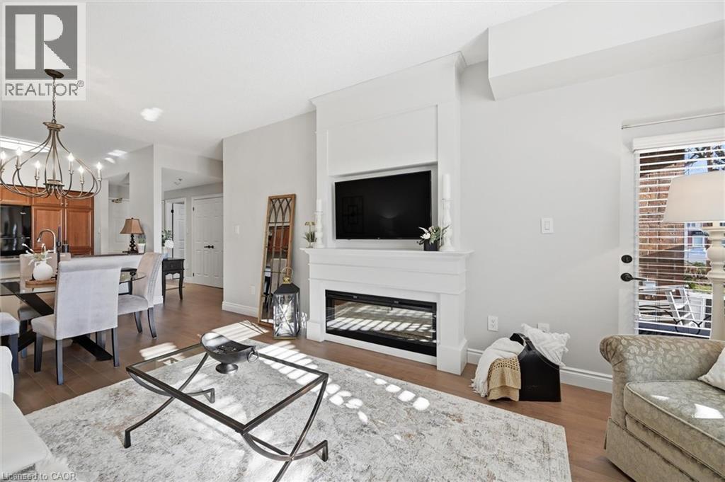 Beautifully updated 2 Bedroom, 2 Bathroom ground floor suite in The Dovercourt offering 1,186 sq ft of bright, functional living space with a private west facing terrace. This thoughtfully upgraded unit features new maple engineered hardwood flooring throughout, upgraded baseboards, modern black door hardware & a sleek electric fireplace with custom mantle. Fresh neutral paint throughout creates a clean, modern feel. The kitchen offers granite counters, upgraded lighting & generous cabinetry including a large pantry with custom pullout drawers designed for maximum organization and ease of access. The open concept living & dining area is filled with natural light from oversized west facing windows & walks out to a private terrace, perfect for relaxing or entertaining. Designed with comfort & ease in mind, the unit features 32 inch doorways & a spacious layout that allows for excellent flow throughout. Thoughtful storage has been incorporated into every closet, maximizing functionality without sacrificing space. A separate laundry room adds rare convenience along with additional storage, a feature not often found in condo living. The main bathroom has been updated with a new vanity & refreshed jetted tub, while the primary bedroom offers excellent closet space, a private ensuite & plenty of room for your favourite hobby, whether it’s puzzles, sewing, or a serene space for your morning yoga. Includes 2 parking spaces and 1 storage locker. One above ground parking space is ideal for quick trips or overnight guests. The second underground space is conveniently located close to the elevator with a 4ft x 9ft locker directly behind it for convenient everyday access. Well maintained low rise building in a prime Burlington location close to the GO Station, QEW, Royal Botanical Gardens, Burlington Golf & Country Club & everyday amenities. An exceptional opportunity for those seeking space, privacy, accessibility & convenience in a sought after community. (id:64974)
