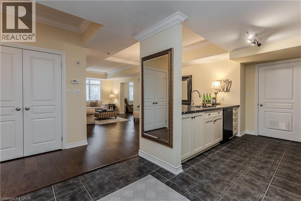 ?Welcome to this beautifully designed condo in The Dovercourt, a well-maintained low-rise building nestled in the sought-after Aldershot community. Offering one of the larger custom layouts in the building, this customized suite blends space, functionality, and style in a prime location—just mins to the GO Station, QEW, Royal Botanical Gardens, Burlington Golf & Country Club, and everyday amenities. Step inside to discover a bright and inviting open-concept layout, with hardwood flooring throughout the main living areas. The kitchen is a true focal point, featuring quartz countertops, an oversized breakfast bar perfect for casual dining or gathering with guests, a stylish tile backsplash, black stainless steel appliances, and ample cabinetry to meet all your storage needs. Overlooking the main living space, it connects beautifully to the dining and living areas. The spacious living room is filled with natural light and showcases a tray ceiling with a beam accent, along with walkout access to a private balcony. A versatile den offers the potential to convert into an additional bedroom, while a separate home office with French doors provides the ideal work-from-home setup. The primary bedroom is generously sized and designed as a private retreat, complete with dual closets and a well-appointed 3-piece ensuite featuring an oversized granite vanity and a walk-in shower. A second bedroom also offers direct access to the balcony, creating a bright and airy space for family or guests. A 4-piece main bathroom adds further convenience. Additional features include a storage locker and two parking spaces—one underground and one surface. Residents enjoy access to a party/media room within this well-managed building. This is a rare opportunity to own a spacious, move-in-ready condo with a flexible layout in one of Burlington’s most convenient and connected locations—perfect for professionals, downsizers, or those seeking low-maintenance living without compromising on space. (id:64974)