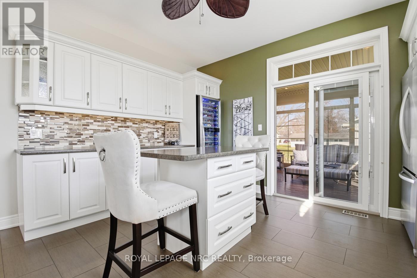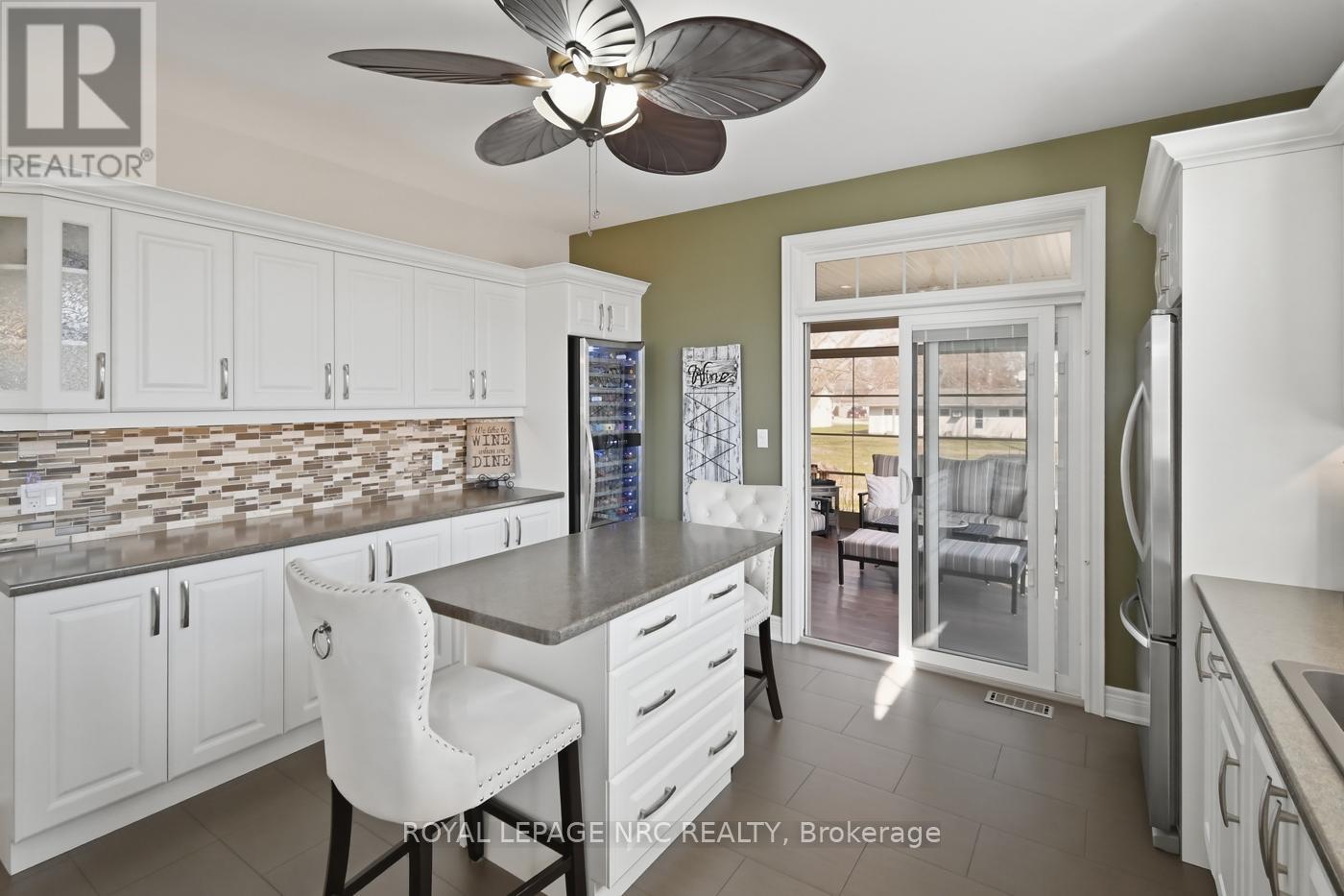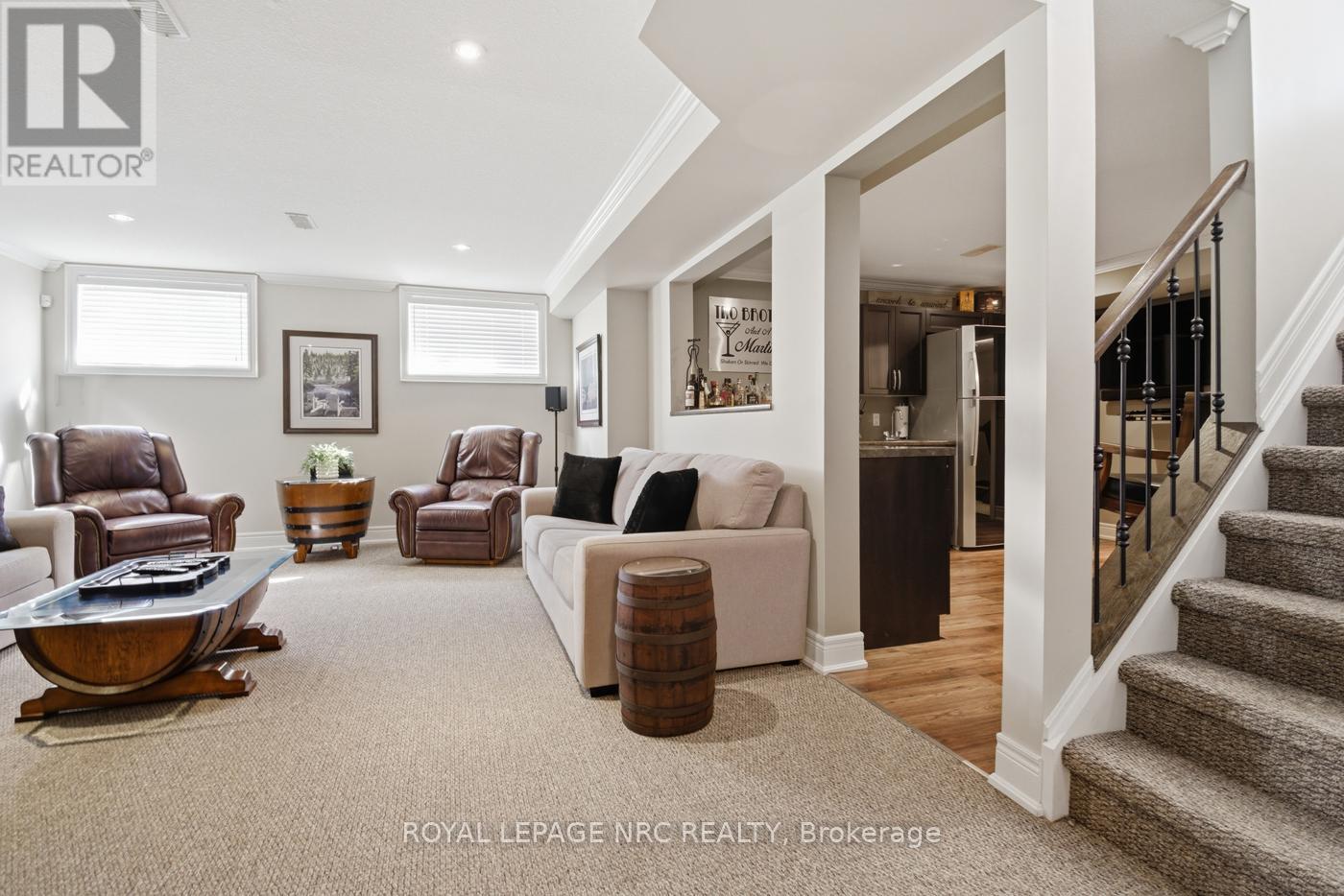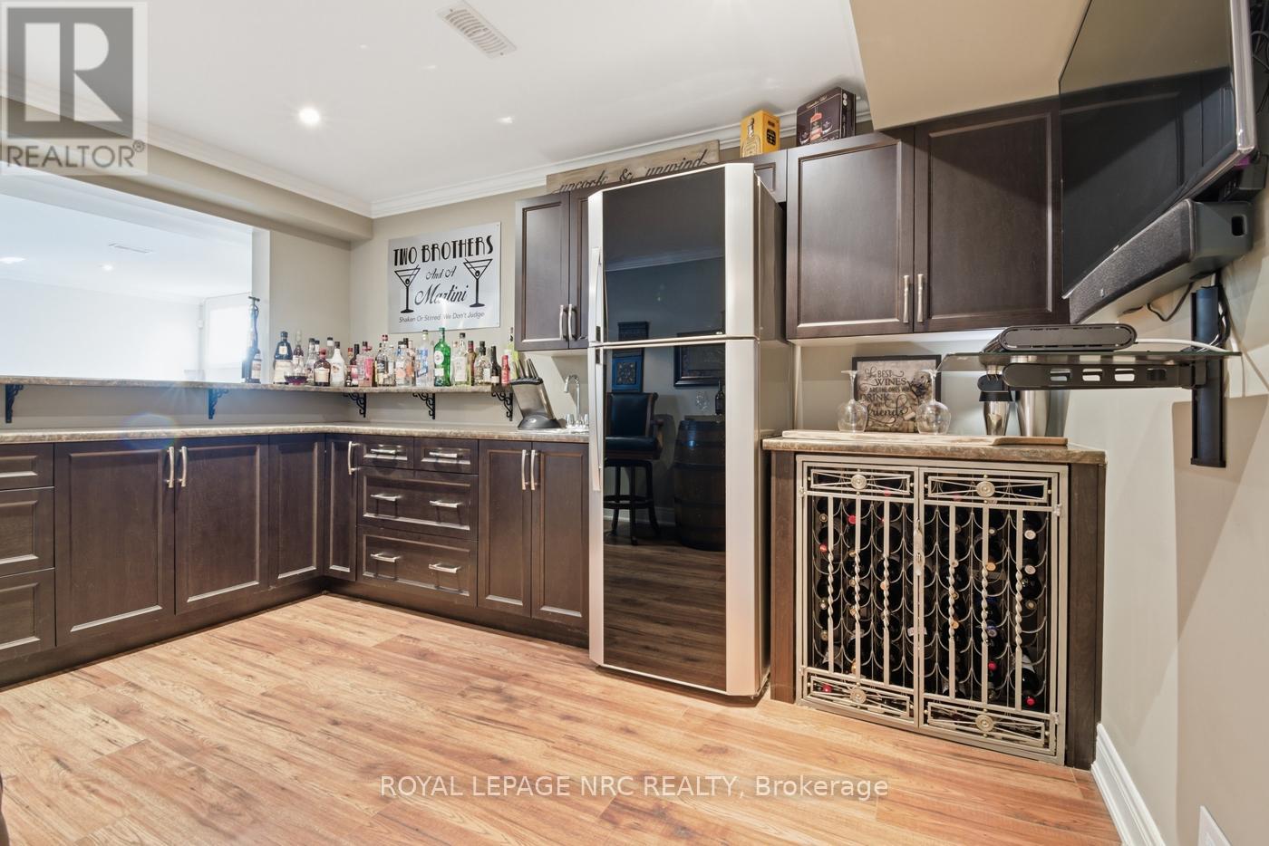 Prepare to be captivated by this stunning, professionally-appointed 3-bedroom, 3-bathroom bungalow, offering a truly luxurious and turnkey lifestyle.The main floor boasts high-end finishes, including exquisite crown molding, elegant engineered hardwood, and upgraded rod iron stair railings with integrated lighting. The magnificent chef's kitchen is a culinary dream, featuring a gas stove, large island, and a show-stopping illuminated 160-bottle wine fridge. Enjoy seamless indoor-outdoor living from the spectacular three-season sunroom (prewired for sound/TV, speakers/blinds included), which leads to a private, beautifully appointed rear yard sanctuary. This outdoor oasis features a hot tub area (with box, LED pathway lighting, and fire-retardant blankets) and a charming fire pit area for added ambiance. The main floor is completed by a primary suite with a walk-in closet and beautiful ensuite, a large second bedroom, a second four-piece bath, main floor laundry, and elegant California shutters throughout. Modern convenience is ensured with complete Ethernet jacks, an integrated cell signal booster, and an internet access point. The fully finished basement is an entertainer's dream, built on a dry core subfloor. It features a welcoming rec room pre-wired for 6.1 surround sound and a custom-built designer bar room with a full-size bar fridge and dimmer-controlled pot lights. The lower level also includes a third bedroom, a third bathroom, and a generous gym area, alongside tons of storage. The exterior offers professionally landscaped perennial gardens, a 6-zone app-remote irrigation system, an aggregate driveway, and an attached double car garage. Inclusions abound, such as a gas BBQ/bib, a large lion head garden urn, and professional lawn/fertilizer services paid for 2026. Close to walking trails, beaches, the casino, and wineries, this home delivers tranquility and entertaining at its best. This is more than a home; you are buying a lifestyle. Check out inclusions. (id:64974)