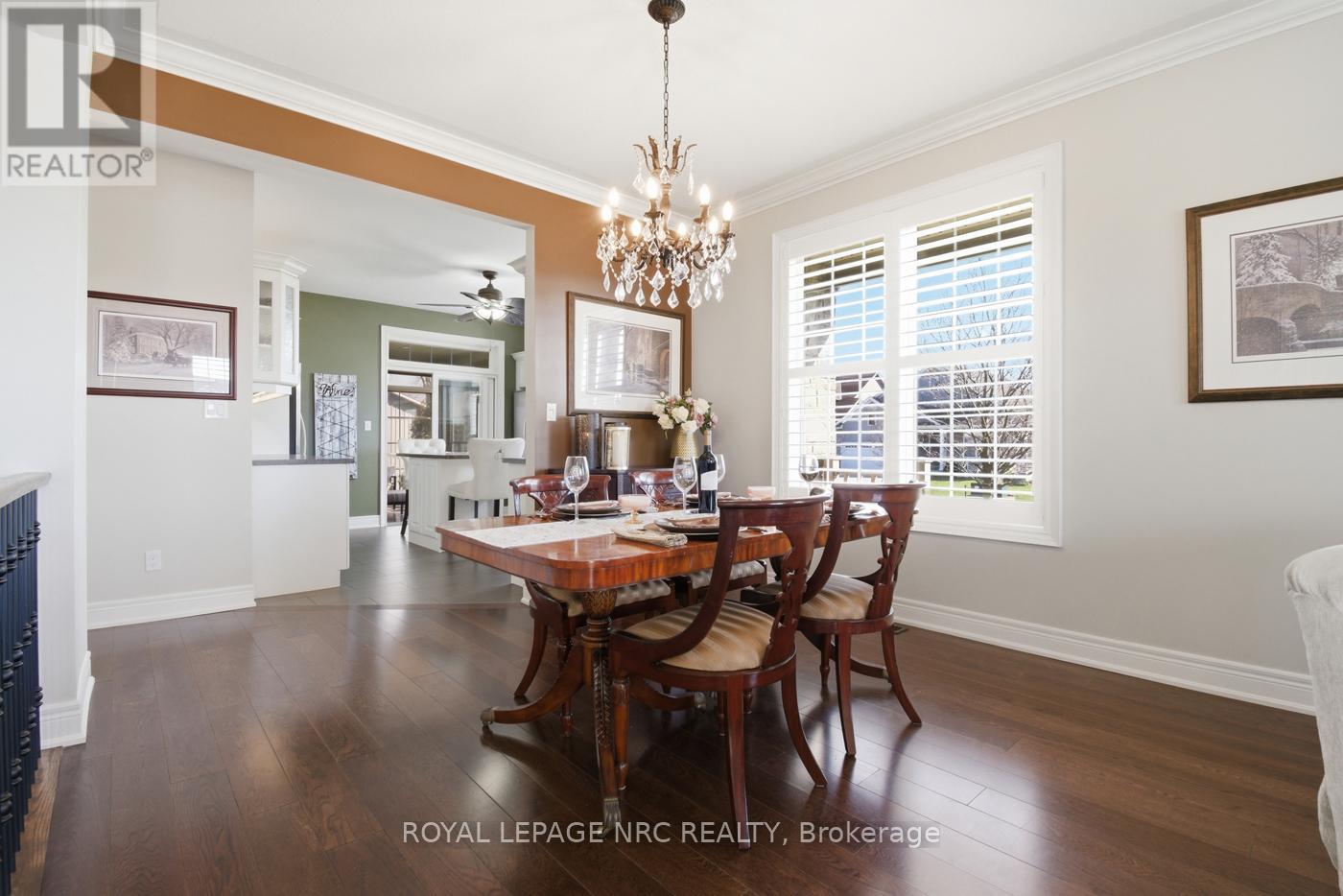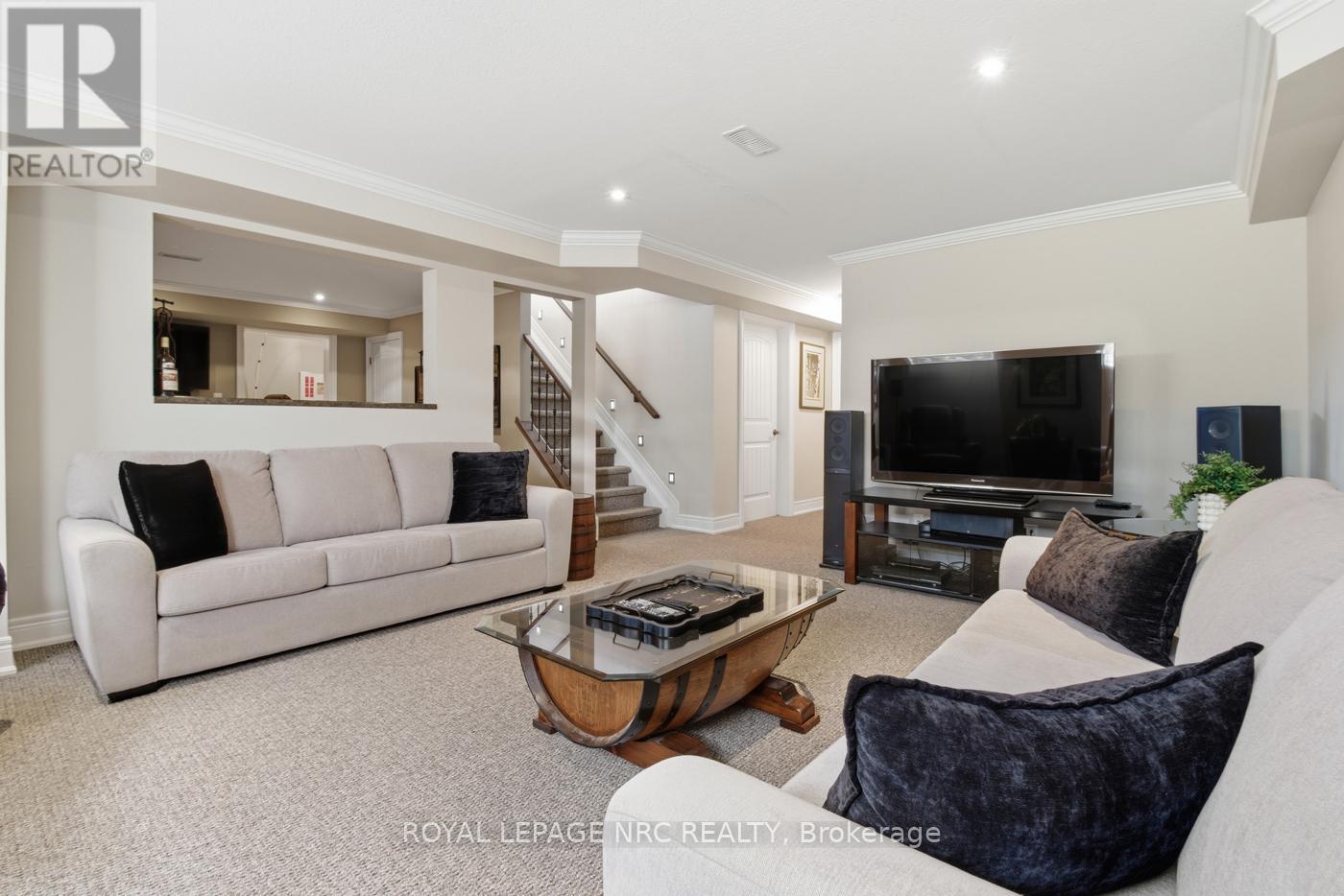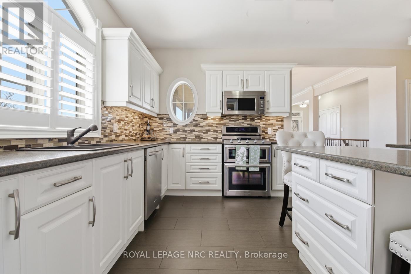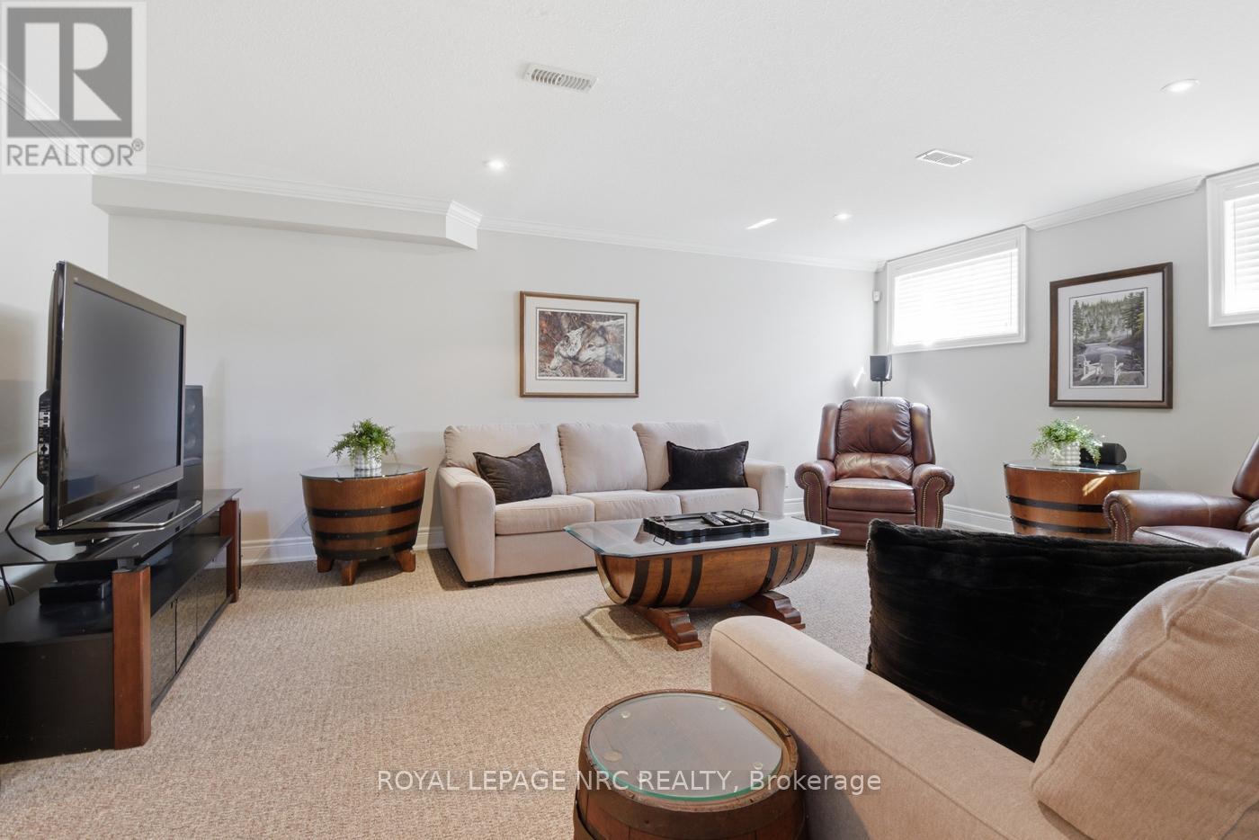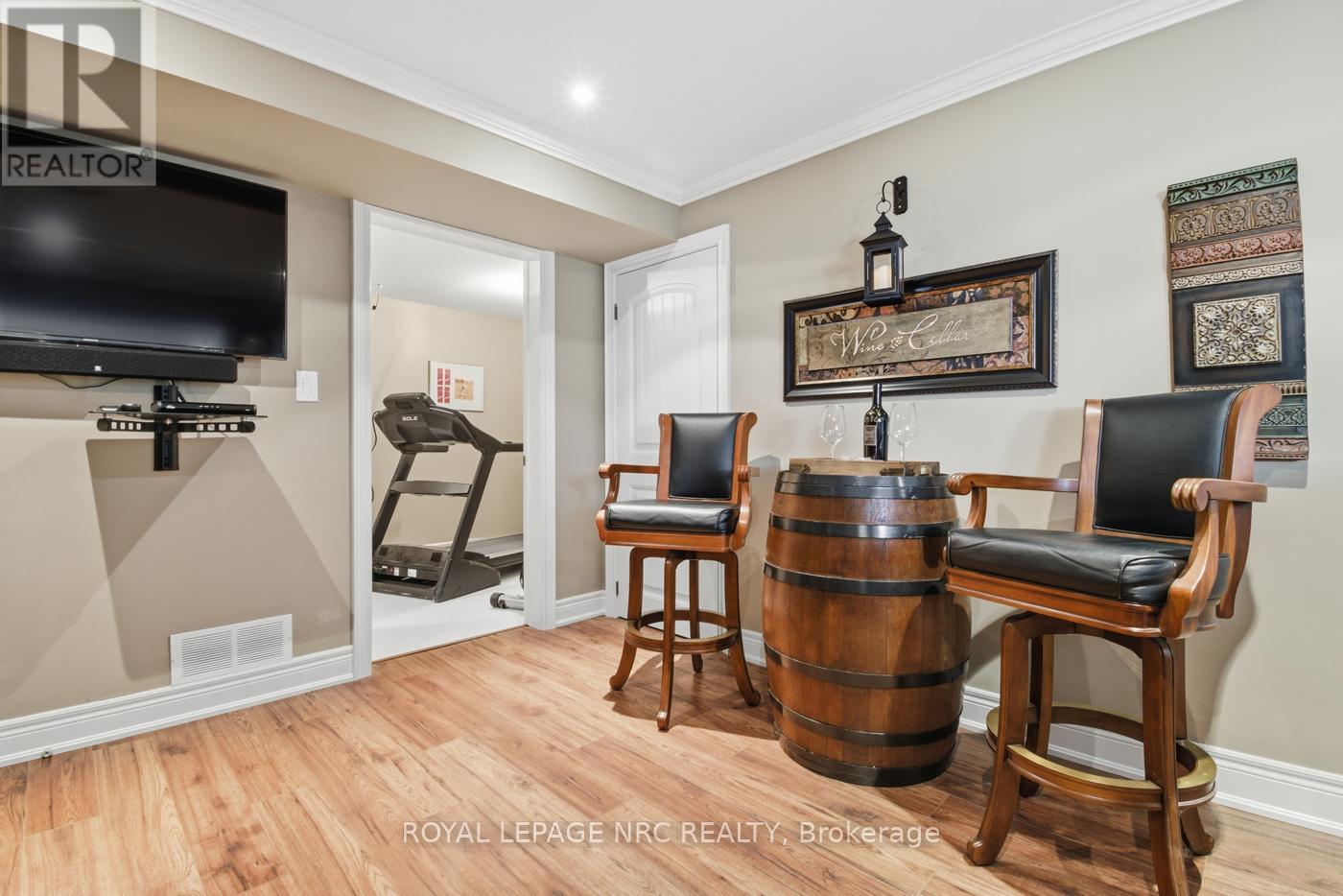 Prepare to be captivated by this stunning, professionally-appointed 3-bedroom, 3-bathroom bungalow, offering a truly luxurious and turnkey lifestyle.The main floor boasts high-end finishes, including exquisite crown molding, elegant engineered hardwood, and upgraded rod iron stair railings with integrated lighting. The magnificent chef's kitchen is a culinary dream, featuring a gas stove, large island, and a show-stopping illuminated 160-bottle wine fridge. Enjoy seamless indoor-outdoor living from the spectacular three-season sunroom (prewired for sound/TV, speakers/blinds included), which leads to a private, beautifully appointed rear yard sanctuary. This outdoor oasis features a hot tub area (with box, LED pathway lighting, and fire-retardant blankets) and a charming fire pit area for added ambiance. The main floor is completed by a primary suite with a walk-in closet and beautiful ensuite, a large second bedroom, a second four-piece bath, main floor laundry, and elegant California shutters throughout. Modern convenience is ensured with complete Ethernet jacks, an integrated cell signal booster, and an internet access point. The fully finished basement is an entertainer's dream, built on a dry core subfloor. It features a welcoming rec room pre-wired for 6.1 surround sound and a custom-built designer bar room with a full-size bar fridge and dimmer-controlled pot lights. The lower level also includes a third bedroom, a third bathroom, and a generous gym area, alongside tons of storage. The exterior offers professionally landscaped perennial gardens, a 6-zone app-remote irrigation system, an aggregate driveway, and an attached double car garage. Inclusions abound, such as a gas BBQ/bib, a large lion head garden urn, and professional lawn/fertilizer services paid for 2026. Close to walking trails, beaches, the casino, and wineries, this home delivers tranquility and entertaining at its best. This is more than a home; you are buying a lifestyle. Check out inclusions. (id:64974)