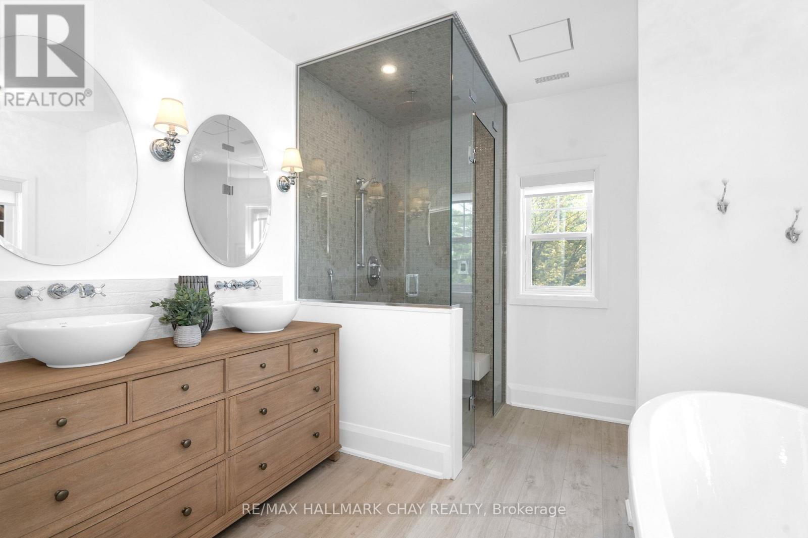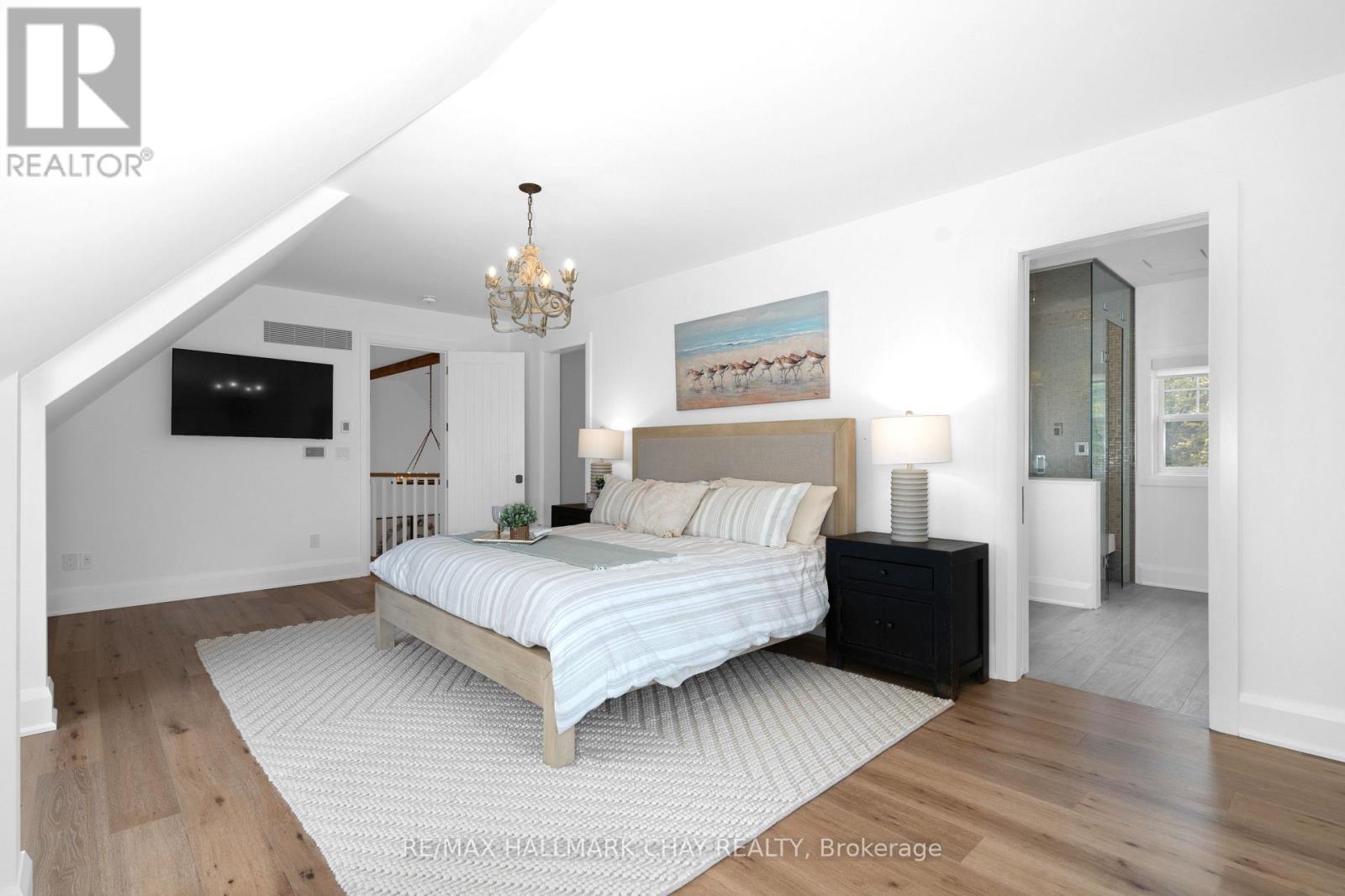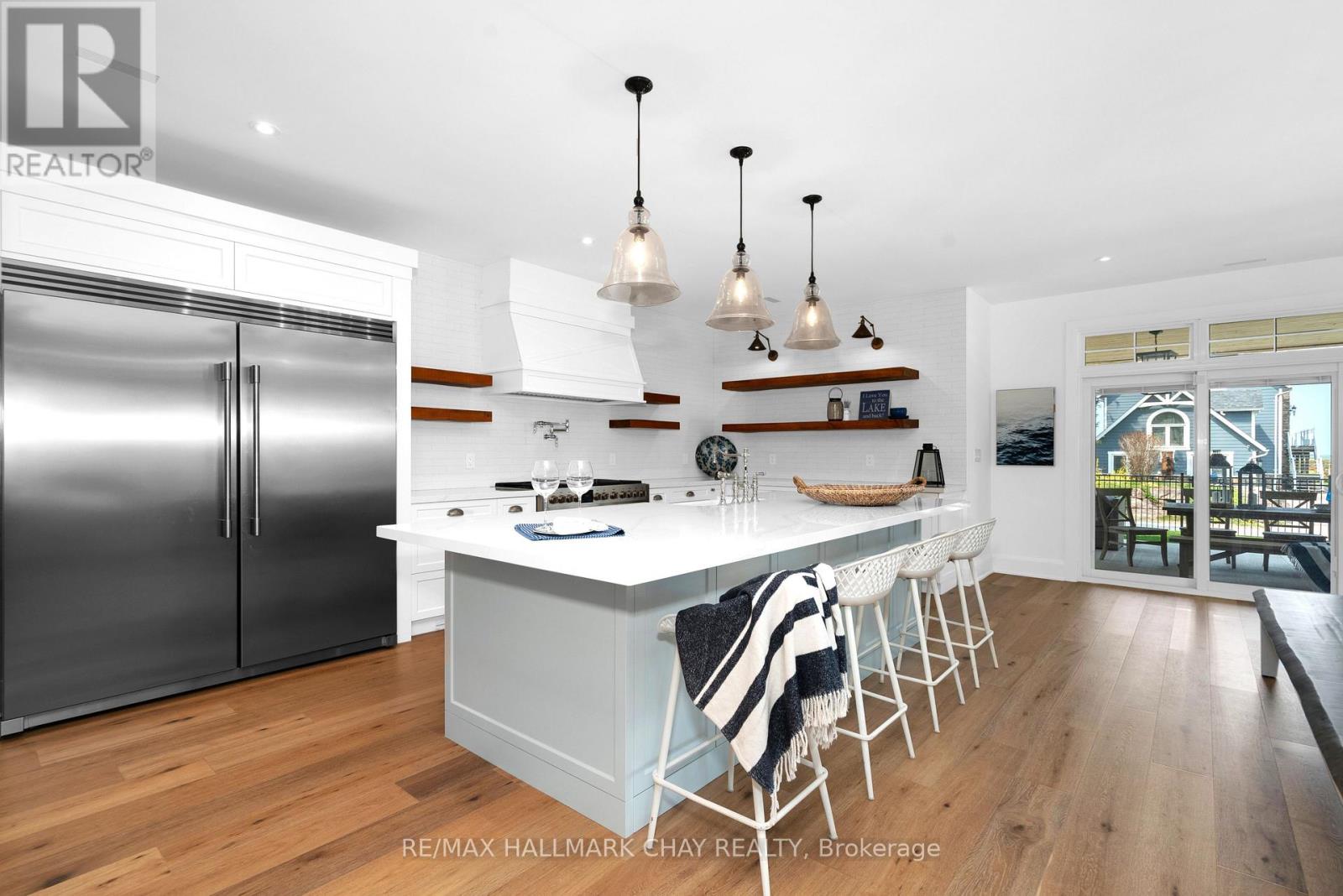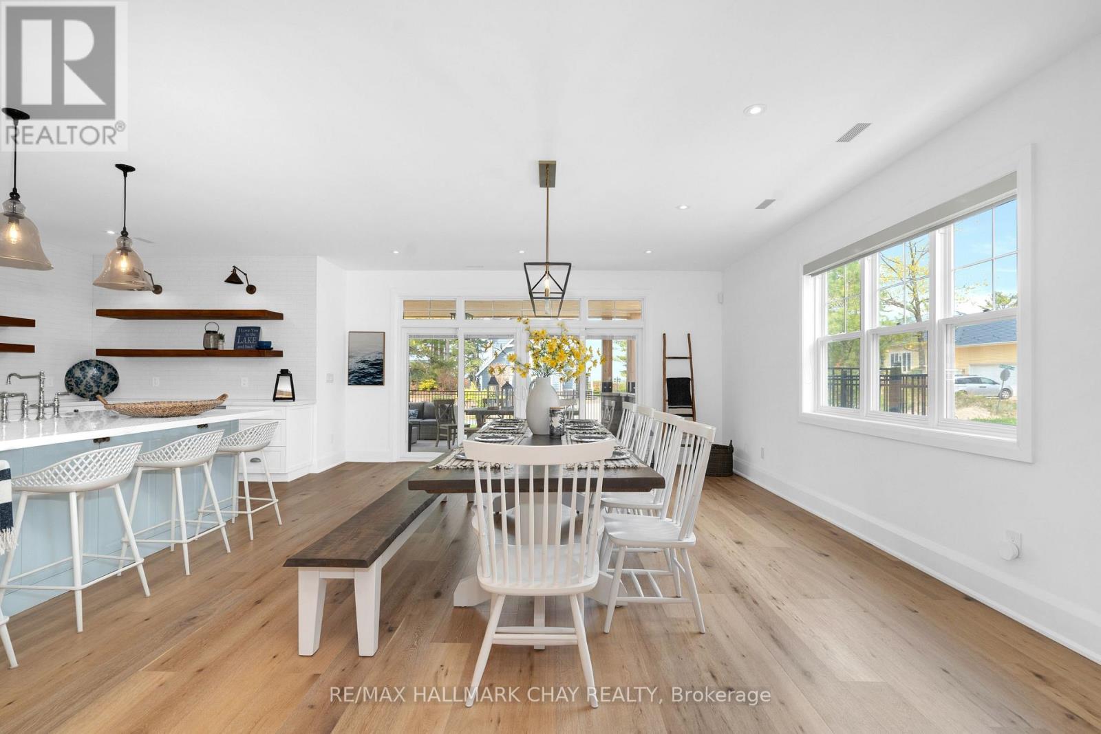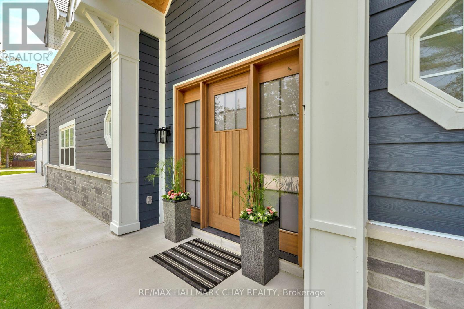 Impressive waterfront living on the shores of Georgian Bay with a westerly view to the water! This newer custom-built home exudes outstanding craftsmanship and superior quality finishes throughout. A thoughtful open concept design creates an ideal beach house retreat within a one minute walk to the sandy shores. Exceptionally well constructed. Over 4,400 sq ft with 4 bedrooms and 4 1/2 baths. Luxury kitchen offers quartz countertops with heated island top and high-end stainless appliances. The dining area provides ample space for the largest of gatherings. Walk-out to a large covered patio with outdoor gas fireplace, BBQ garage w/exhaust fan, and sunset views. The great room boasts soaring ceilings and an oversize gas fireplace with rustic timber mantel. 8 inch oak plank hardwood flooring thru-out. Heated floors. The second level offers a private primary suite with large W/I closet, gorgeous ensuite with steam shower and clawfoot tub and walk-out to secluded covered deck. At the opposite end of the upper hallway are 3 huge family/guest bedrooms each with their own ensuite. Every detail has been considered. ADDITIONAL FEATURES: Triple garage w/heated floor, Outdoor shower room, Full monitored security system, Inground sprinklers, Heated concrete driveway and sidewalks, Tile roof, Spray foam insulation, Gas and water line for outdoor kitchen. Stunning home or cottage within 5 min of Wasaga amenities. Truly a must see! (id:64974)