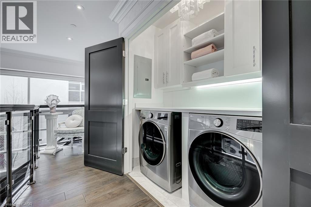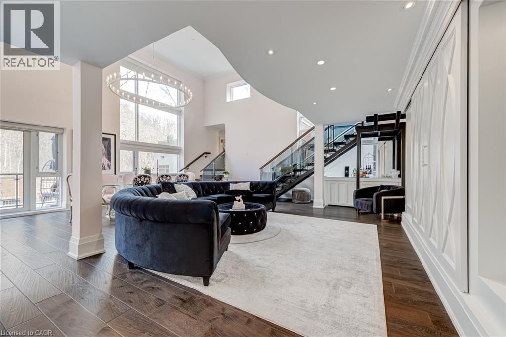Stunning luxury at the District Lofts! Circa 1929 this boutique building was completely rebuilt in 2013 offering only 44 unique units. Unit 215 is one of the largest two units offering a rare opportunity for the discerning buyer. An over-sized double-car garage and a private entrance make it feel like living in a home without the exterior maintenance. Enjoy the grandeur of this loft style 2-storey condo. A spectacular open living space filled with natural light offers a 17-ft ceiling highlighted by a dramatic Restoration Hardware chandelier and breathtaking views of the Dundas Peak. The stunning gourmet kitchen has extended height cabinetry, high-end appliances, quartz counters and a large island with seating for six. This unit offers two spacious bedrooms and two spa-like bathrooms with upgraded fixtures. There are two private balconies, full-sized laundry, plenty of custom closet storage and fantastic upgrades: trim & millwork, Swarovski crystal handles and motorized blinds. The building offers state-of-the-art in-floor radiant heating and this unit has a brand-new a/c system. Amenities at the Lofts include a fitness studio, large locker exclusive to the unit, and a roof top patio for entertaining or relaxing (enjoy the views and tranquil sounds of the waterfall). Located at the foot of the Dundas Peak just steps to the Bruce Trail, Webster’s Falls, the Dundas Valley Golf and Curling Club and the historic Dundas downtown core with a vibrant mix of shops and restaurants. (id:64974)