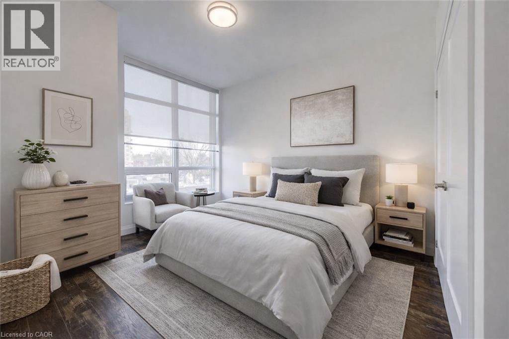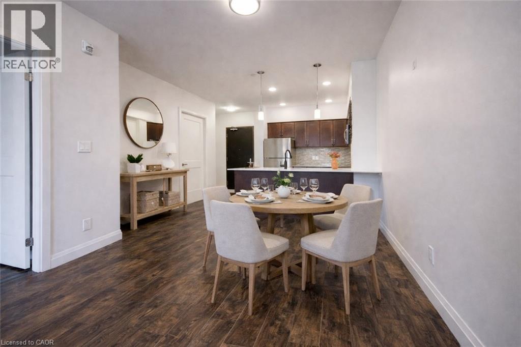 Welcome to urban living at its finest in this stylish 1-bedroom, 1-bath condo on the 4th floor of Kitcheners' sought-after Barra on Queen Condos! From the moment you step inside, the custom design and thoughtful upgrades set this unit apart. The modern kitchen boasts an extended island with seating, perfect for entertaining or enjoying your morning coffee. The open-concept layout flows seamlessly to a spacious living area and out to your private balcony with plenty of room for seating, an ideal spot to relax and soak in the view. The bathroom has been beautifully updated with a sleek walk-in shower, offering a modern and functional touch. Just off the entryway, a stylish barn door leads to the in-unit laundry, full-size machines and smart design that maximize space without sacrificing convenience. With your own parking spot and thoughtful layout throughout, this condo is designed for easy, everyday living. Enjoy amenities galore right at your doorstep: a fully equipped gym, bookable party room, outdoor BBQ space, guest suite and even a pet run for your four-legged friends. And the location? Absolutely dynamic steps to Victoria Park, the LRT, trendy restaurants, nightlife, shops, public transit, and all of Downtown Kitcheners' best festivals and events. Whether you're a first-time buyer, investor, or downsizer, this condo checks all the boxes for modern city living. Don't miss your chance to call this stylish space home! (id:64974)
