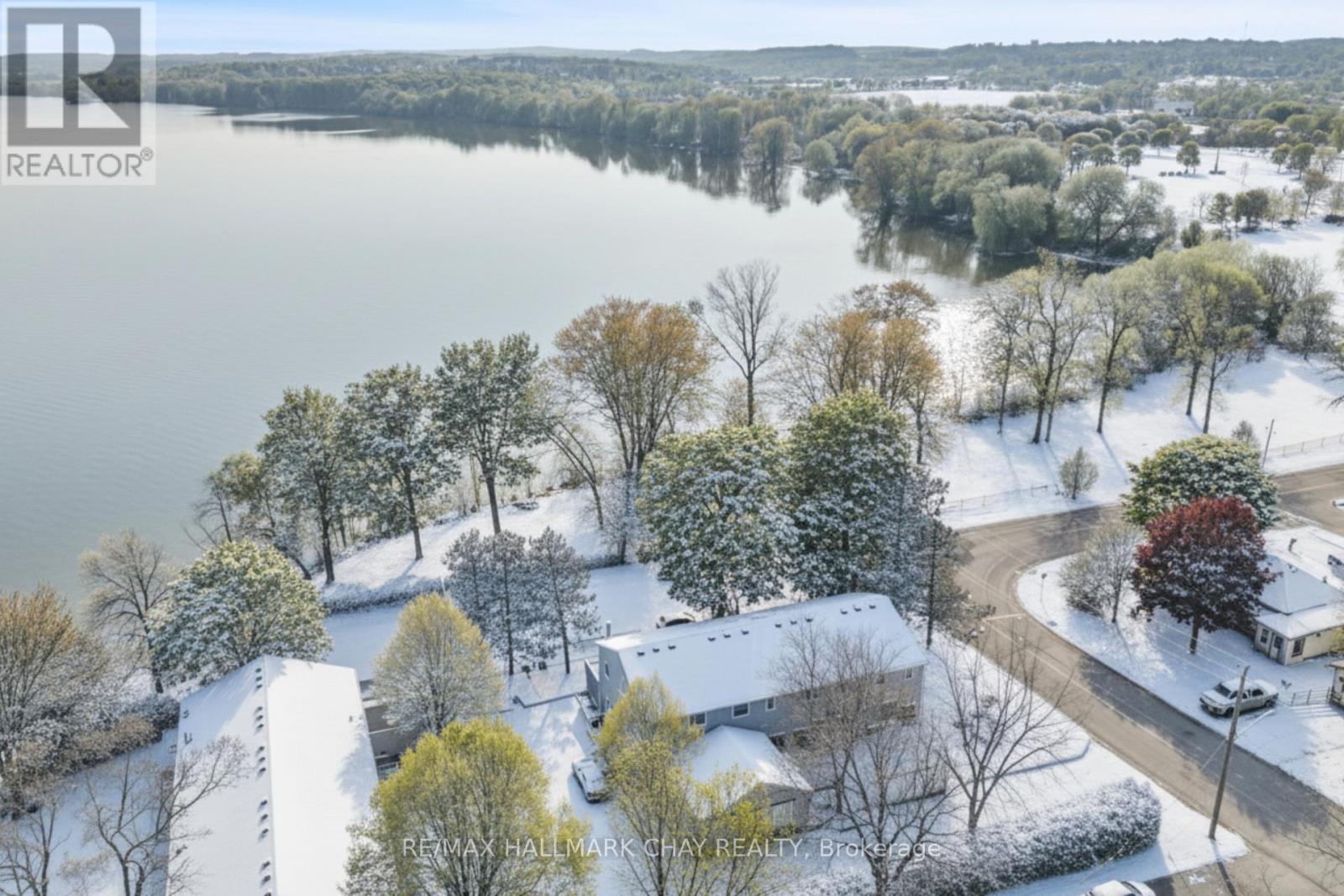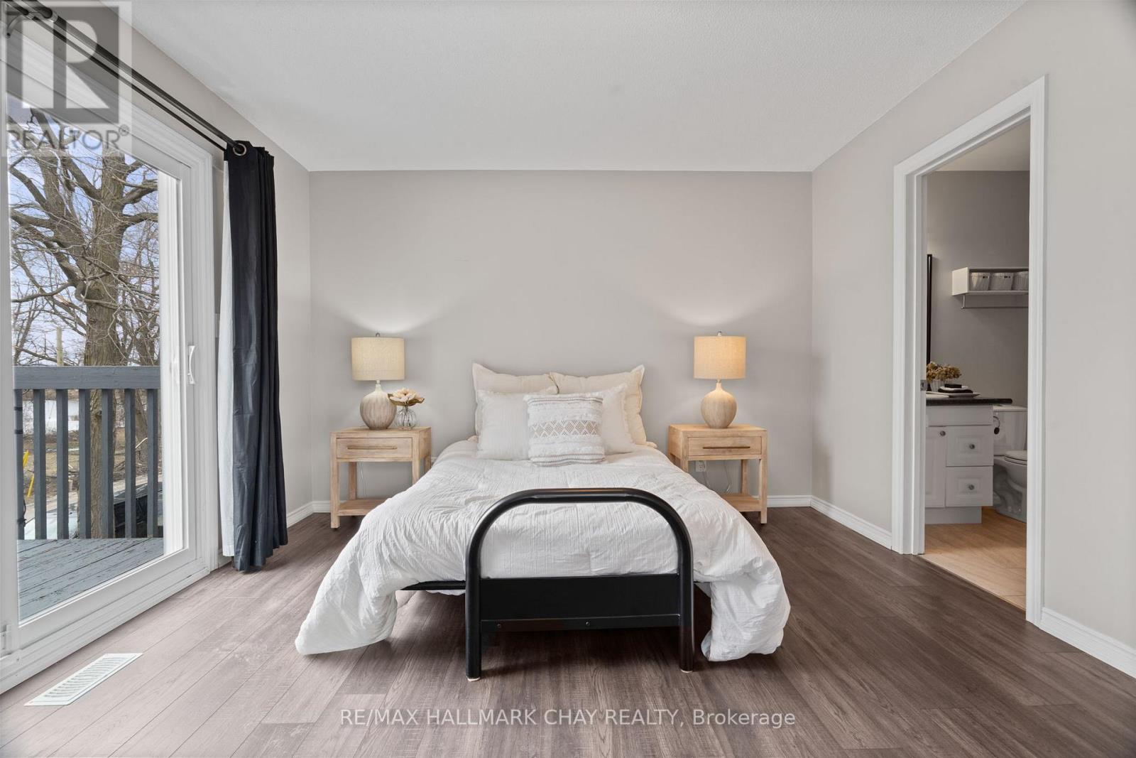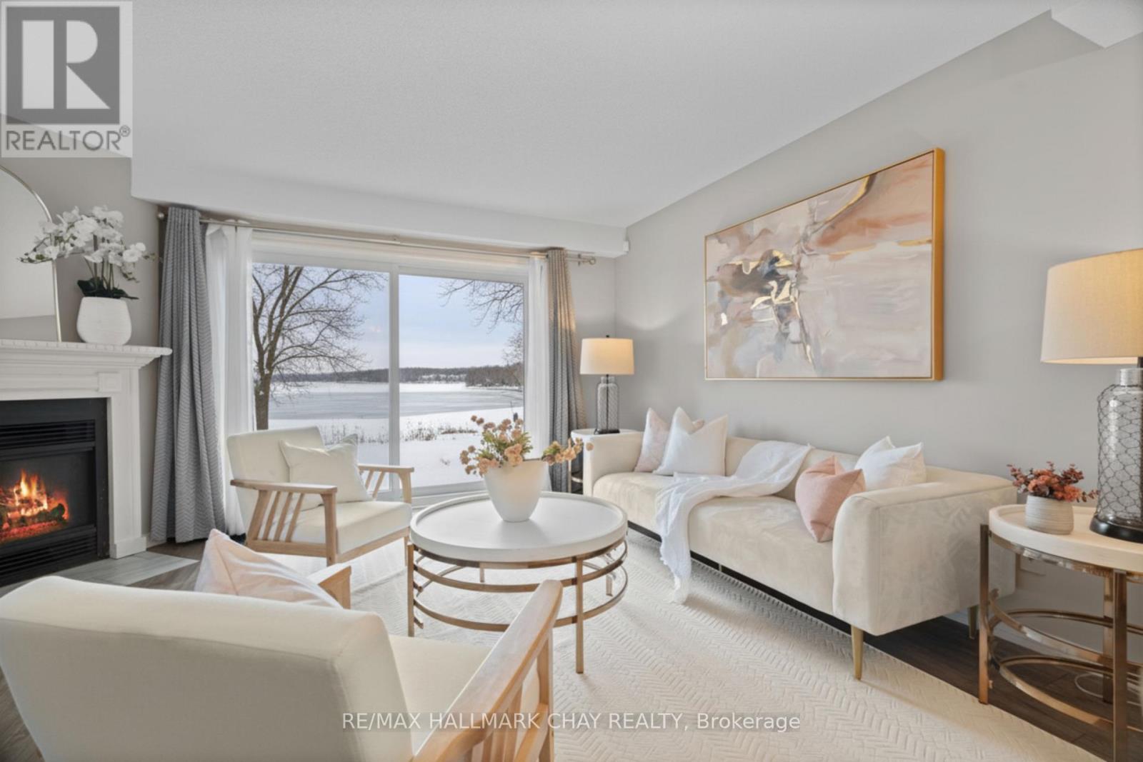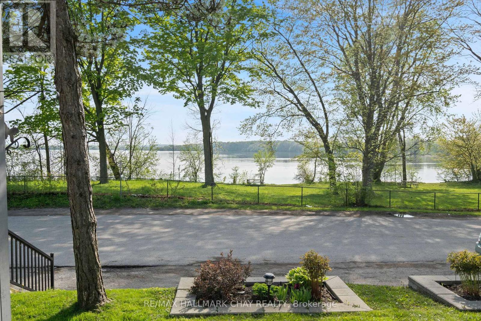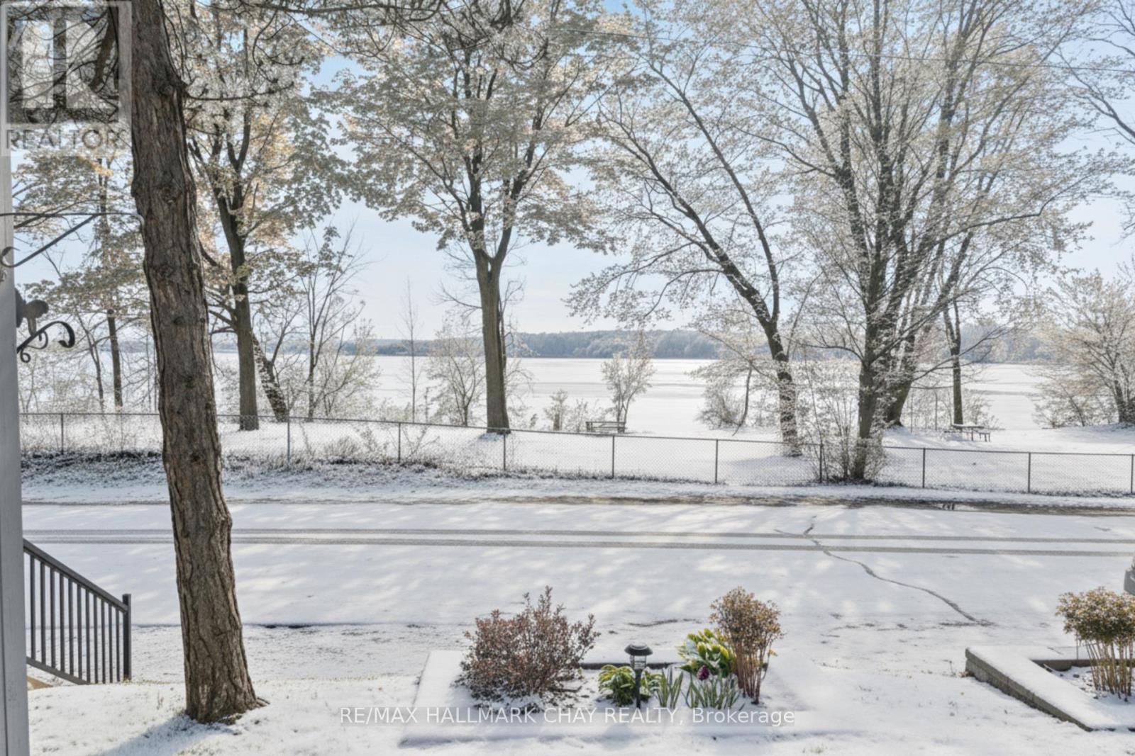 Welcome to this beautifully upgraded end-unit townhouse condo with views of Lake Simcoe-a perfect fit for anyone seeking a peaceful, low-maintenance lifestyle. With stunning western views of Lake Simcoe, over $100,000 in thoughtful renovations, and a low-maintenance lifestyle, this move-in-ready home is as serene as it is sophisticated-offering front-row seats to breathtaking sunsets every evening. Step inside to a spacious foyer with custom closet organizers and a well-designed layout throughout. The chef-inspired kitchen, fully renovated in 2017, features granite countertops, ceramic flooring, stainless steel appliances, and a functional breakfast bar with added storage.The open-concept living and dining area includes newer vinyl flooring, a cozy wood-burning fireplace, and sliding doors to your private deck. Enjoy quiet mornings or unwind under the electric awning while taking in sunset views, surrounded by raised flower beds and a secure gated enclosure.Residents enjoy access to a private dock-perfect for launching a paddleboard or kayak and embracing the waterfront lifestyle. Upstairs, both bedrooms offer new laminate flooring, and both bathrooms have been renovated. The primary suite features an electric fireplace, in-suite laundry, a renovated 2pc ensuite, large closet space, and a private balcony with lake views. The fully finished lower level adds even more versatility, with a spacious rec room finished in hardwood, a third full 3-piece bathroom, and extensive built-in cabinetry for smart storage. The attached garage includes a generous mezzanine loft, ideal for seasonal storage or hobbies.Set within an exclusive 9-unit waterfront complex, this home is directly across from Kitchener Park-25 acres of green space, tennis courts, a dog park, and scenic walking trails. You're also just minutes from marinas, shopping, downtown Orillia, and Casino Rama. (id:64974)