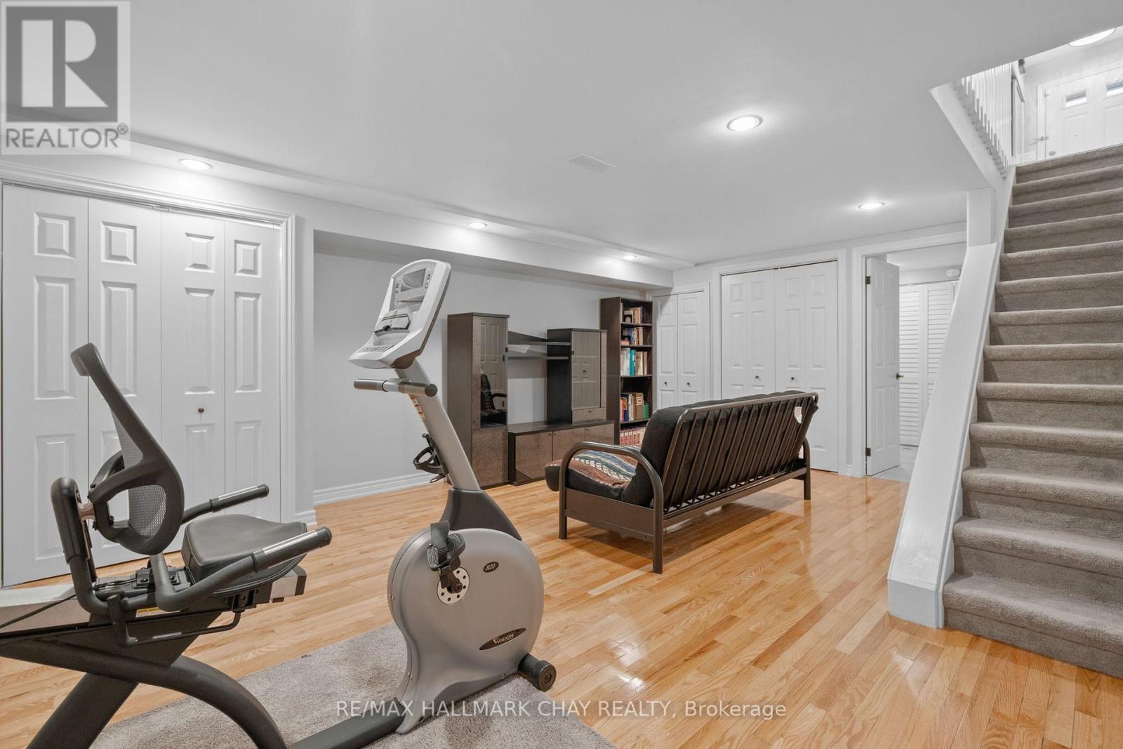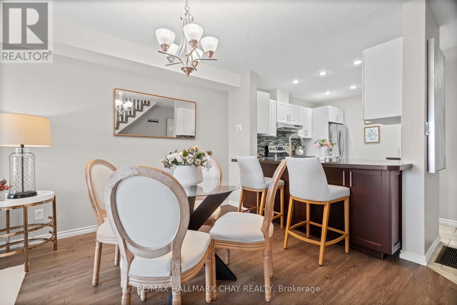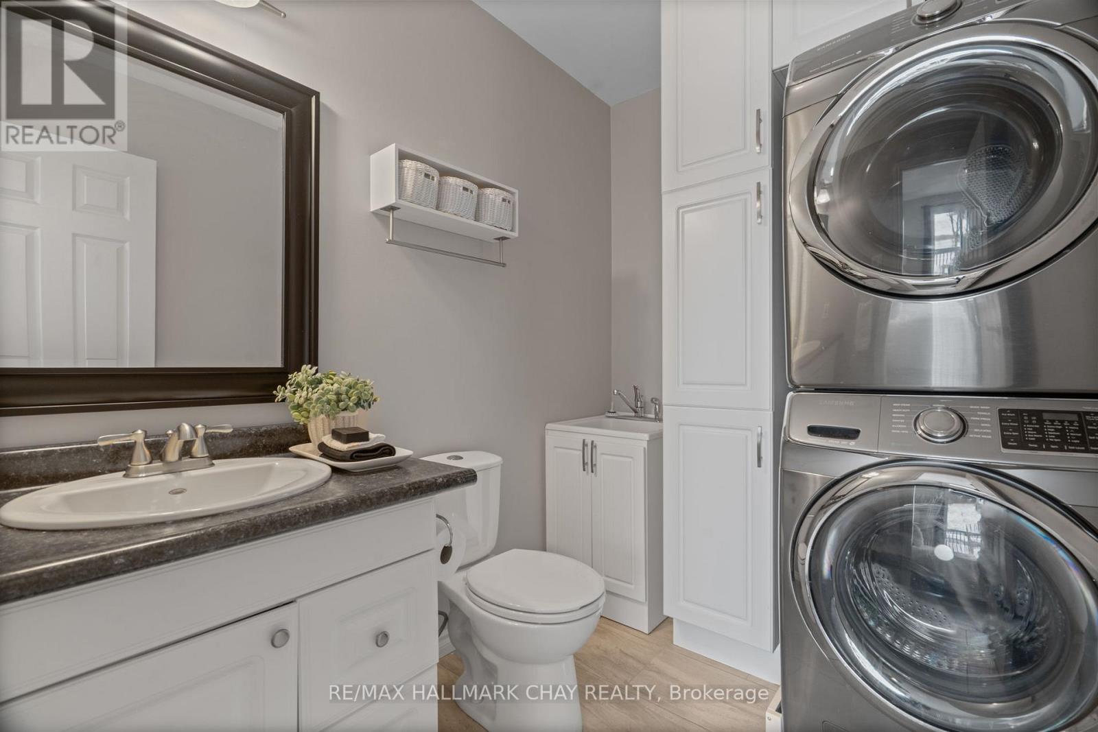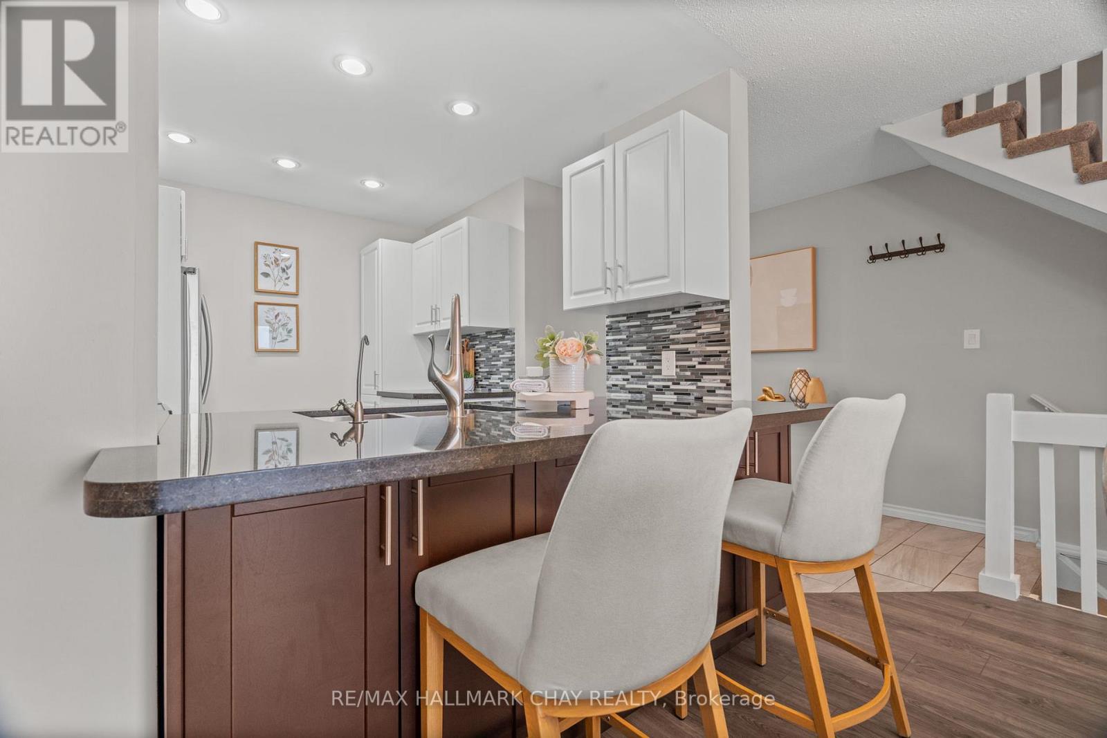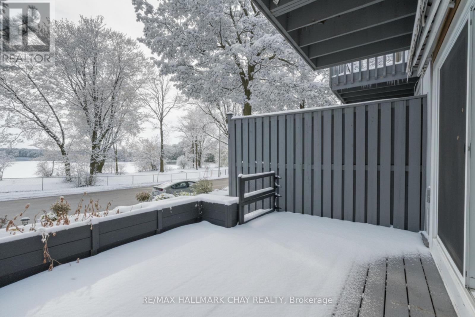 Welcome to this beautifully upgraded end-unit townhouse condo with views of Lake Simcoe-a perfect fit for anyone seeking a peaceful, low-maintenance lifestyle. With stunning western views of Lake Simcoe, over $100,000 in thoughtful renovations, and a low-maintenance lifestyle, this move-in-ready home is as serene as it is sophisticated-offering front-row seats to breathtaking sunsets every evening. Step inside to a spacious foyer with custom closet organizers and a well-designed layout throughout. The chef-inspired kitchen, fully renovated in 2017, features granite countertops, ceramic flooring, stainless steel appliances, and a functional breakfast bar with added storage.The open-concept living and dining area includes newer vinyl flooring, a cozy wood-burning fireplace, and sliding doors to your private deck. Enjoy quiet mornings or unwind under the electric awning while taking in sunset views, surrounded by raised flower beds and a secure gated enclosure.Residents enjoy access to a private dock-perfect for launching a paddleboard or kayak and embracing the waterfront lifestyle. Upstairs, both bedrooms offer new laminate flooring, and both bathrooms have been renovated. The primary suite features an electric fireplace, in-suite laundry, a renovated 2pc ensuite, large closet space, and a private balcony with lake views. The fully finished lower level adds even more versatility, with a spacious rec room finished in hardwood, a third full 3-piece bathroom, and extensive built-in cabinetry for smart storage. The attached garage includes a generous mezzanine loft, ideal for seasonal storage or hobbies.Set within an exclusive 9-unit waterfront complex, this home is directly across from Kitchener Park-25 acres of green space, tennis courts, a dog park, and scenic walking trails. You're also just minutes from marinas, shopping, downtown Orillia, and Casino Rama. (id:64974)