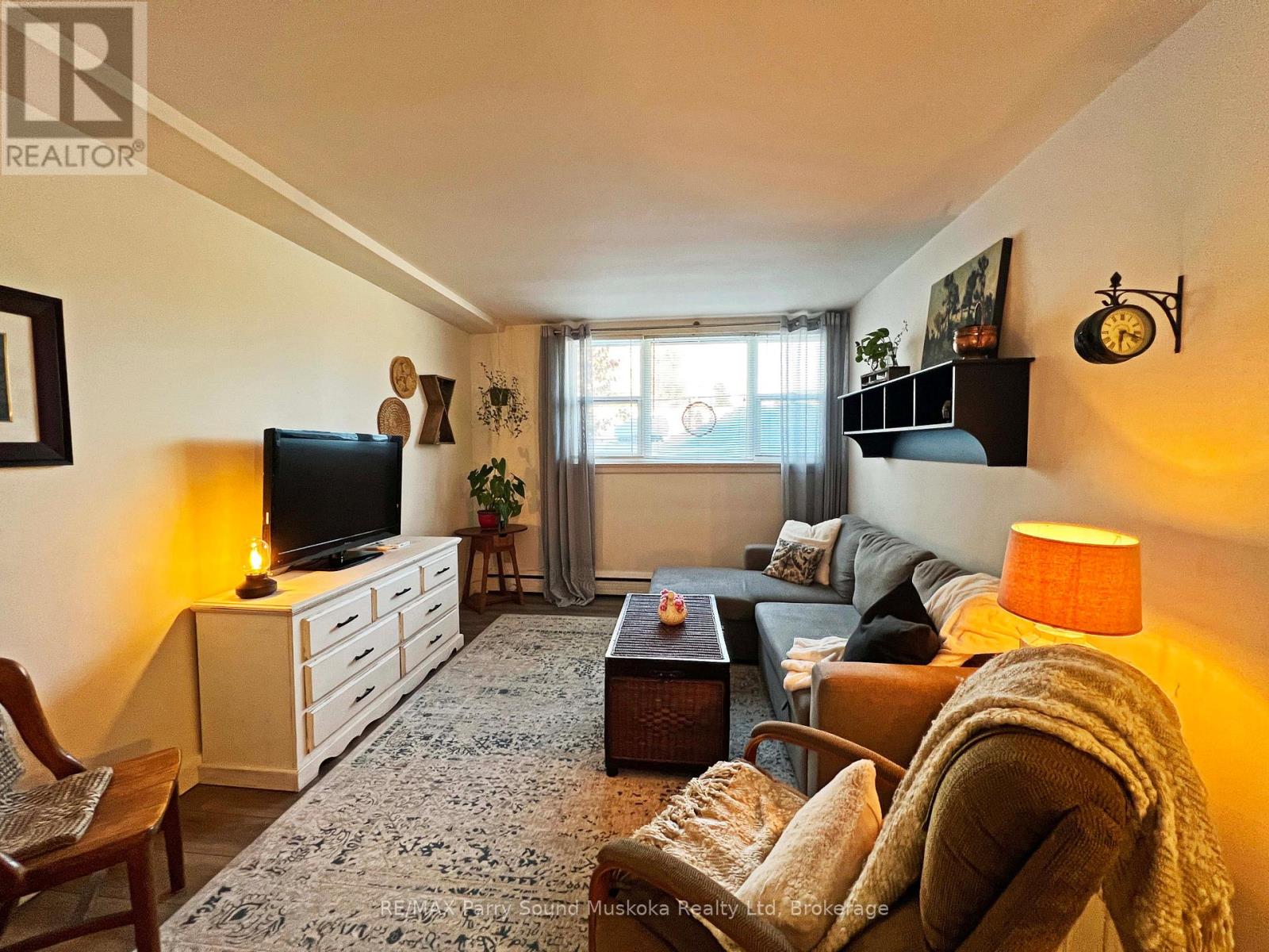 Beautifully Updated 2 bedroom first level condo, Large naturally bright windows, Featuring upgraded modern Kitchen, Updated 4 piece bath with new vanity & low flush toilet, Easy care laminate floors throughout, (only allowed on this level), Ideal layout opens from the the foyer to an open & bright living room, Separate dining area, Fully equipped kitchen boasts abundance of cabinetry & storage, New sink & countertop, Primary bedroom is large enough for a king size bed, double closets, 2nd bedroom offers closet & fold down desk, Ensuite storage room, Just a few steps from the main door and to the laundry room, Economical living - Low taxes, Condo fees include Heat, water & sewer, Walking distance to downtown Parry Sound, Shopping, Georgian Bay Beach & fitness trail! Home Sweet Home! (id:64974)