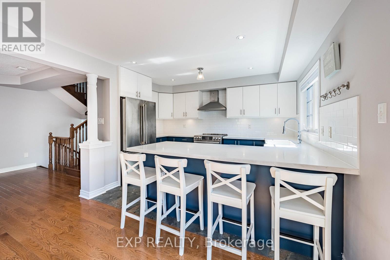 Stunning Renovated End-Unit Townhome With Low Maintenance Fees!! Located In The Britannia Oak Complex, Nestled In Streetsville. Features Hardwood Floors, Renovated Bathrooms Throughout, And A Modern Renovated Kitchen With Stainless Steel Appliances, Quartz Countertop, White Farm Sink, Breakfast Bar, And Crisp White Subway Tile Backsplash. The Kitchen Overlooks A Sun-Filled Breakfast Area With A Walkout To A Large Balcony Deck. The Living Room Includes Large Windows With Natural Light. The Dining Room Features Coffered Ceilings And A Brick Feature Wall. Hardwood Staircase Leads To The Upper Level With Three Generously Sized Bedrooms. The Primary Bedroom Includes A Large Double Closet And A 5 Piece Ensuite. Additional Features Include Rear Entrance, Inside Garage Access, And 3 Car Parking. Located In The Heart Of Streetsville, Known As "The Village In The City," This Property Is Just Minutes To Streetsville Go Station. Close To Schools, Parks, Credit River Trails, And Streetsville Village Shops, Cafes, And Restaurants. Easy Access To Highways 401, 403, And 407. (id:64974)