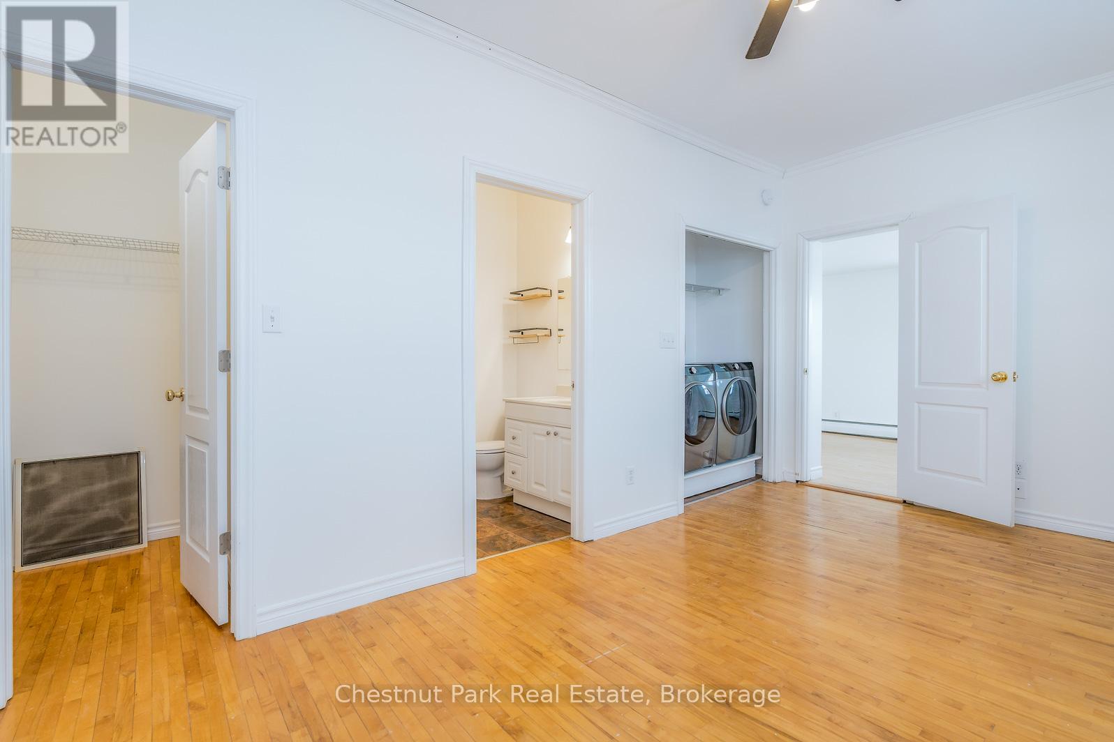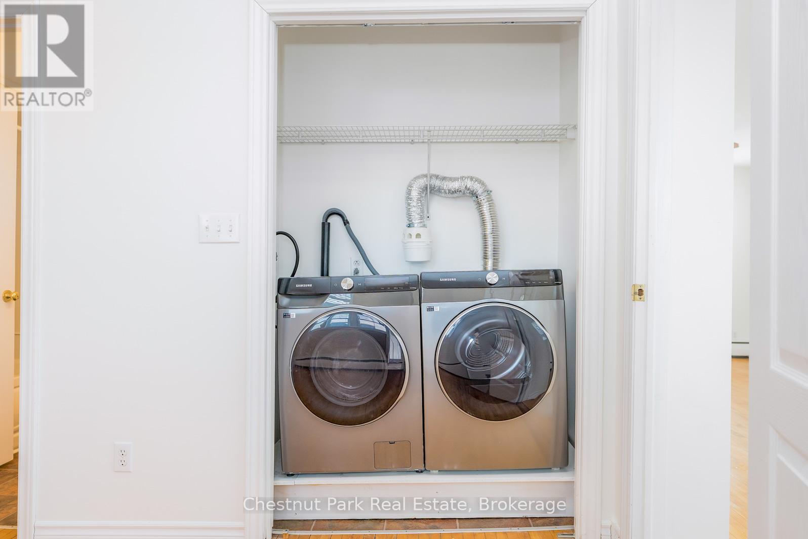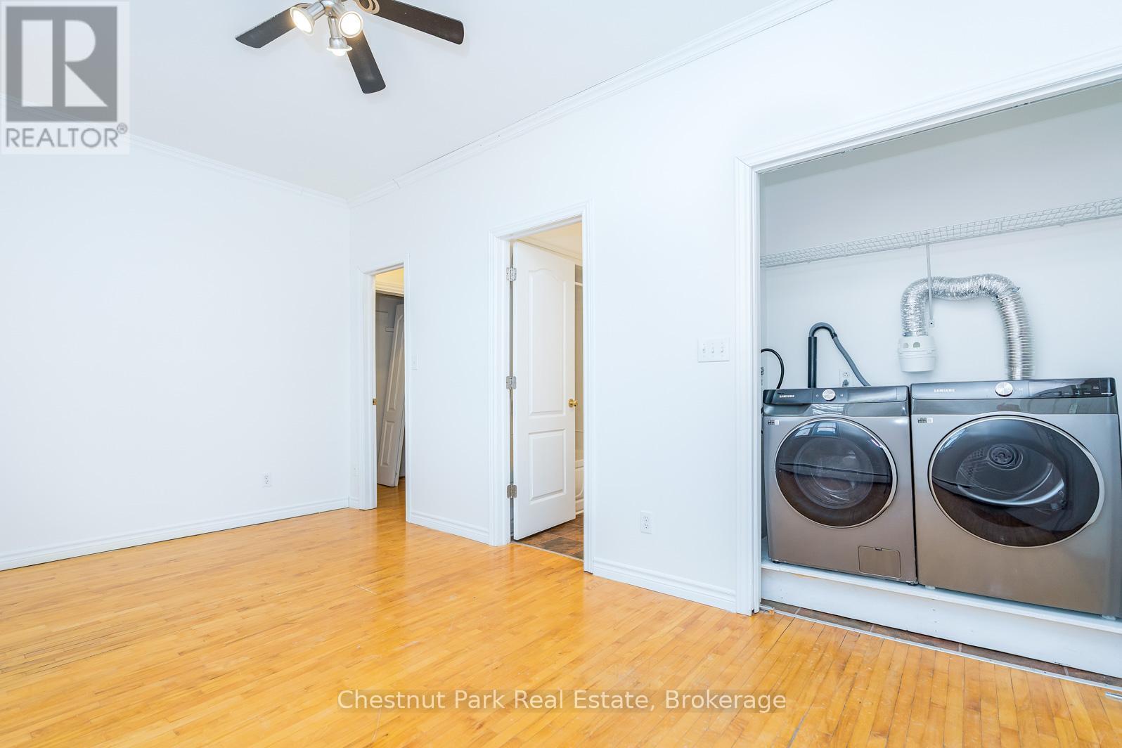 Attractive upper level one bedroom apartment available for an annual rental. Large bright living/dining area with hardwood floors. Approximately 600 sqft with an updated interior. Walk to downtown shops/restaurants, and trails. Ample parking included. Rent includes: Heat (gas hot water), Refrigerator, Stove, Washer, Dryer, and Parking. Tenant pays for Hydro, Water, Water Heater Rental. Non-smoking building. Pets restricted. Rental application with references, credit report, income verification, first and last months rent required at signing. Tenant to have liability insurance for lease term. Great location downtown Collingwood. (id:64974)