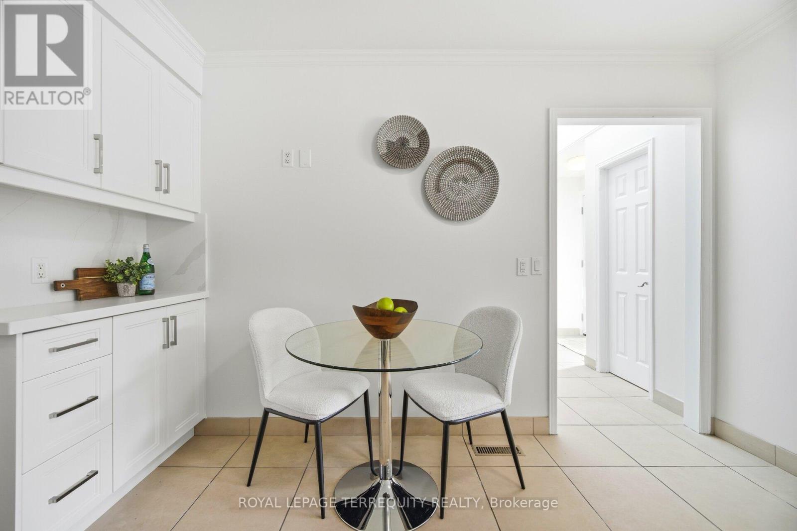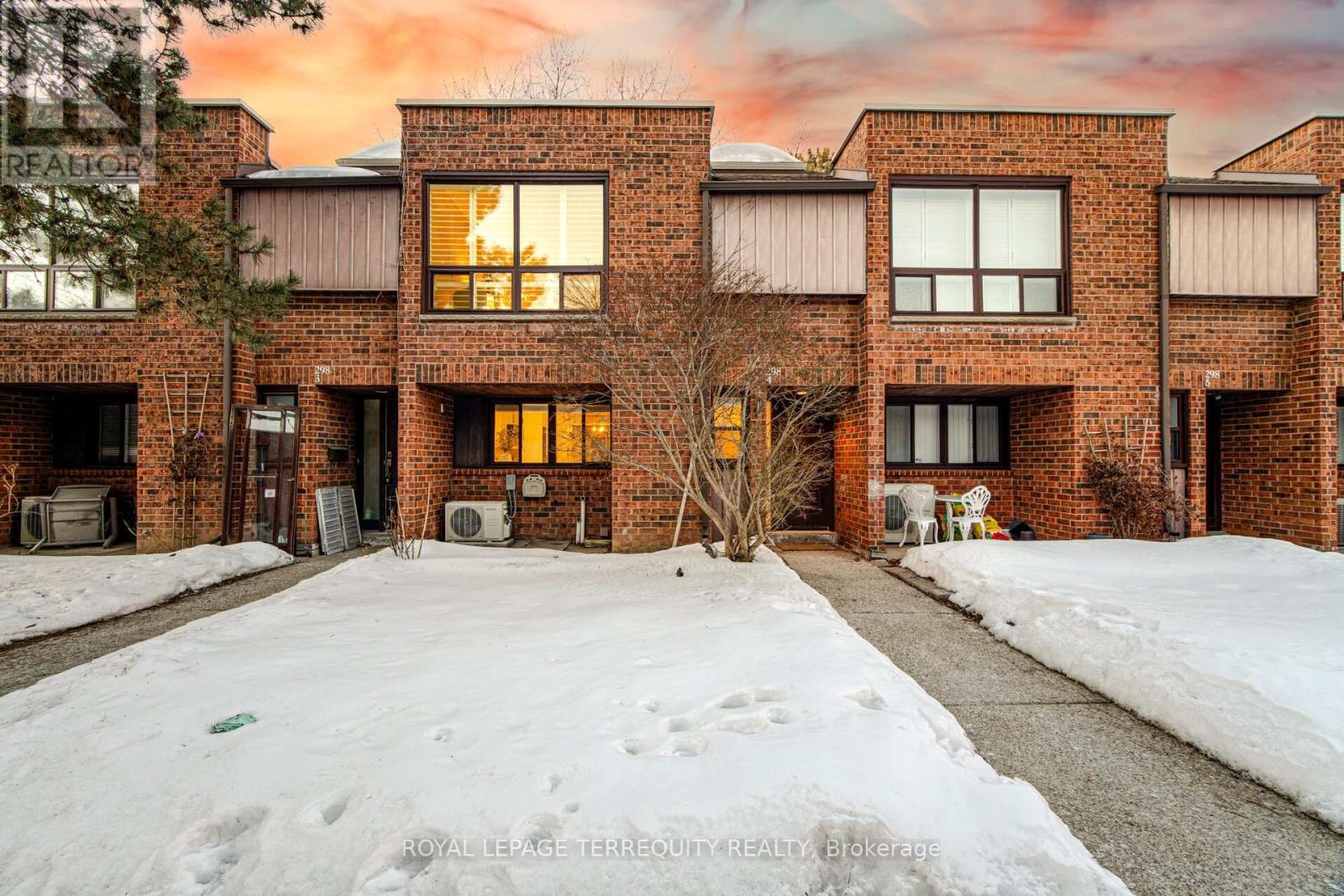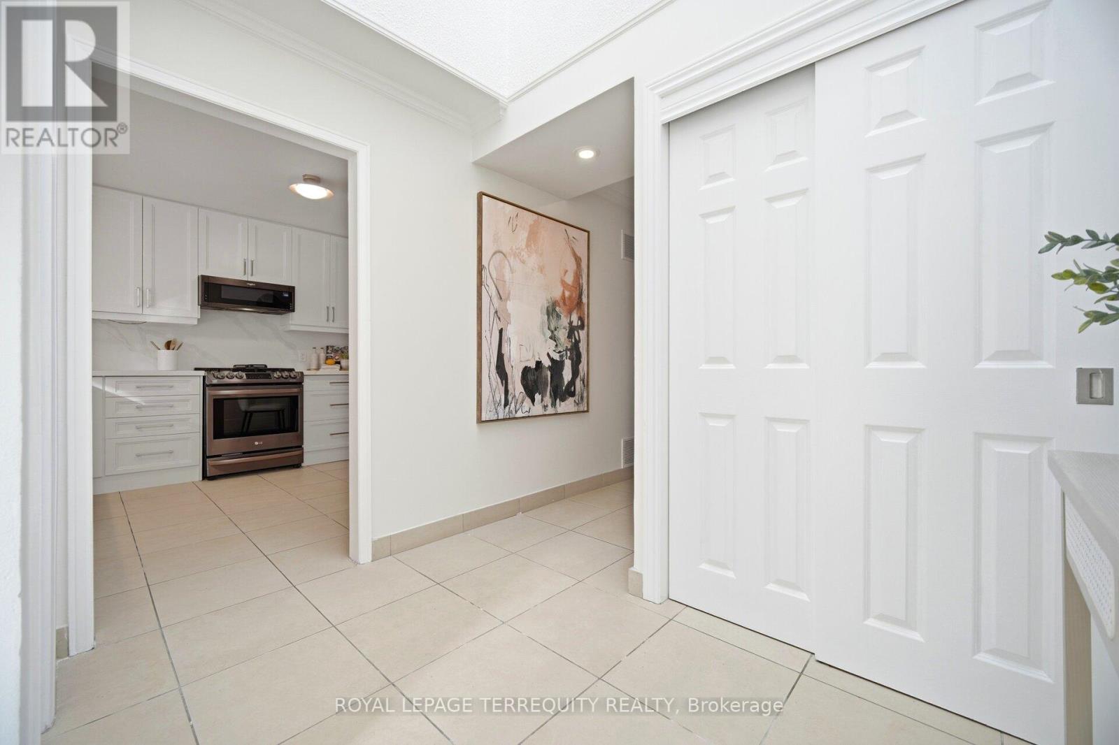 Welcome to this bright and beautifully updated 3-bedroom townhouse offering space, comfort, and a wonderful connection to nature. The impressive front entrance features a soaring 20-foot ceiling with a skylight that fills both the main and second floors with natural light, creating an airy and welcoming first impression.The upgraded kitchen showcases new quartz countertops, a stylish backsplash, new cupboards, and a brand-new refrigerator. There is ample space for a breakfast table, making it perfect for casual meals and morning coffee.The open-concept living and dining areas are generously sized and ideal for both everyday living and entertaining. From the living room, step out to a private patio overlooking a peaceful park-like setting with mature trees. It is a quiet retreat for relaxing or hosting guests.Upstairs offers three well-proportioned bedrooms, including a spacious primary bedroom with a walk-in closet and private ensuite. The home is completely carpet-free, providing a clean and modern feel throughout.The lower level features a large recreation or family room with a cozy fireplace, perfect for relaxing or gathering with family and friends. This versatile space also offers potential for an in-law suite. An oversized laundry room, additional storage under the stairs, and central vacuum add everyday convenience.A rear basement door provides direct access to the garage, with two parking spaces right outside the door. Ideally located close to shopping, malls, restaurants, schools, public transit, and major highways. (id:64974)