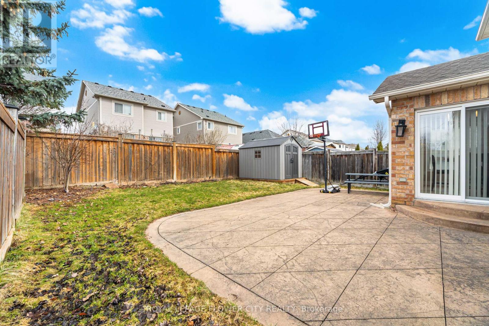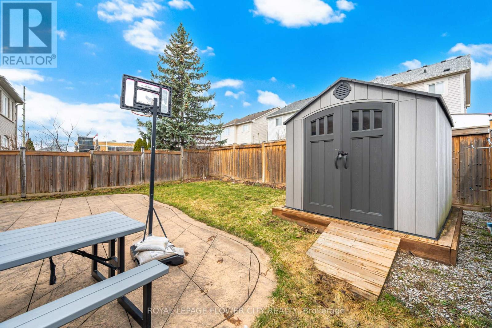 Welcome to this beautifully maintained 4-bedroom, 4-bathroom detached home featuring a double car garage and elegant double door entry. Step into the impressive open-to-above foyer leading to a spacious layout with separate living, dining, and family rooms. The living room showcases a tray ceiling, and a stunning double-sided gas fireplace serves both the living and family rooms. Hardwood flooring flows through the living, dining, and family rooms, complemented by pot lights throughout the main floor and a built-in speaker system for enhanced entertainment.The home features a huge modern kitchen with plenty of tall cabinets, a chef's desk, central island with breakfast bar, and a bright breakfast area. The primary bedroom offers a luxurious 5-piece ensuite with Jacuzzi tub and separate standing shower. Three additional generously sized bedrooms and a 4-piece main bath complete the second floor.Recent updates include new carpet on the second floor (2022) and a new A/C (2024). Electrical upgrades include a 200 Amp panel with an additional 60 Amp pony panel.The finished basement includes a recreation room, kitchen, and full bathroom-ideal for extended family or additional living space.Enjoy the spacious backyard with a concrete patio and garden shed. Hot water tank is a rental. (id:64974)