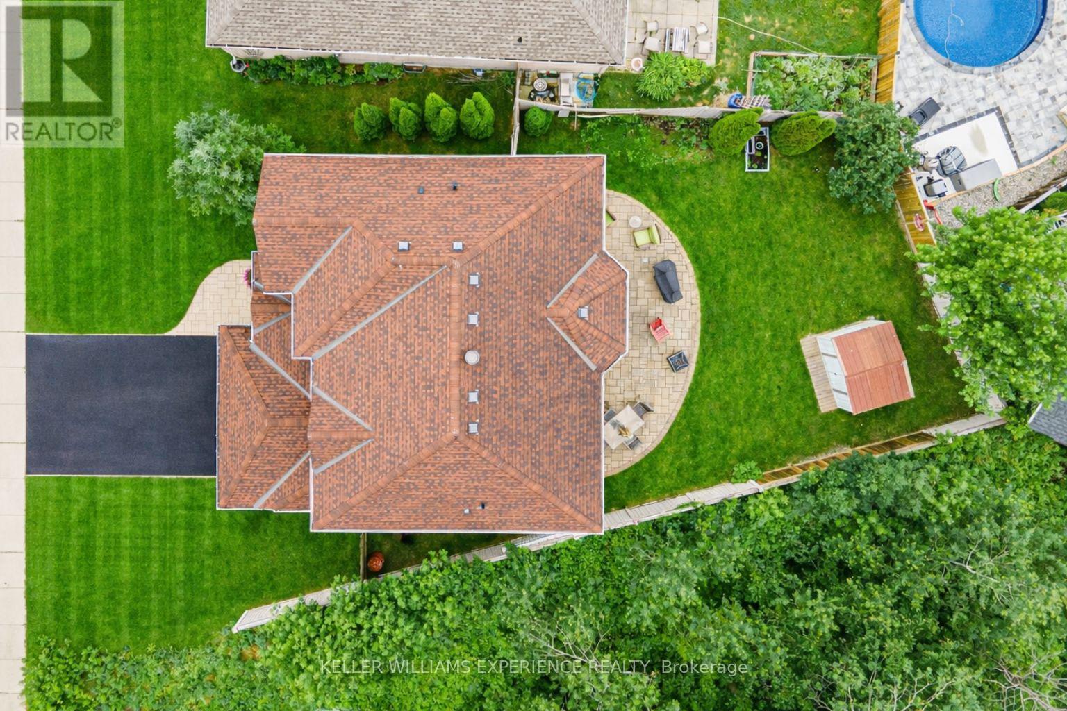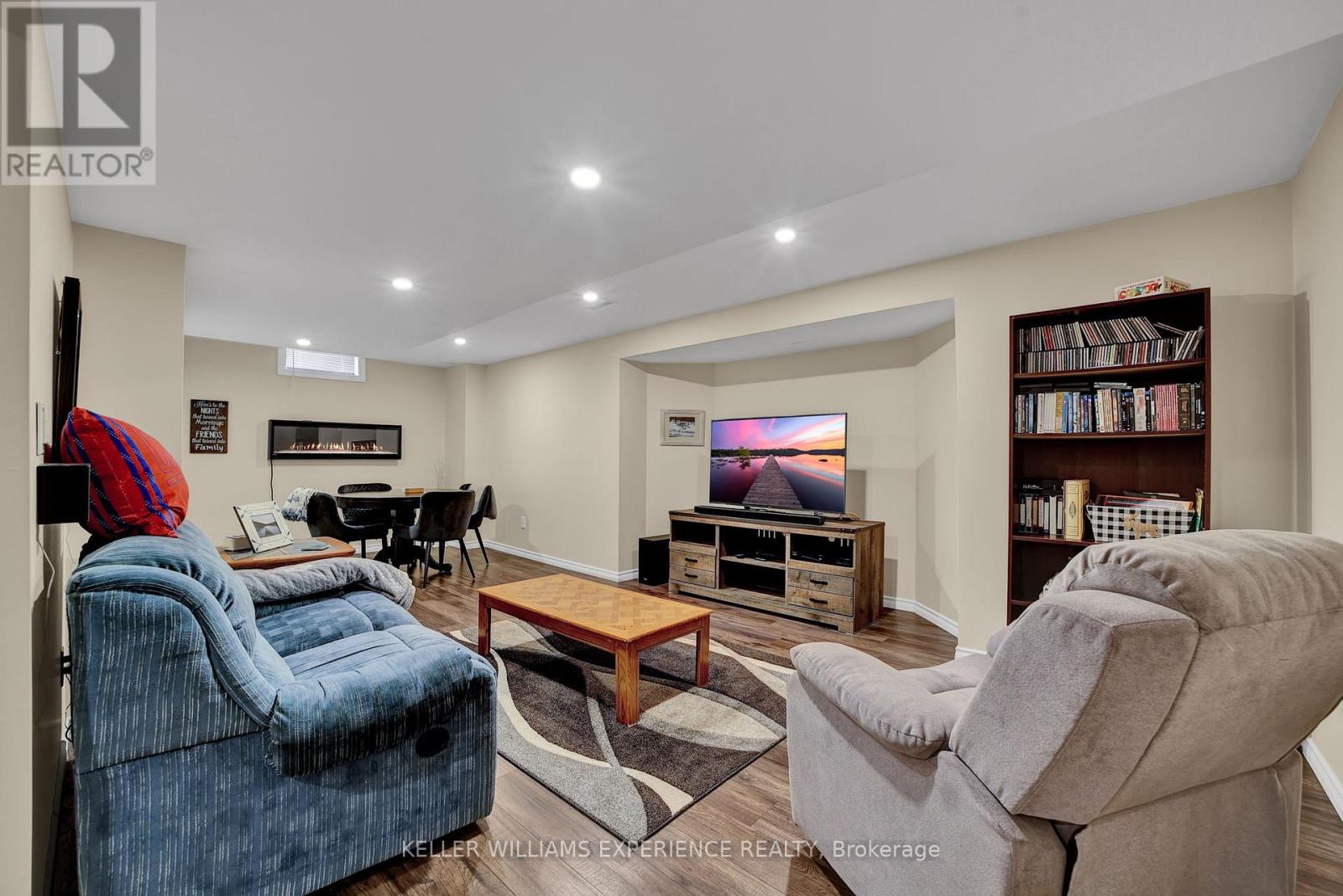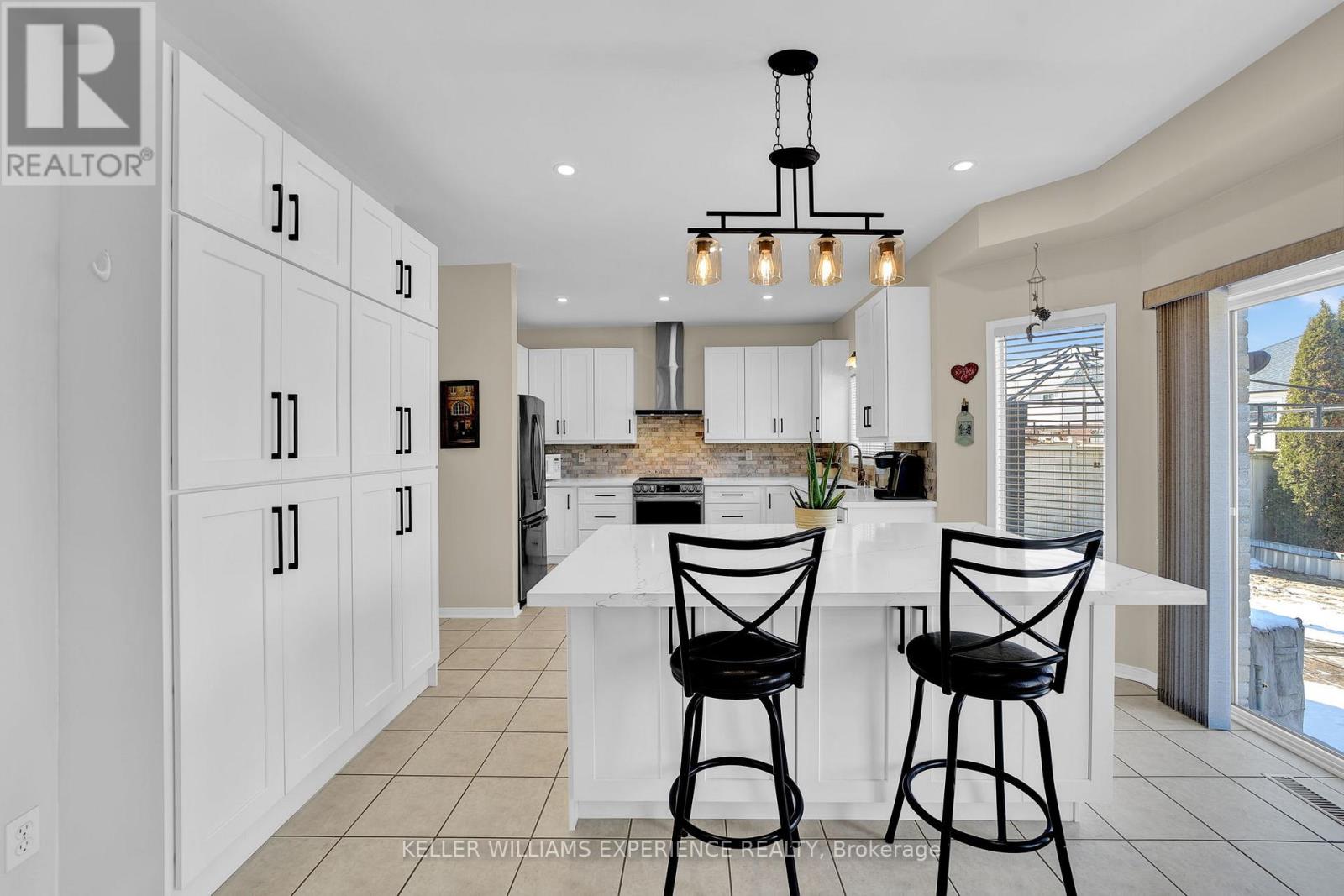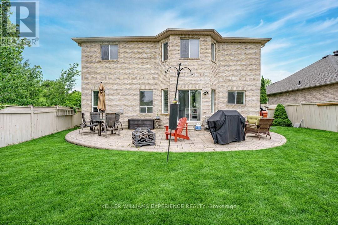 Discover this exceptionally well-maintained, all-brick family home at 4 Gold Park Gate in Angus. Boasting over 2800 sq. ft. of fully finished living space on great lot. This spacious and bright home features a double-door entry, 9-ft ceilings, and a formal living and dining room with hardwood floors and pot lighting. The beautifully renovated eat-in kitchen (2022) showcases quartz counters, a stylish backsplash, new appliances, pot lighting, a breakfast bar, and a walkout to a stone patio and fenced yard with a garden shed. The cozy family room offers a gas fireplace and hardwood flooring. A main floor laundry with garage access and a powder room add convenience. Upstairs, the refinished primary suite includes a walk-in closet, an ensuite with a new vanity and shower, and a relaxing corner jet tub. Three additional generously sized bedrooms complete the second floor. The finished basement features a large rec room, a 2-pc bath, and ample storage. Upgrades include new garage doors (2021), central air (2024), and a water softener. (id:64974)