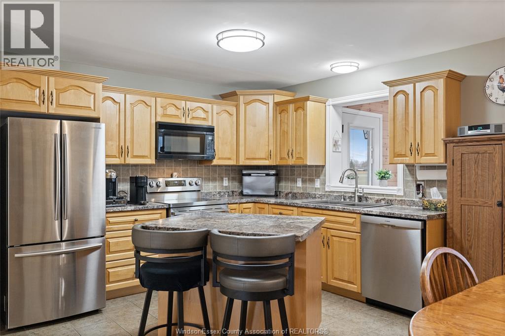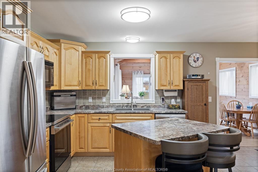 Beautiful raised ranch located in a desirable Tilbury neighbourhood. This well-maintained home features 3 bedrooms and 2 full bathrooms with a functional layout. The main floor offers a bright living space, custom kitchen with island, spacious primary bedroom, and a sunroom addition providing extra living space and backyard views. The finished lower level includes a large recreation room and the third bedroom. Major updates include roof, furnace, and central air conditioning. Outside you'll find a double concrete drive, attached garage, and landscaped yard backing onto field. Conveniently located close to parks, schools, and local amenities. (id:64974)