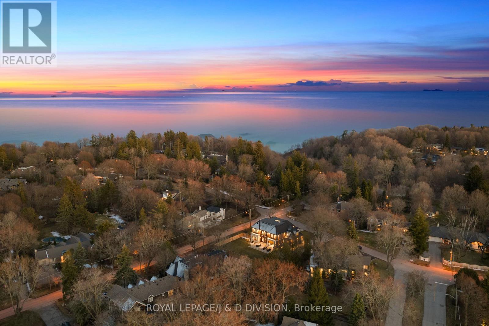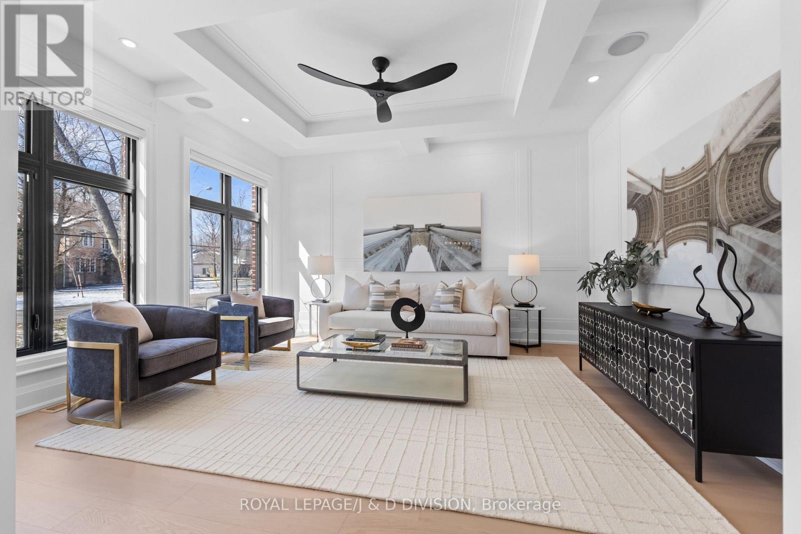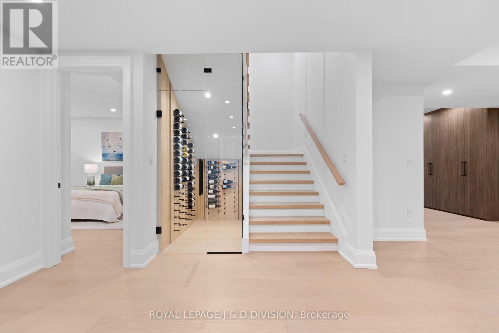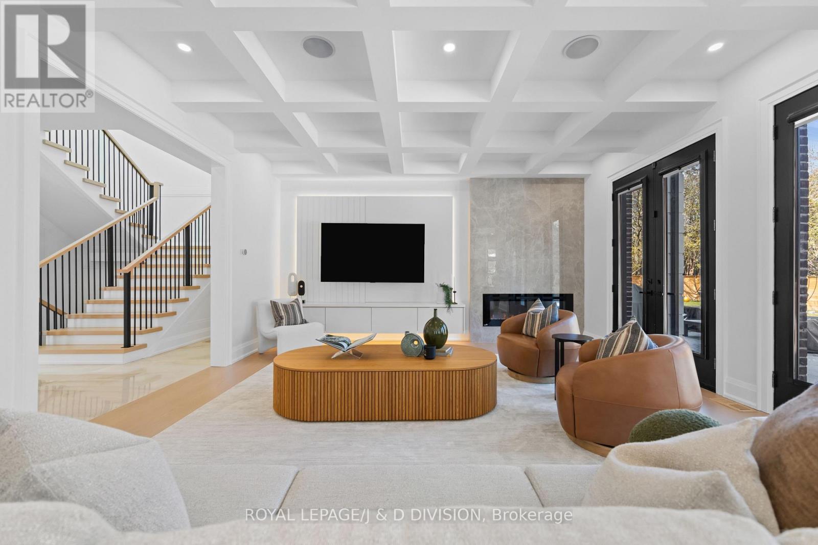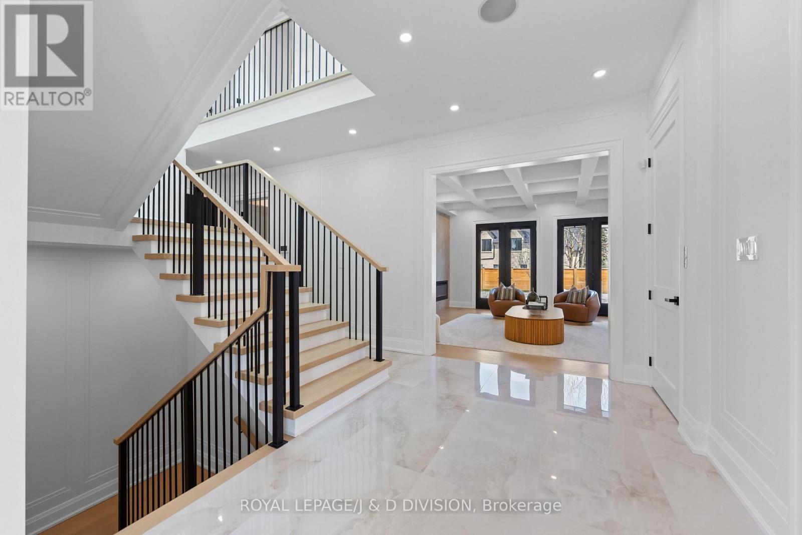 A striking residence, architecturally designed by the renowned Peter Higgins. This custom-built residence sits in one of the most exclusive enclaves in the Scarborough Bluffs just steps from the lake. It offers nearly 7,000 square feet of living space on an exceptionally private lot. Step inside where luxury is boundless. A classic centre hall plan introduces elegant living and dining rooms. The living room features exquisite millwork and a bright south exposure, while the formal dining room comfortably seats 8-10 guests and is anchored by a gas fireplace. The family room is both dramatic and inviting, with a coffered ceiling, French doors to the gardens, and a striking stone fireplace wall. The chef's kitchen blends elegance with functionality in an open-concept layout overlooking the family and breakfast areas. A large centre island with seating for four is complemented by floor-to-ceiling cabinetry, premium integrated appliances, and a seamless full-height backsplash. The breakfast area, set within a garden-view window bay, seats up to eight and is supported by a butler's pantry and walk-in pantry. A discreet mudroom with access to the double garage and garden, along with two powder rooms, completes the main floor. A sweeping staircase ascends gracefully to the second floor, adorned with intricate custom millwork and two skylights that bathe the landing in natural light, creating a luminous and unforgettable architectural statement. A luxurious primary suite features a fireplace, sitting area, and Juliette balconies. The spa-inspired ensuite offers heated floors, steam shower, and refined marble and quartz finishes, alongside an expansive walk-in closet. Four additional bedrooms, three with ensuites, and a laundry room complete the second level. The expansive walk-up level features a wine room, fitness studio, nanny suite, spa bath, recreation room with wet bar, heated floors, and separate garden access. All floors are accessible by private elevator. (id:64974)