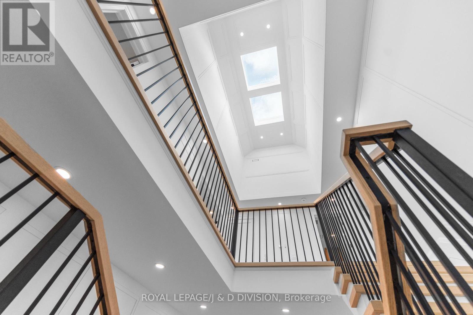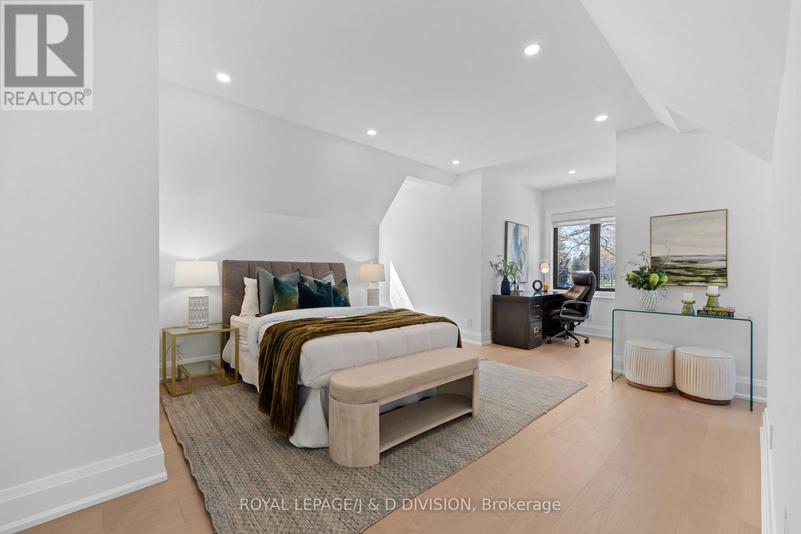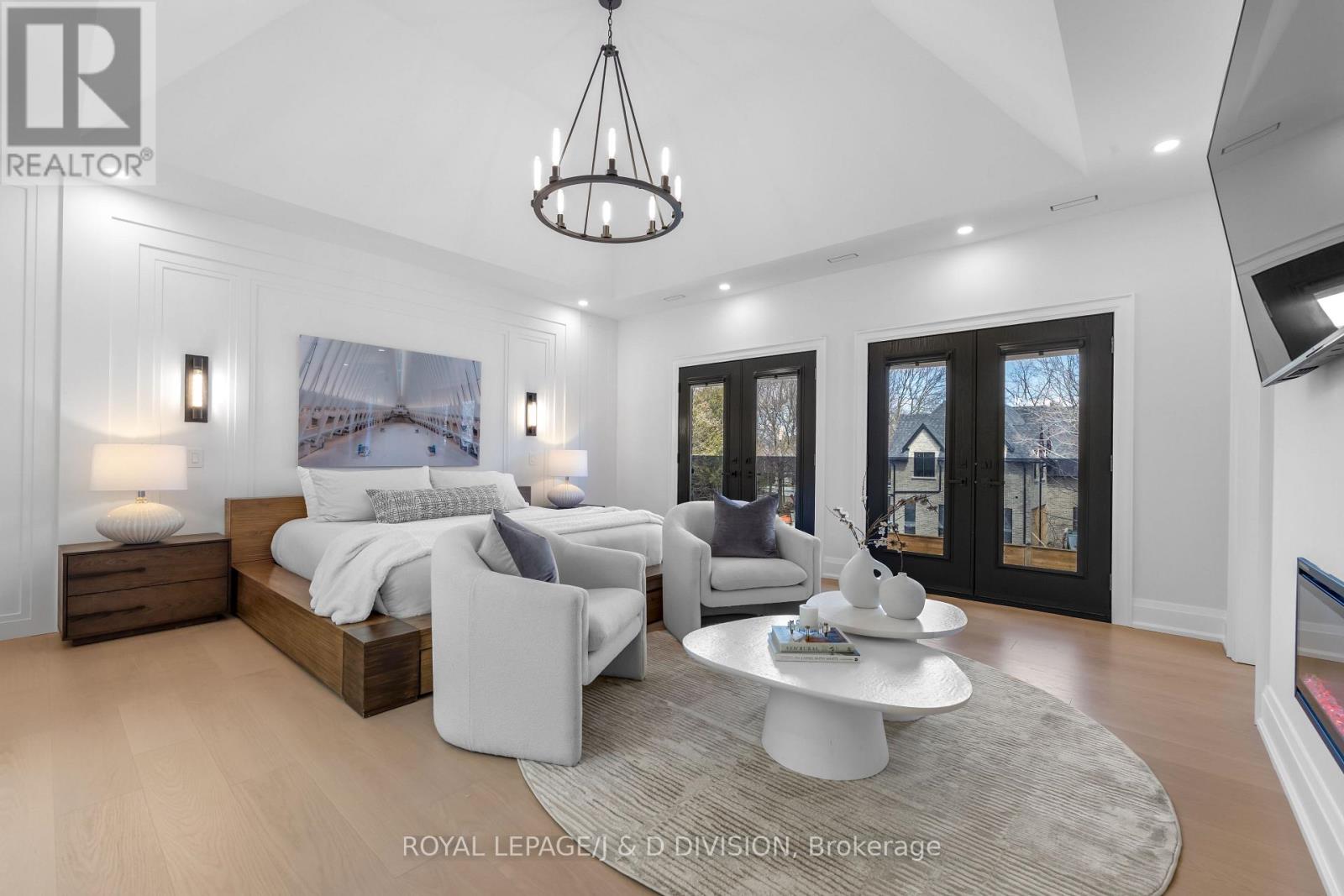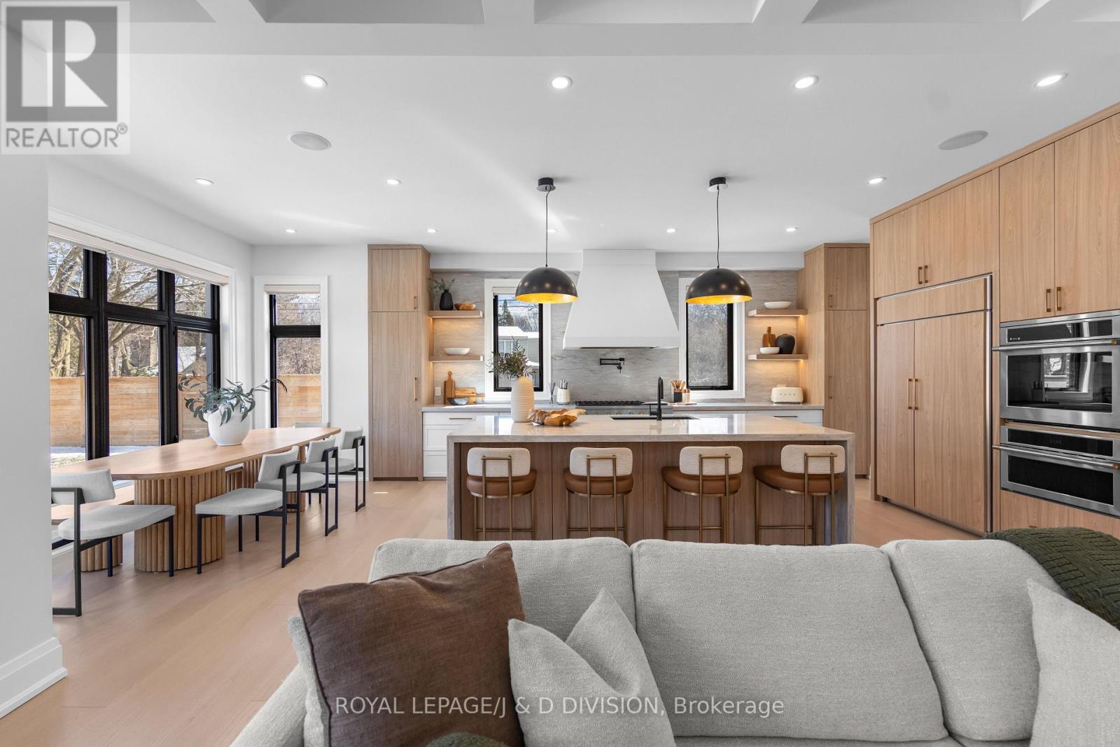 A striking residence, architecturally designed by the renowned Peter Higgins. This custom-built residence sits in one of the most exclusive enclaves in the Scarborough Bluffs just steps from the lake. It offers nearly 7,000 square feet of living space on an exceptionally private lot. Step inside where luxury is boundless. A classic centre hall plan introduces elegant living and dining rooms. The living room features exquisite millwork and a bright south exposure, while the formal dining room comfortably seats 8-10 guests and is anchored by a gas fireplace. The family room is both dramatic and inviting, with a coffered ceiling, French doors to the gardens, and a striking stone fireplace wall. The chef's kitchen blends elegance with functionality in an open-concept layout overlooking the family and breakfast areas. A large centre island with seating for four is complemented by floor-to-ceiling cabinetry, premium integrated appliances, and a seamless full-height backsplash. The breakfast area, set within a garden-view window bay, seats up to eight and is supported by a butler's pantry and walk-in pantry. A discreet mudroom with access to the double garage and garden, along with two powder rooms, completes the main floor. A sweeping staircase ascends gracefully to the second floor, adorned with intricate custom millwork and two skylights that bathe the landing in natural light, creating a luminous and unforgettable architectural statement. A luxurious primary suite features a fireplace, sitting area, and Juliette balconies. The spa-inspired ensuite offers heated floors, steam shower, and refined marble and quartz finishes, alongside an expansive walk-in closet. Four additional bedrooms, three with ensuites, and a laundry room complete the second level. The expansive walk-up level features a wine room, fitness studio, nanny suite, spa bath, recreation room with wet bar, heated floors, and separate garden access. All floors are accessible by private elevator. (id:64974)