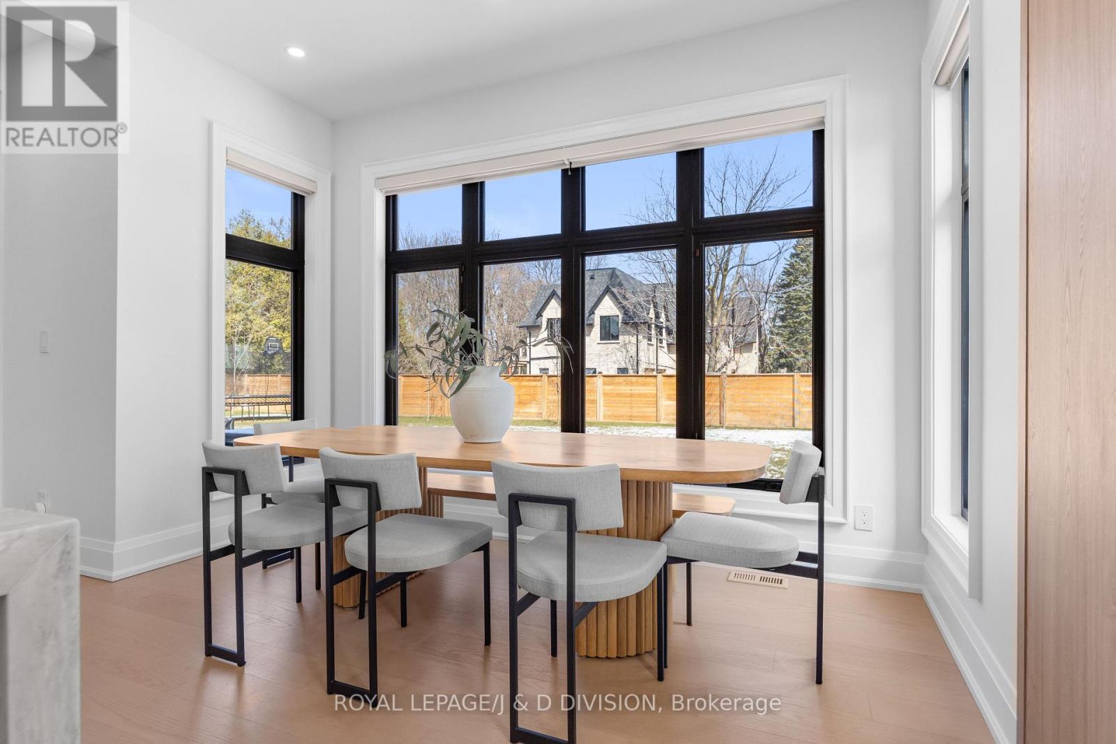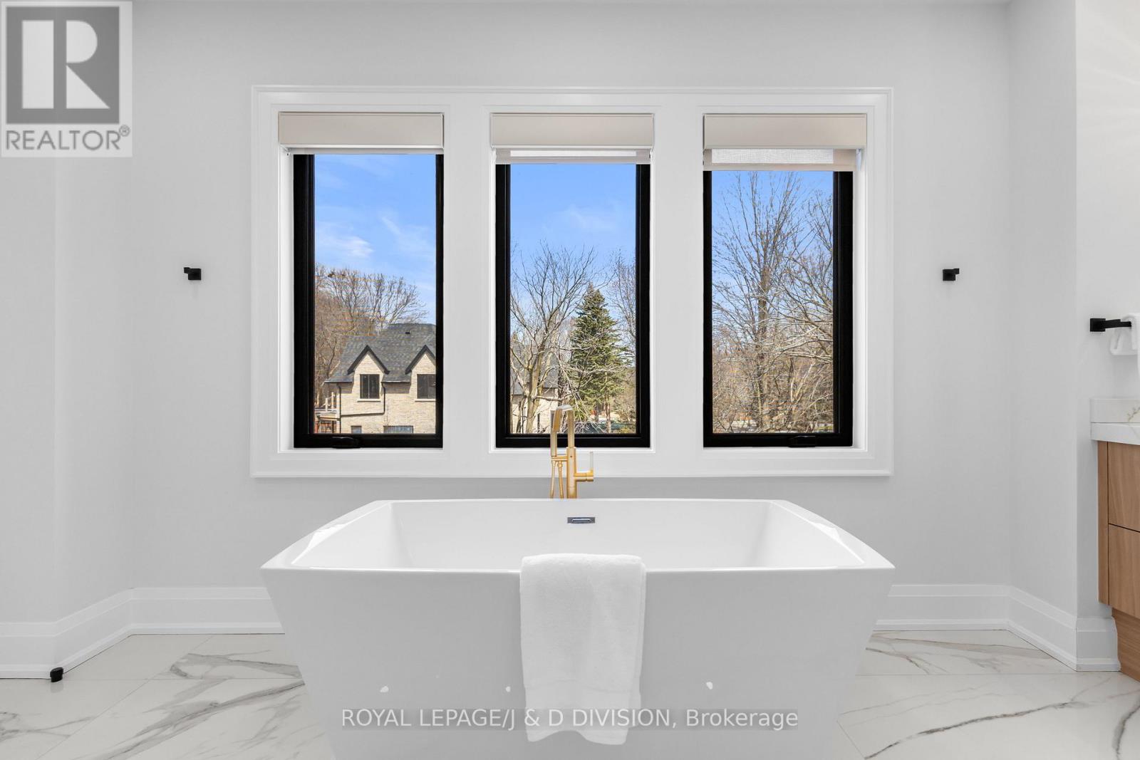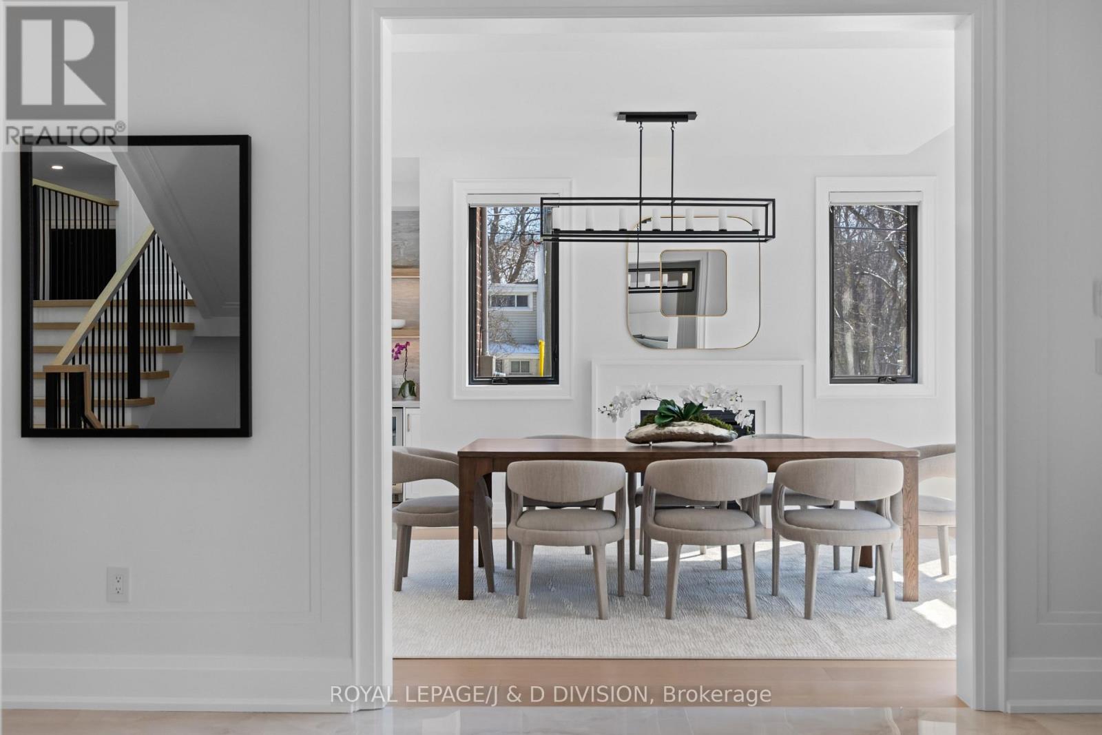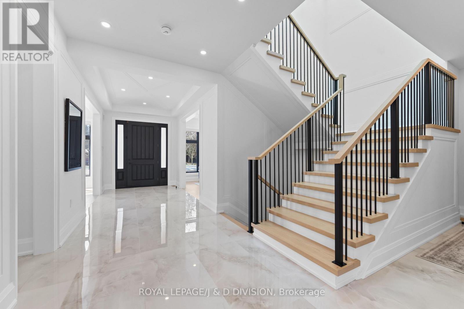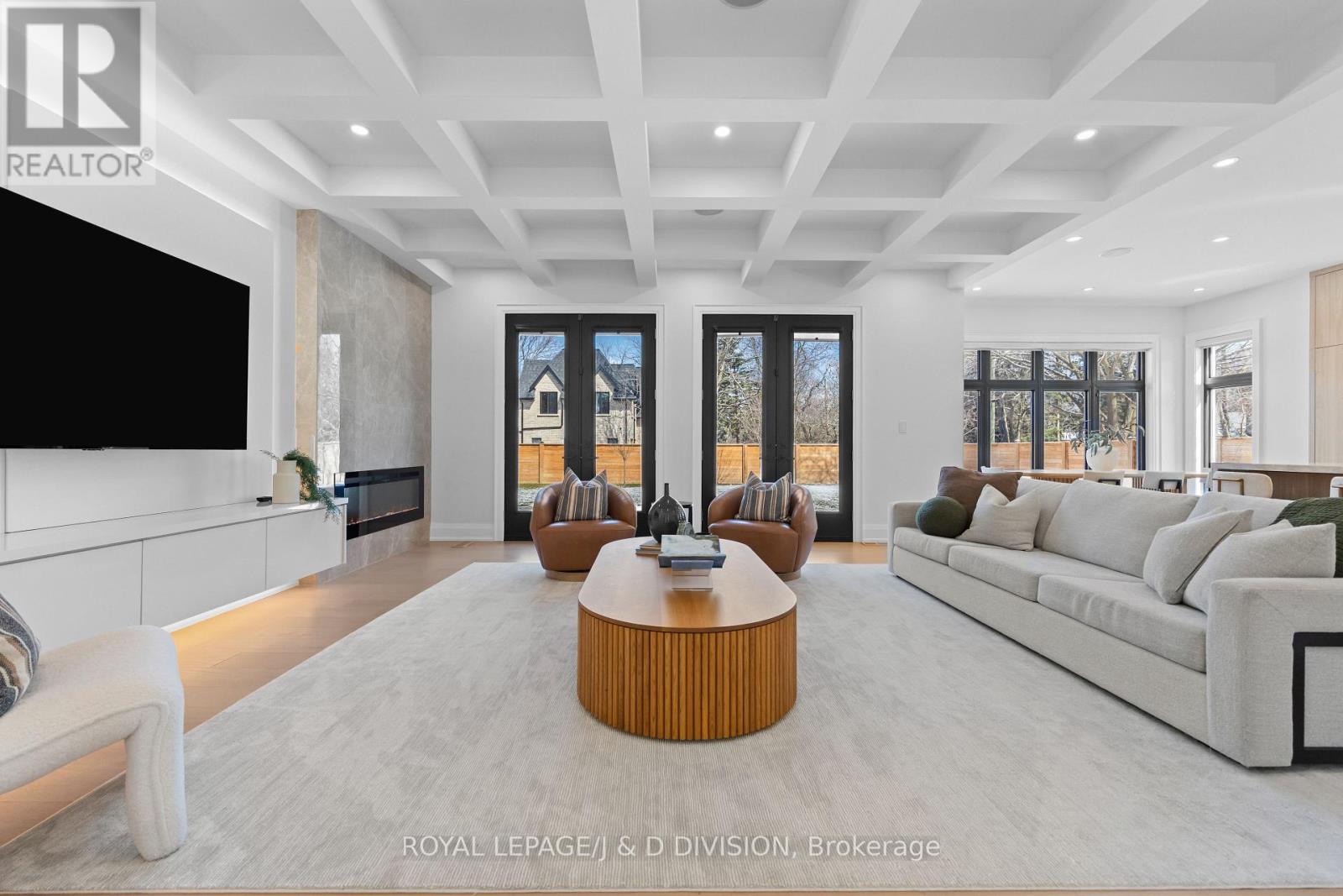 A striking residence, architecturally designed by the renowned Peter Higgins. This custom-built residence sits in one of the most exclusive enclaves in the Scarborough Bluffs just steps from the lake. It offers nearly 7,000 square feet of living space on an exceptionally private lot. Step inside where luxury is boundless. A classic centre hall plan introduces elegant living and dining rooms. The living room features exquisite millwork and a bright south exposure, while the formal dining room comfortably seats 8-10 guests and is anchored by a gas fireplace. The family room is both dramatic and inviting, with a coffered ceiling, French doors to the gardens, and a striking stone fireplace wall. The chef's kitchen blends elegance with functionality in an open-concept layout overlooking the family and breakfast areas. A large centre island with seating for four is complemented by floor-to-ceiling cabinetry, premium integrated appliances, and a seamless full-height backsplash. The breakfast area, set within a garden-view window bay, seats up to eight and is supported by a butler's pantry and walk-in pantry. A discreet mudroom with access to the double garage and garden, along with two powder rooms, completes the main floor. A sweeping staircase ascends gracefully to the second floor, adorned with intricate custom millwork and two skylights that bathe the landing in natural light, creating a luminous and unforgettable architectural statement. A luxurious primary suite features a fireplace, sitting area, and Juliette balconies. The spa-inspired ensuite offers heated floors, steam shower, and refined marble and quartz finishes, alongside an expansive walk-in closet. Four additional bedrooms, three with ensuites, and a laundry room complete the second level. The expansive walk-up level features a wine room, fitness studio, nanny suite, spa bath, recreation room with wet bar, heated floors, and separate garden access. All floors are accessible by private elevator. (id:64974)