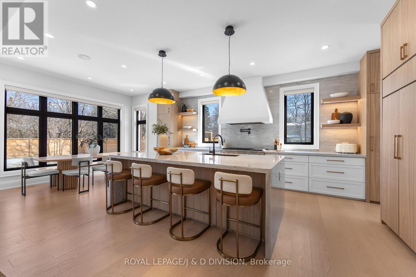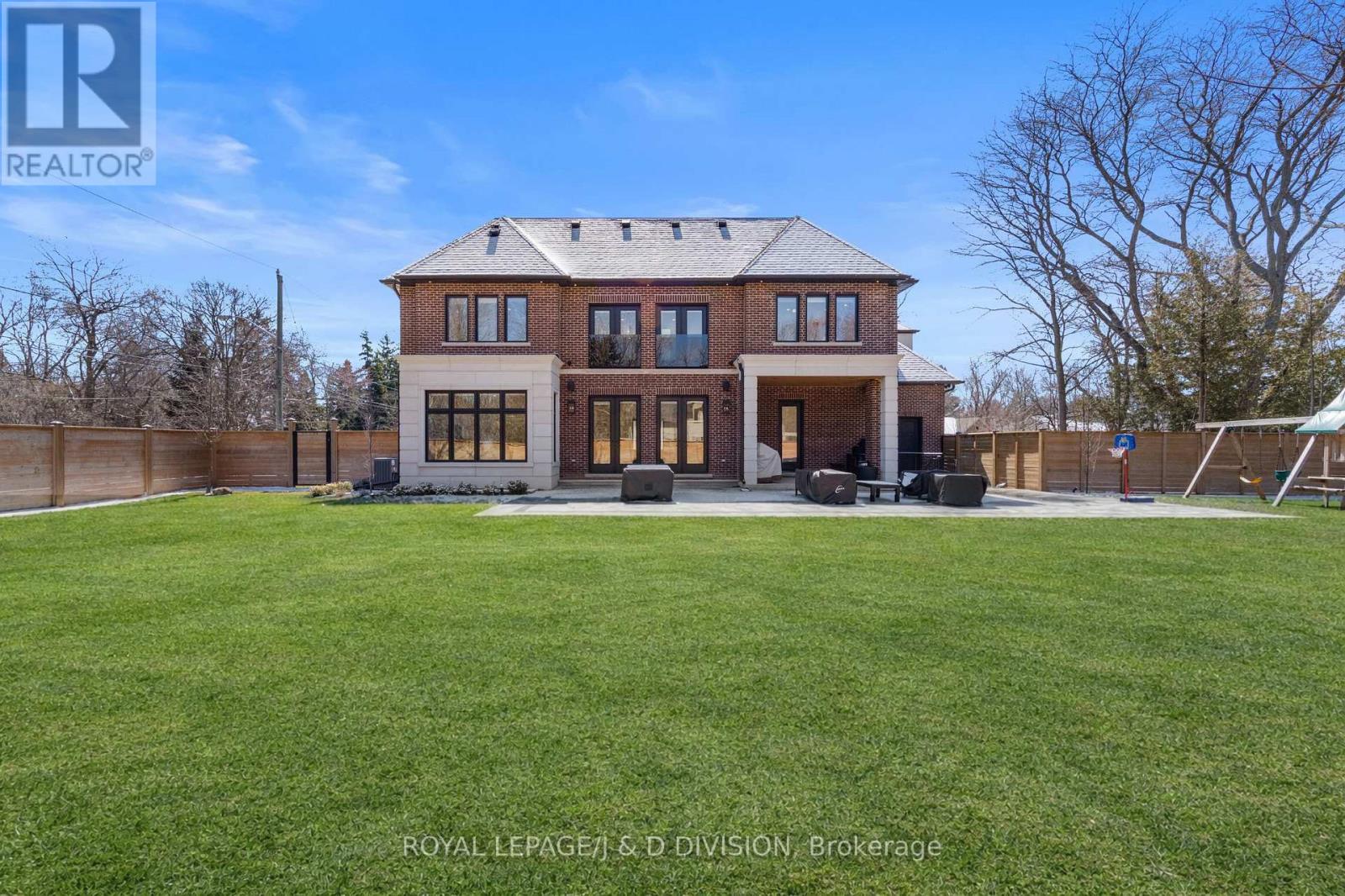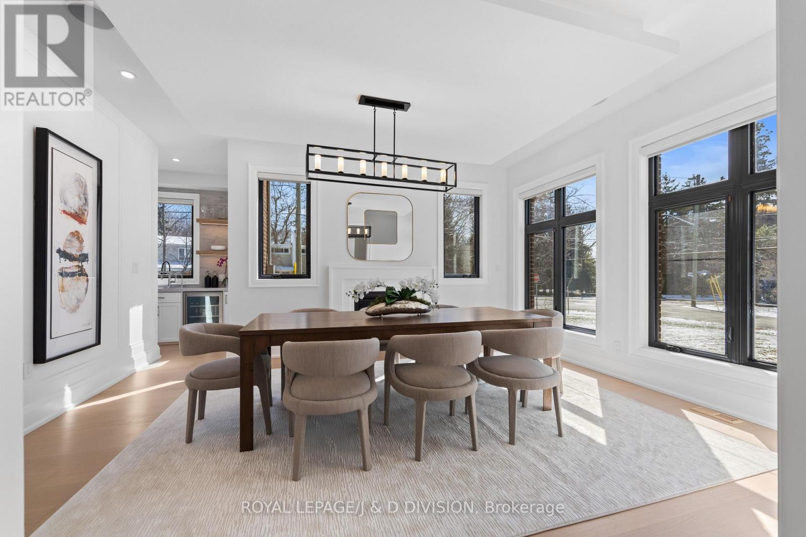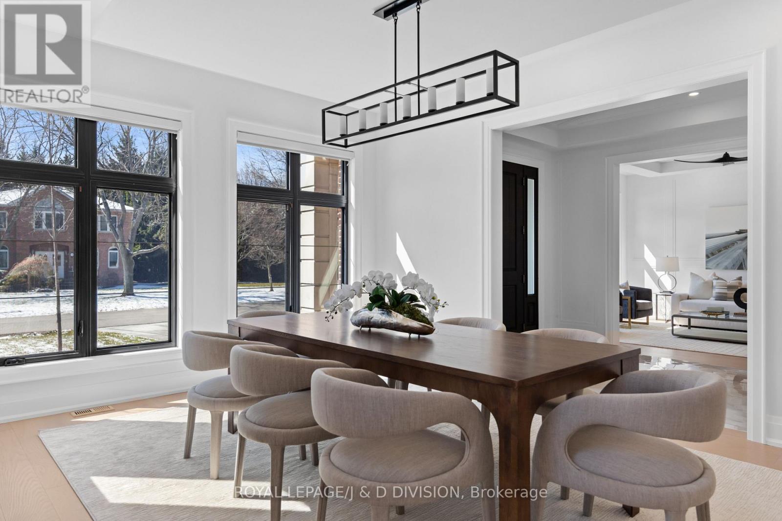 A striking residence, architecturally designed by the renowned Peter Higgins. This custom-built residence sits in one of the most exclusive enclaves in the Scarborough Bluffs just steps from the lake. It offers nearly 7,000 square feet of living space on an exceptionally private lot. Step inside where luxury is boundless. A classic centre hall plan introduces elegant living and dining rooms. The living room features exquisite millwork and a bright south exposure, while the formal dining room comfortably seats 8-10 guests and is anchored by a gas fireplace. The family room is both dramatic and inviting, with a coffered ceiling, French doors to the gardens, and a striking stone fireplace wall. The chef's kitchen blends elegance with functionality in an open-concept layout overlooking the family and breakfast areas. A large centre island with seating for four is complemented by floor-to-ceiling cabinetry, premium integrated appliances, and a seamless full-height backsplash. The breakfast area, set within a garden-view window bay, seats up to eight and is supported by a butler's pantry and walk-in pantry. A discreet mudroom with access to the double garage and garden, along with two powder rooms, completes the main floor. A sweeping staircase ascends gracefully to the second floor, adorned with intricate custom millwork and two skylights that bathe the landing in natural light, creating a luminous and unforgettable architectural statement. A luxurious primary suite features a fireplace, sitting area, and Juliette balconies. The spa-inspired ensuite offers heated floors, steam shower, and refined marble and quartz finishes, alongside an expansive walk-in closet. Four additional bedrooms, three with ensuites, and a laundry room complete the second level. The expansive walk-up level features a wine room, fitness studio, nanny suite, spa bath, recreation room with wet bar, heated floors, and separate garden access. All floors are accessible by private elevator. (id:64974)