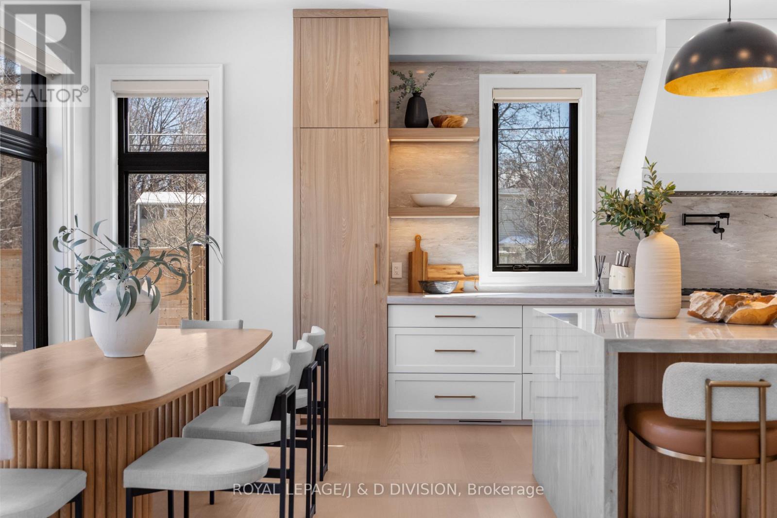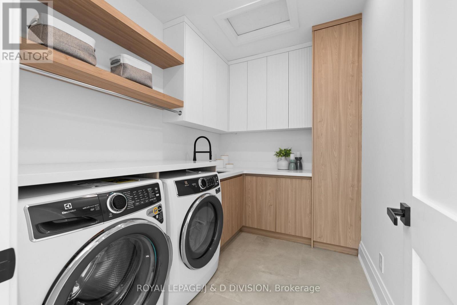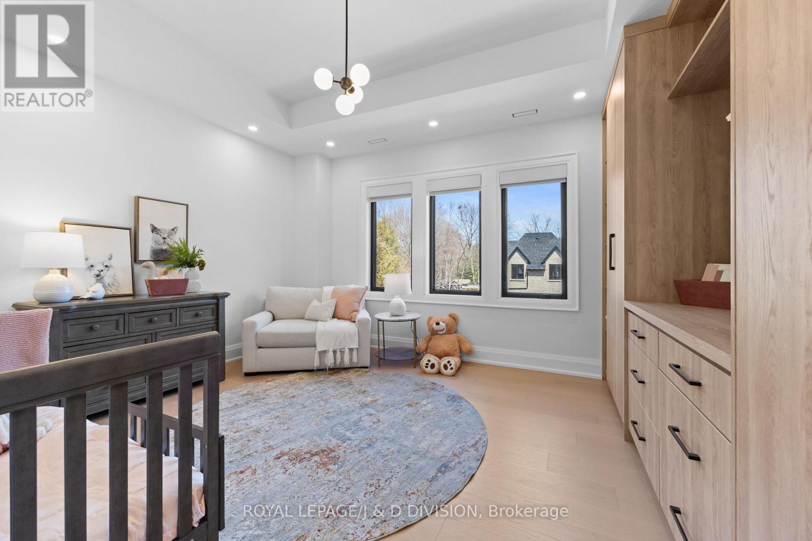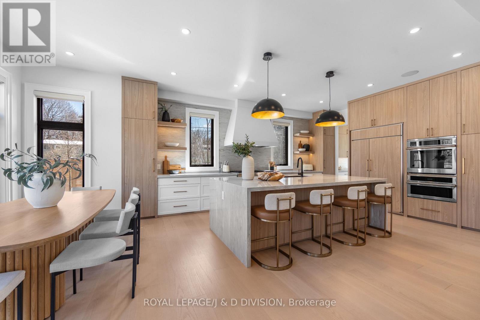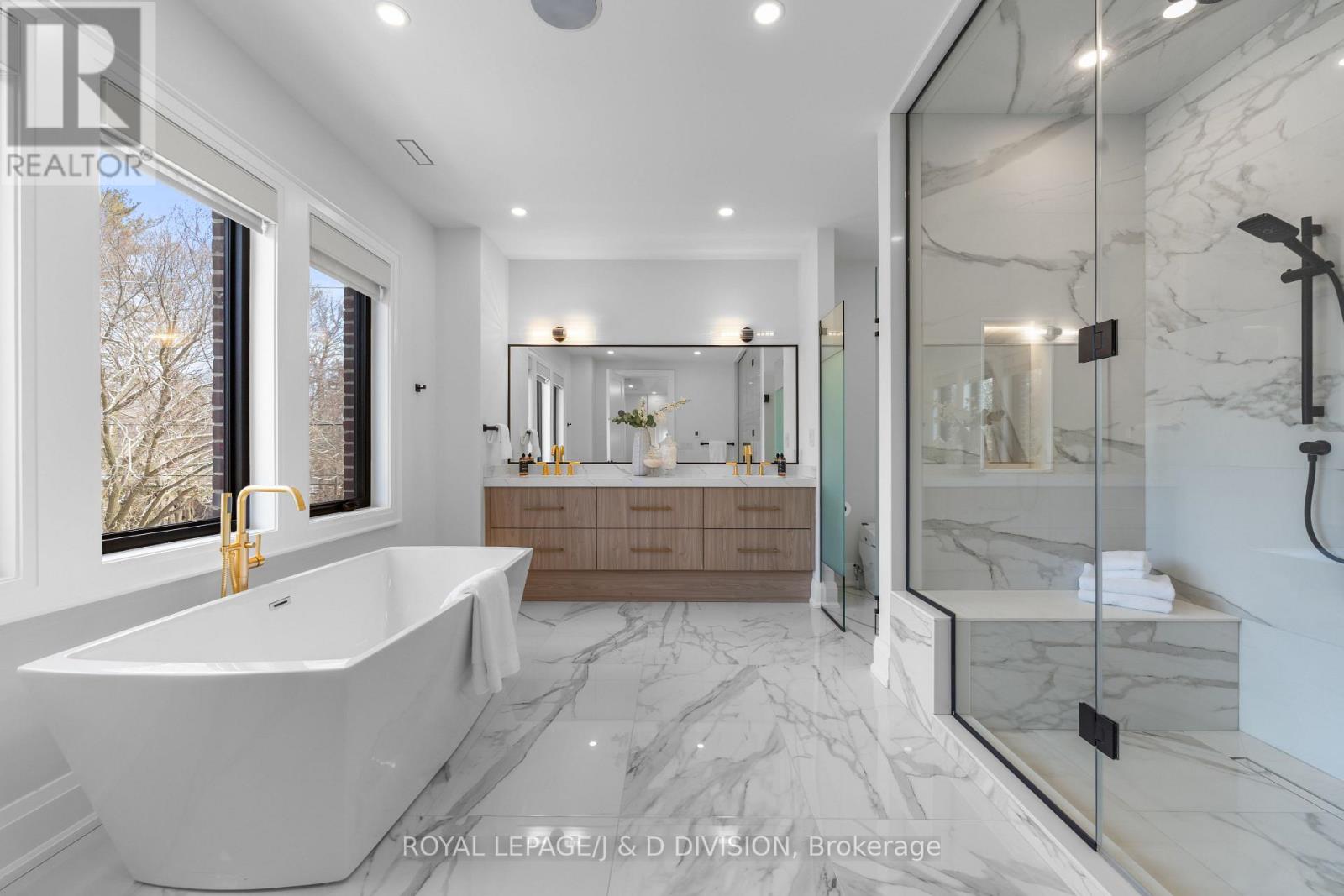 A striking residence, architecturally designed by the renowned Peter Higgins. This custom-built residence sits in one of the most exclusive enclaves in the Scarborough Bluffs just steps from the lake. It offers nearly 7,000 square feet of living space on an exceptionally private lot. Step inside where luxury is boundless. A classic centre hall plan introduces elegant living and dining rooms. The living room features exquisite millwork and a bright south exposure, while the formal dining room comfortably seats 8-10 guests and is anchored by a gas fireplace. The family room is both dramatic and inviting, with a coffered ceiling, French doors to the gardens, and a striking stone fireplace wall. The chef's kitchen blends elegance with functionality in an open-concept layout overlooking the family and breakfast areas. A large centre island with seating for four is complemented by floor-to-ceiling cabinetry, premium integrated appliances, and a seamless full-height backsplash. The breakfast area, set within a garden-view window bay, seats up to eight and is supported by a butler's pantry and walk-in pantry. A discreet mudroom with access to the double garage and garden, along with two powder rooms, completes the main floor. A sweeping staircase ascends gracefully to the second floor, adorned with intricate custom millwork and two skylights that bathe the landing in natural light, creating a luminous and unforgettable architectural statement. A luxurious primary suite features a fireplace, sitting area, and Juliette balconies. The spa-inspired ensuite offers heated floors, steam shower, and refined marble and quartz finishes, alongside an expansive walk-in closet. Four additional bedrooms, three with ensuites, and a laundry room complete the second level. The expansive walk-up level features a wine room, fitness studio, nanny suite, spa bath, recreation room with wet bar, heated floors, and separate garden access. All floors are accessible by private elevator. (id:64974)