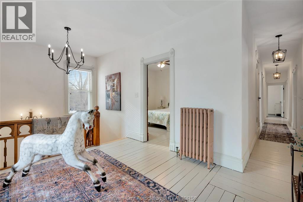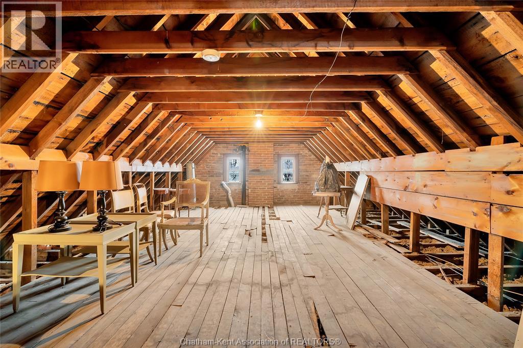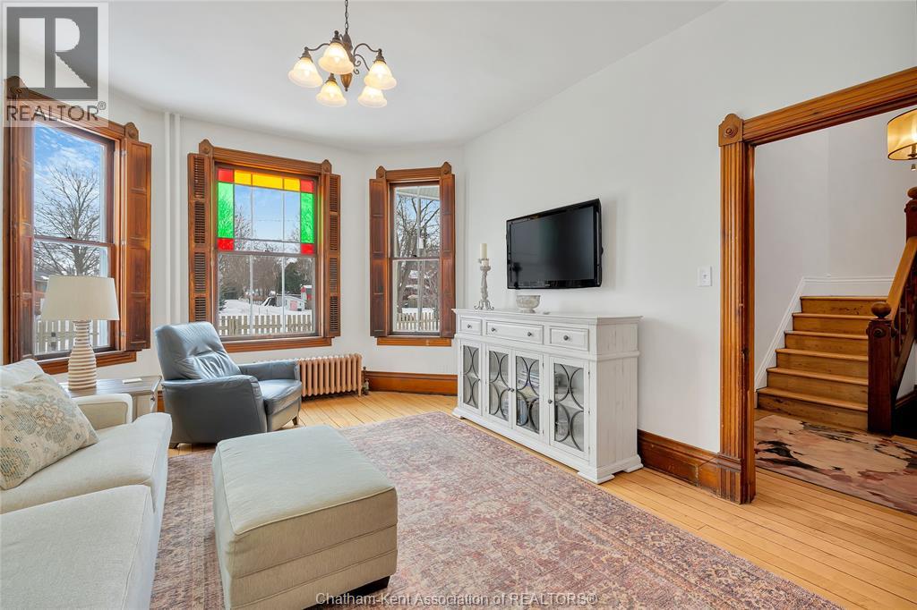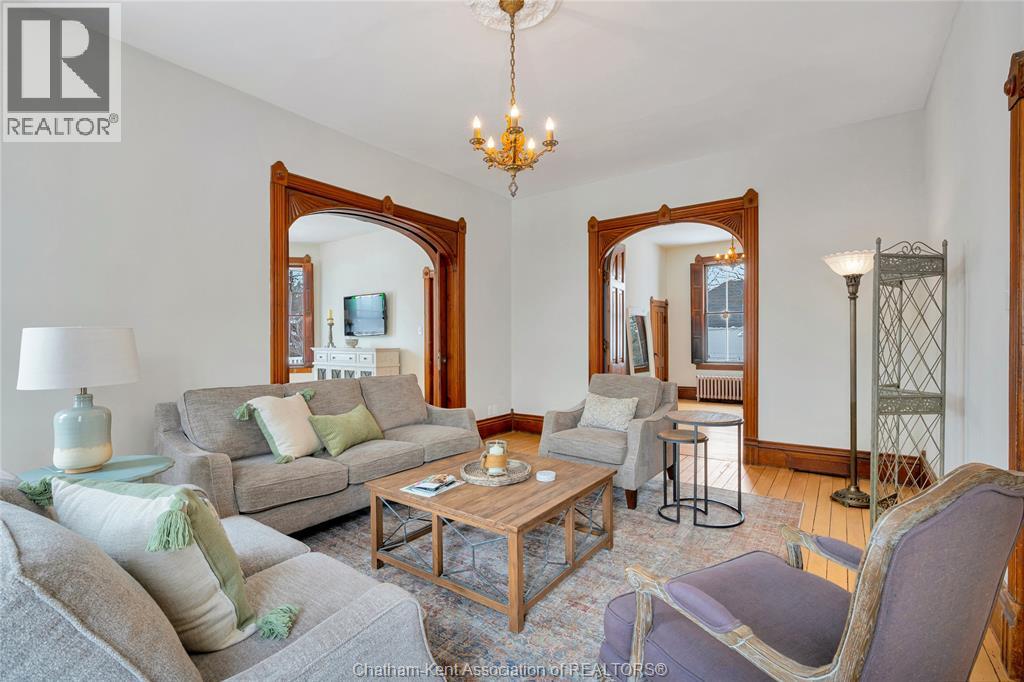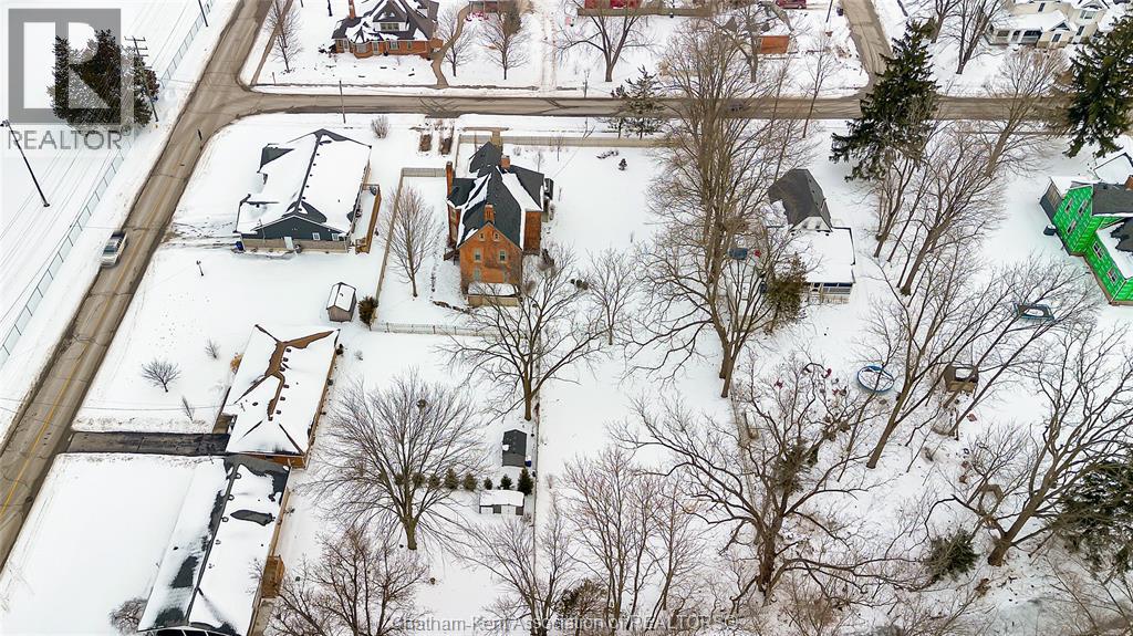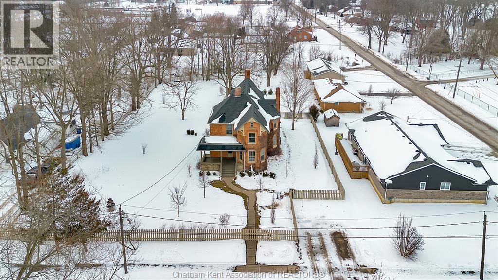 This classic Victorian home in the heart of Thamesville offers exceptional space, craftsmanship, and timeless character. Set on a fully fenced 0.63-acre lot, the property features a gated entry, mature trees, and a welcoming pillared front porch that creates an impressive first impression. Inside, soaring ceilings and original architectural details shine, including rich woodwork, elegant archways, pocket doors, and hardwood flooring throughout. The main floor offers a traditional front parlour, a comfortable living room with decorative fireplace, and a spacious dining room that flows seamlessly into a beautifully updated kitchen (August 2025). Both the main-floor powder room and upper full bathroom were also renovated in August 2025, blending modern comfort with historic charm. A newer boiler (2022) adds efficiency and peace of mind. With six bedrooms, the home offers outstanding flexibility for growing families, home offices, guests, or creative space. The unfinished attic provides excellent potential for additional living area, while the full basement offers abundant storage and utility space. Front porch shingles were replaced in 2025, enhancing curb appeal while preserving the home’s classic aesthetic. Situated on a quiet side street, the setting feels private and estate-like, yet remains within easy walking distance of Main Street shops, parks, the community centre, and pool. Properties offering this rare combination of lot size, architectural character, updates, and location are seldom available and truly best appreciated in person. (id:64974)