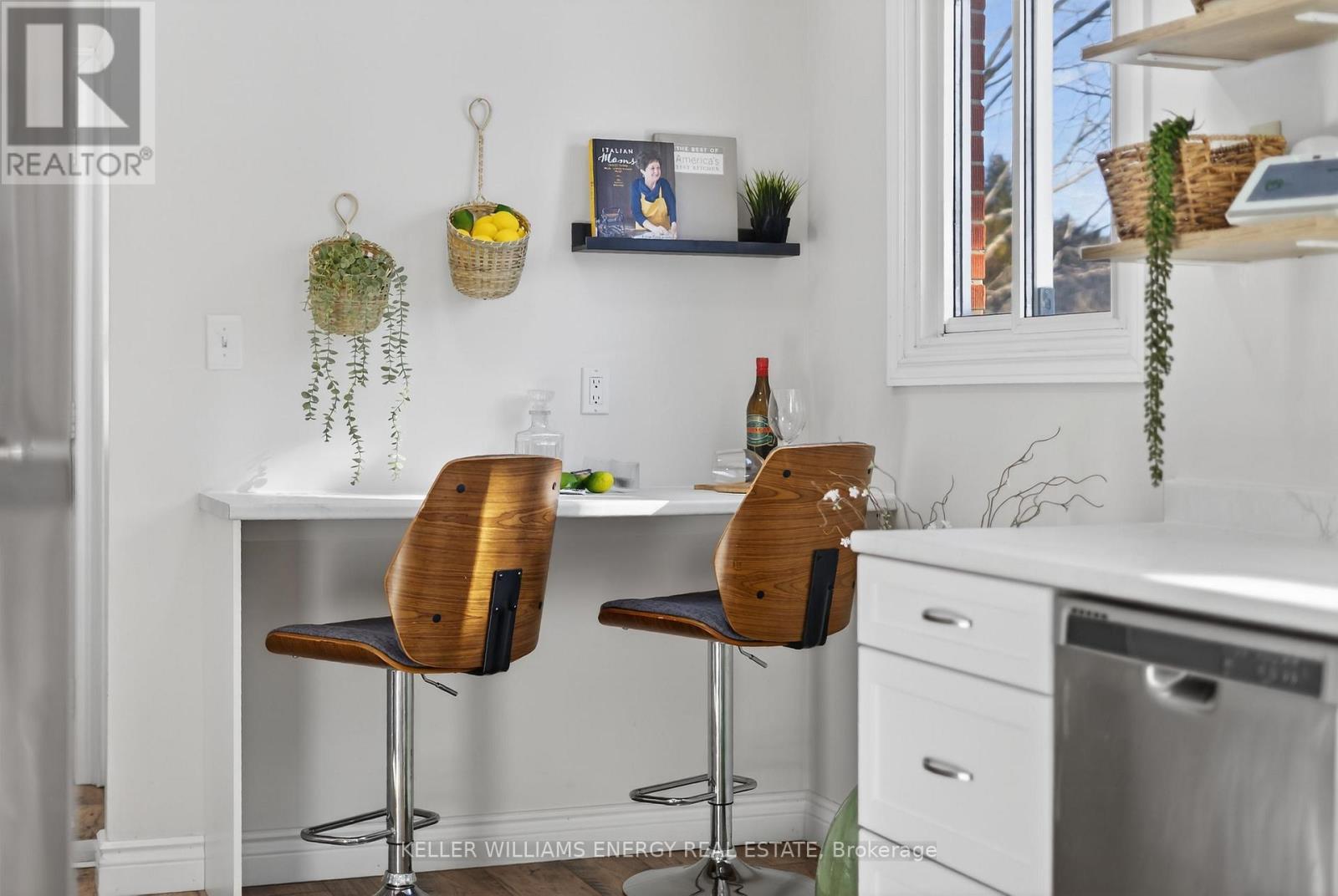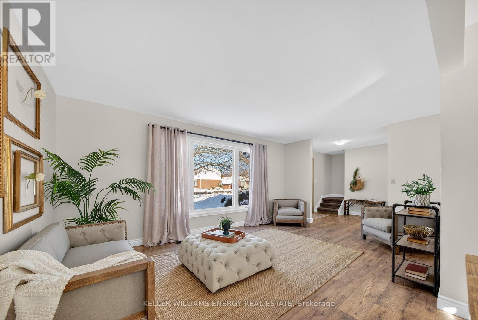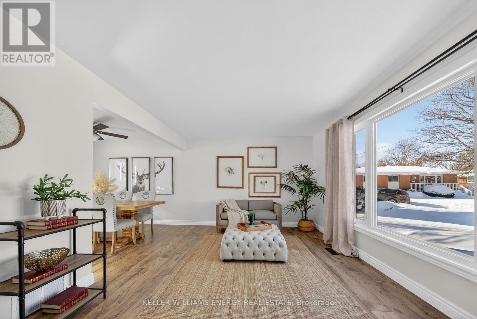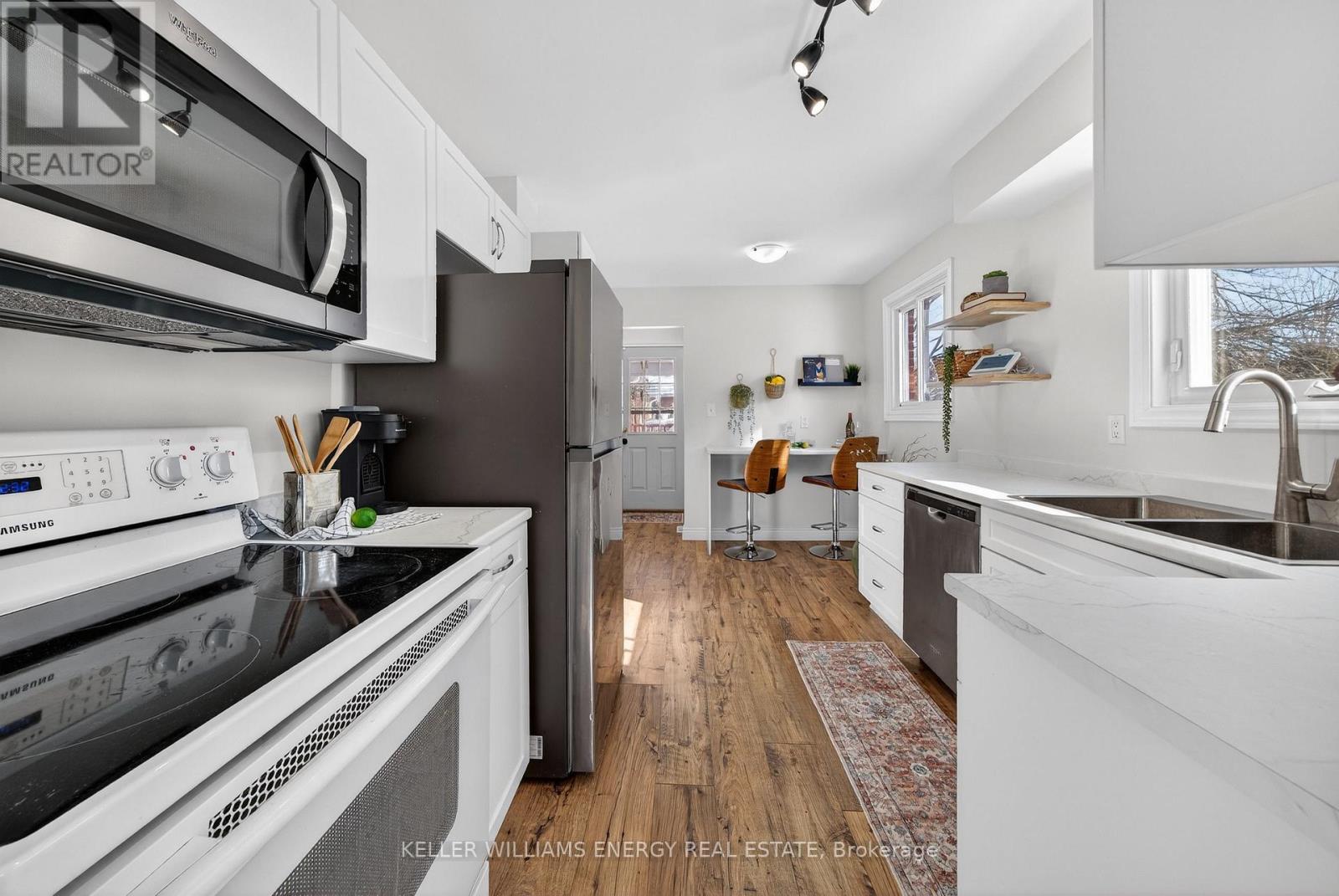 See Video & Virtual Tour links. Welcome to this beautifully updated 4-bedroom, 1.5-bath home, located on a quiet, family-friendly street in a desirable West-end Belleville neighbourhood. This move-in-ready property offers thoughtful upgrades throughout. The fully updated kitchen (2025) is the heart of the home, showcasing new stylish cabinetry, modern countertops, a deep sink with updated faucet, built-in microwave, and a breakfast bar-perfect for everyday living and entertaining. The spacious living room features ample seating space and a large bay window that fills the home with natural light. The dining room flows into both the living room and kitchen, ideal for family meals and gatherings. A convenient main-floor 2-piece bathroom, located near the carport entrance, has been updated with a new vanity and fixtures. Upstairs, you'll find four generously sized bedrooms and a refreshed 4-piece bathroom with a new vanity, vinyl flooring, and fixtures (2025), a newer bathtub and surround. Throughout the freshly painted home, all-new water-resistant laminate flooring (2025) provides a bright, cohesive finish. Additional updates include multiple newer windows (2020 & 2025). The hot water tank is owned and there is central air conditioning. Fibre optic internet is available-ideal for video conferencing, home security systems, and gaming. Enjoy a fantastic lifestyle location with walkable access to the Belleville waterfront trail, Zwick's Waterfront Park, great schools, convenience stores, box stores, quick dining options, and more. Simply unpack and enjoy-this is a well-maintained, thoughtfully upgraded home in an excellent Belleville location. (id:64974)