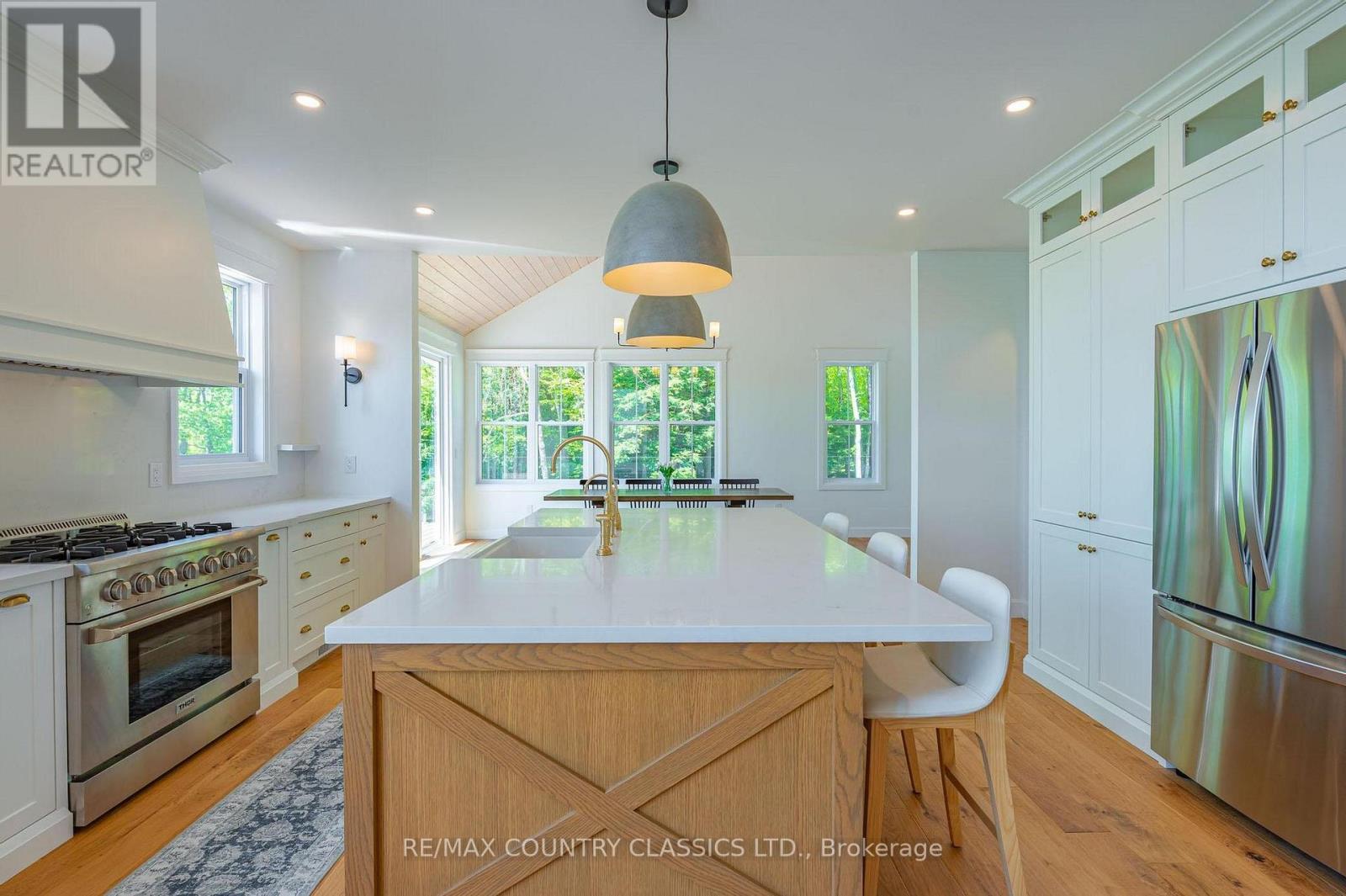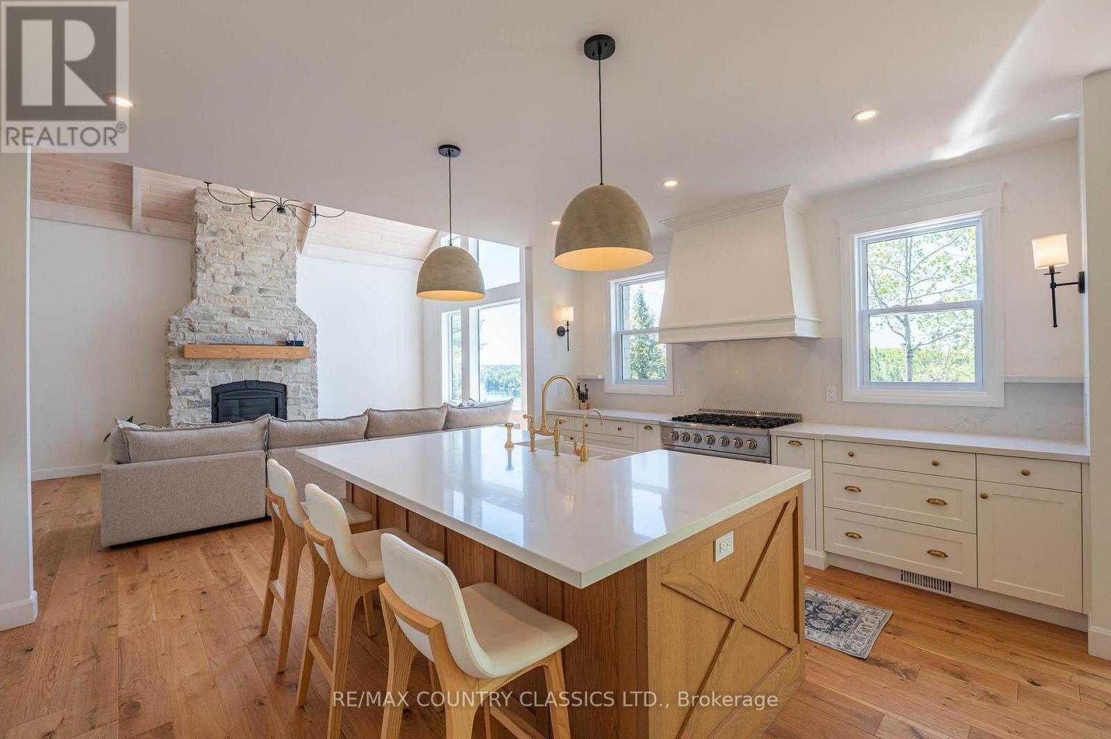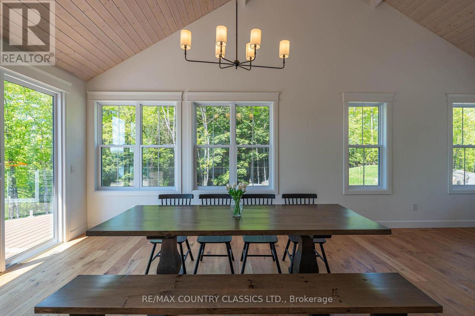 Luxury Lakeside Living at Chandos Lake Estates. Welcome to your dream retreat on the pristine shores of Chandos Lake. Nestled within the exclusive Chandos Lake Estates, this brand-new five-bedroom home offers the perfect blend of modern elegance and natural beauty. Perched on an elevated lot, the property boasts breathtaking panoramic views of the lake, with expansive windows and multiple outdoor living spaces designed to capture every sunrise and sunset. The thoughtfully designed layout features spacious, light-filled interiors, high-end finishes, and seamless indoor-outdoor flow--ideal for both entertaining and quiet relaxation. The gourmet kitchen opens to a grand living area with vaulted ceilings and a stone fireplace, while the primary suite offers a private sanctuary with lake views, a spa-inspired ensuite, and walk-in closet. Four additional bedrooms provide ample space for family and guests. Step outside to enjoy excellent waterfront access, complete with a private dock, deep swimming water, and plenty of space for boating and lakeside activities. Whether you're hosting summer gatherings or enjoying peaceful mornings by the water, this property delivers an unparalleled lakeside lifestyle. Located just minutes from local amenities yet surrounded by nature, this is a rare opportunity to own a slice of paradise in one of North Kawartha's most sought-after communities. (id:64974)
