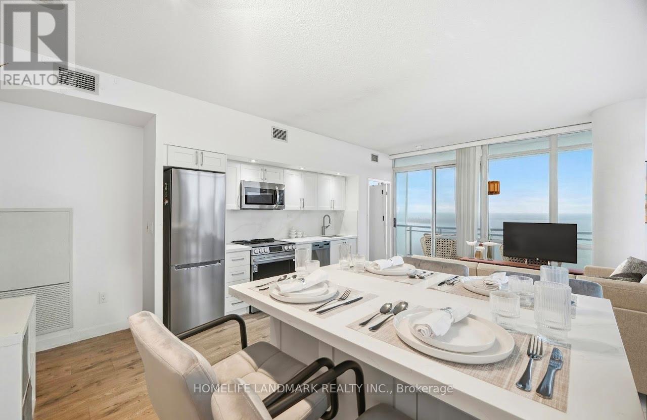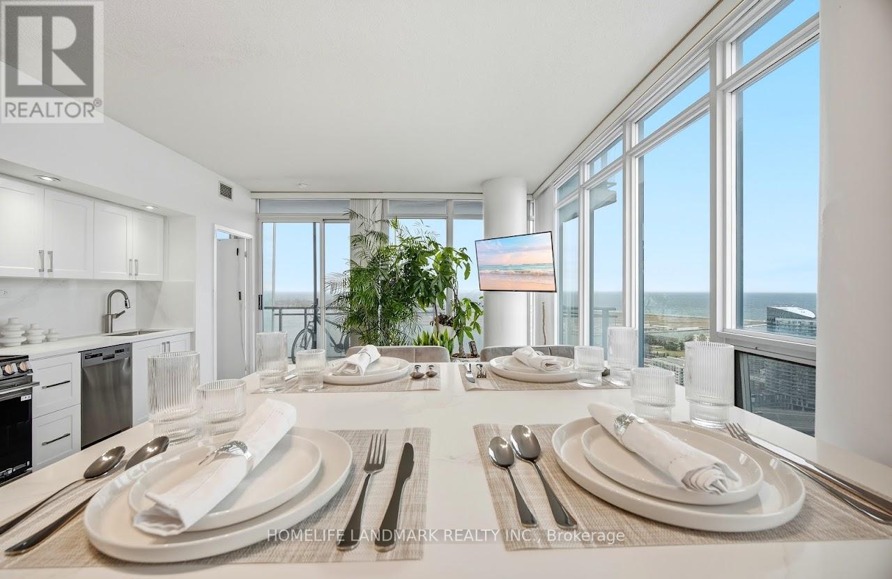 Sophisticated urban living meets thoughtful polished space in this refined 2 bed 2 bath, SouthWest corner suite at Luna Vista Condos in the heart of vibrant CityPlace. 9 ft floor to ceiling windows showcase dramatic city and lake views set against a stunning sunset backdrop that fill the unit with abundant natural light. Offering an open concept design, more than 40K Spent on a brand new designer kitchen with New S.S. Appliances, A brand new Breakfast/Dining Island with Cabinetry, open to the living & dining spaces, ideal for entertaining or everyday living. Modern finishes include laminate flooring (new), Quartz counters, Quartz kitchen backsplash and pot lighting. The spacious primary bedroom has a 4-piece ensuite, closet and a stunning south lake view. The building offers a suite of fantastic amenities including a gorgeous rooftop pool & terrace with panoramic lake views and is located steps to the Harbour front, entertainment & financial districts, TTC, union station, CN Tower, grocery, dining & amenities. This home truly captures the essence of the downtown city lifestyle and stylish living. 1 owned parking, ensuite laundry, rooftop infinity pool/hot tub w/cabanas & striking lake view, 2BBQ terraces, fitness room + gym & sauna, party room, 24 hour concierge, visitor parkings, + guest suites. Recently modernized common areas. (id:64974)