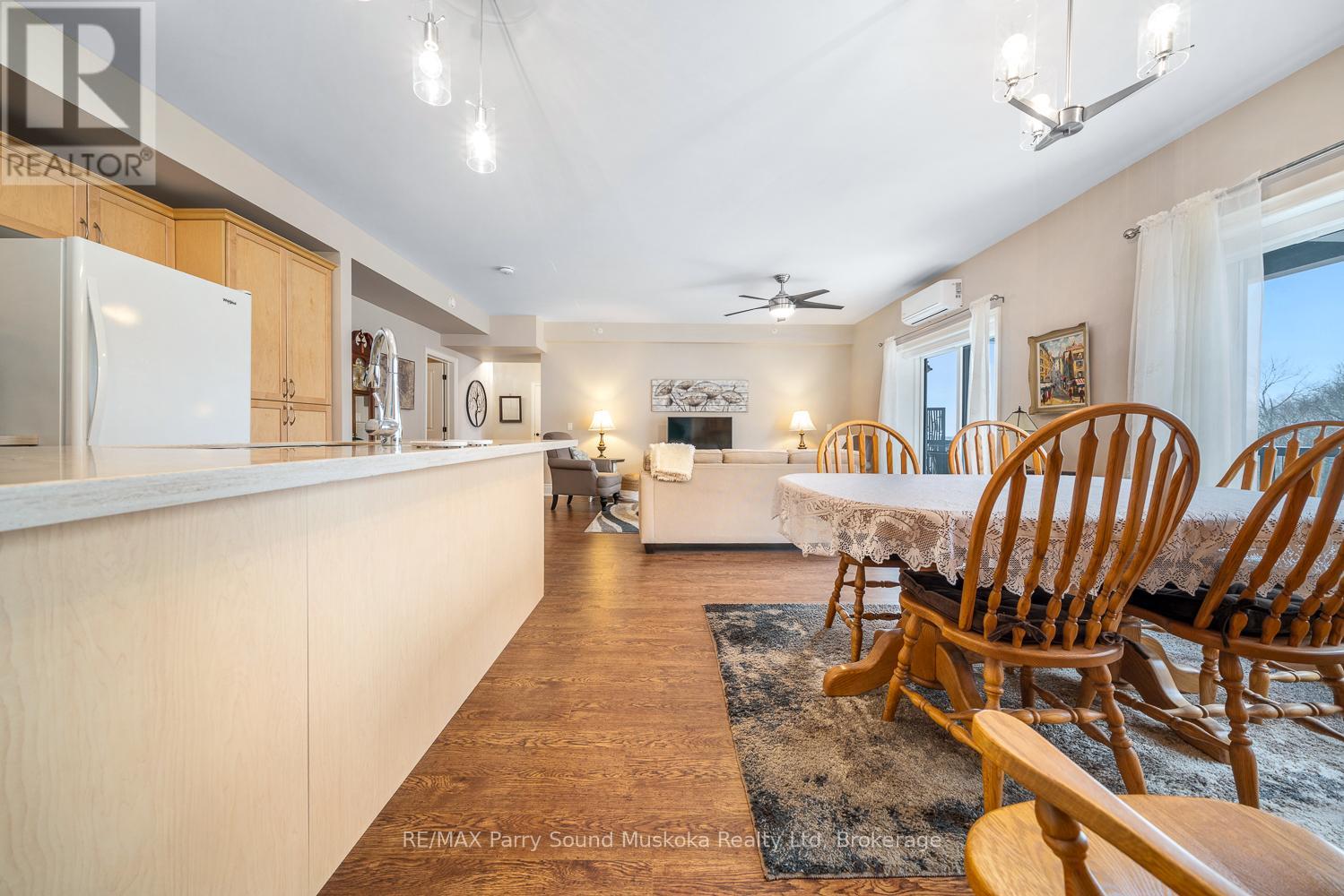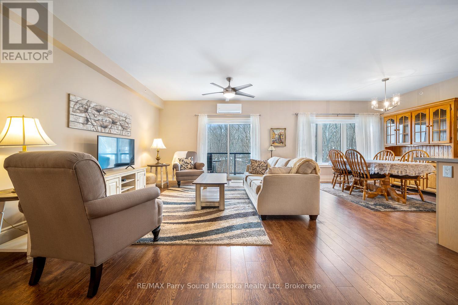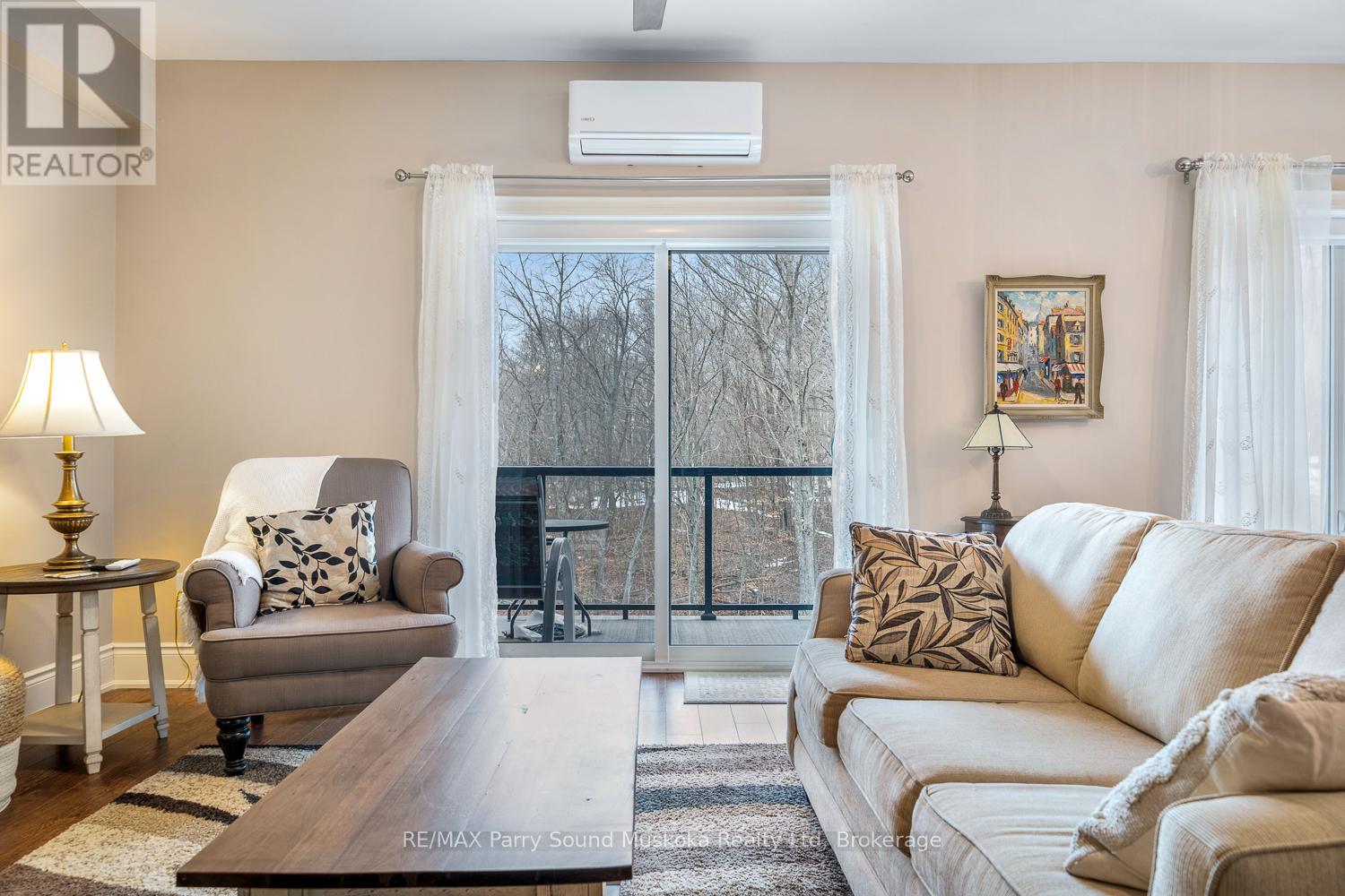 Easy, low-maintenance living with this well-appointed 2-bedroom, 2-bathroom "The Keystone's" condo offering 1,156 square feet of thoughtfully designed space. Inside, the layout offers a comfortable flow between living, dining, and kitchen areas, ideal for both everyday living and hosting guests. The two full bathrooms add convenience and flexibility, while the generous primary suite serves as a relaxing retreat. Year-round comfort is ensured with an in-floor radiant heating system powered by natural gas, as well as air conditioning throughout the unit. Situated to capture beautiful views of Georgian Bay, the private balcony provides the perfect setting to unwind, entertain, or simply take in the ever-changing scenery. In-suite laundry, elevator access, underground parking, and an exclusive storage unit all make this unit carefree living. Whether you're looking to downsize, invest, or enjoy a carefree lifestyle close to the water, this condo offers a great combination of space, comfort, and scenic surroundings in one of Parry Sound's most desirable waterfront communities. (id:64974)