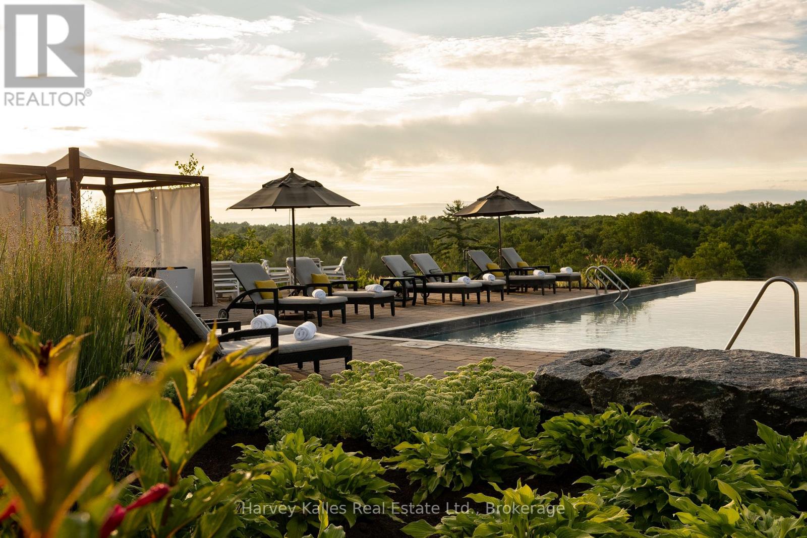 Welcome to life at Muskoka Bay Resort, where luxury, an active lifestyle, and investing come together perfectly. Ideally positioned with southwest views, this premier corner suite offers sweeping views of the Doug Carrick-designed golf course, consistently ranked amongst Canada's top golf courses. This turn-key 733 sq ft unit features 2 bedrooms and 2 bathrooms, including the primary suite with a 3-piece ensuite, and a guest bedroom with a 4-piece guest bath. Impressive ceiling height and an open-concept design with large windows flood the space with natural light, creating an airy feel that far exceeds its footprint. Whether you're unwinding after a round or hosting weekend guests, this condo delivers comfort with a touch of Muskoka sophistication. Ownership here comes with a standout advantage - initiation fees to Muskoka Bay Club are included, granting you immediate access to one of Canada's premier golf destinations. While an annual membership is required, it unlocks a full suite of resort-style amenities, including an infinity pool, fitness studio, tennis court, trails and more. The clubhouse also hosts Cliffside Restaurant with an entertainment lounge. From an investment perspective, this opportunity is hard to beat. Muskoka Bay Club's fully managed rental program offers hands-free income potential, complete with concierge booking, guest services, and professional cleaning. Enjoy your unit when you choose, and let the Club handle the rest. A dedicated storage locker adds everyday convenience, perfect for golf clubs or personal items when renting. Located just minutes from Gravenhurst, The Wharf and surrounded by some of Muskoka's most sought-after lakes, dining, and amenities, this property offers endless recreation, ultimate relaxation, and optional return on investment. Play more. Worry less. Invest wisely. (id:64974)