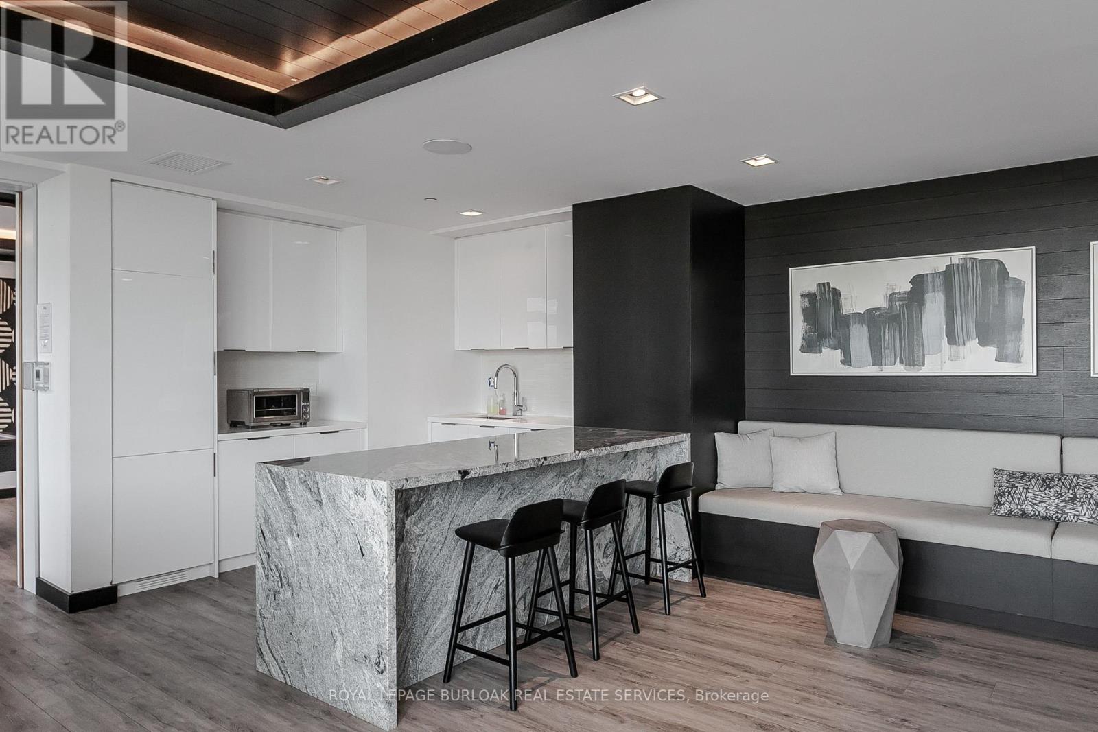 Experience elevated downtown living in one of Burlington's most sought-after residences. Set within the prestigious Berkeley Condos, this hotel-inspired suite offers a refined, low-maintenance lifestyle in the heart of the city-just steps from the waterfront, Spencer Smith Park,boutique shopping, top-rated restaurants, cafés, and vibrant year-round events. Whether it's morning walks along the lake or evenings outdowntown, this location delivers the ultimate lifestyle experience. Inside, 9' ceilings and rich hardwood flooring create a seamless, upscale feelt hroughout. The modern eat-in kitchen is designed to impress, featuring granite countertops, a tile backsplash, stainless steel appliances with range hood, and a spacious island with breakfast bar-perfect for casual dining or entertaining. The bright living room is anchored by an oversized window and walkout to a private balcony, where you can unwind with beautiful lake views as your backdrop. The primary bedroom offers a peaceful retreat, complete with a 4-piece ensuite featuring a walk-in glass shower and separate tub. An additional bedroom/ Den with stylish barn doors provides an ideal space for guests or a home office, complemented by a sleek 3-piece main bath with walk-in shower. This unit also includes one parking space, a super-sized locker conveniently located next to the parking space, plus an additional locker on the same floor-offering exceptional storage rarely found in condo living. Residents of this upscale building enjoy access to premium amenities including a 24-hourconcierge, fully equipped fitness centre, elegant party and games room, guest suites for overnight visitors, and a stunning rooftop terrace with breathtaking panoramic views of the lake and city skyline. An exceptional opportunity for professionals, downsizers, or anyone seeking a sophisticated, walkable lifestyle in one of Burlington's most vibrant and connected (id:64974)