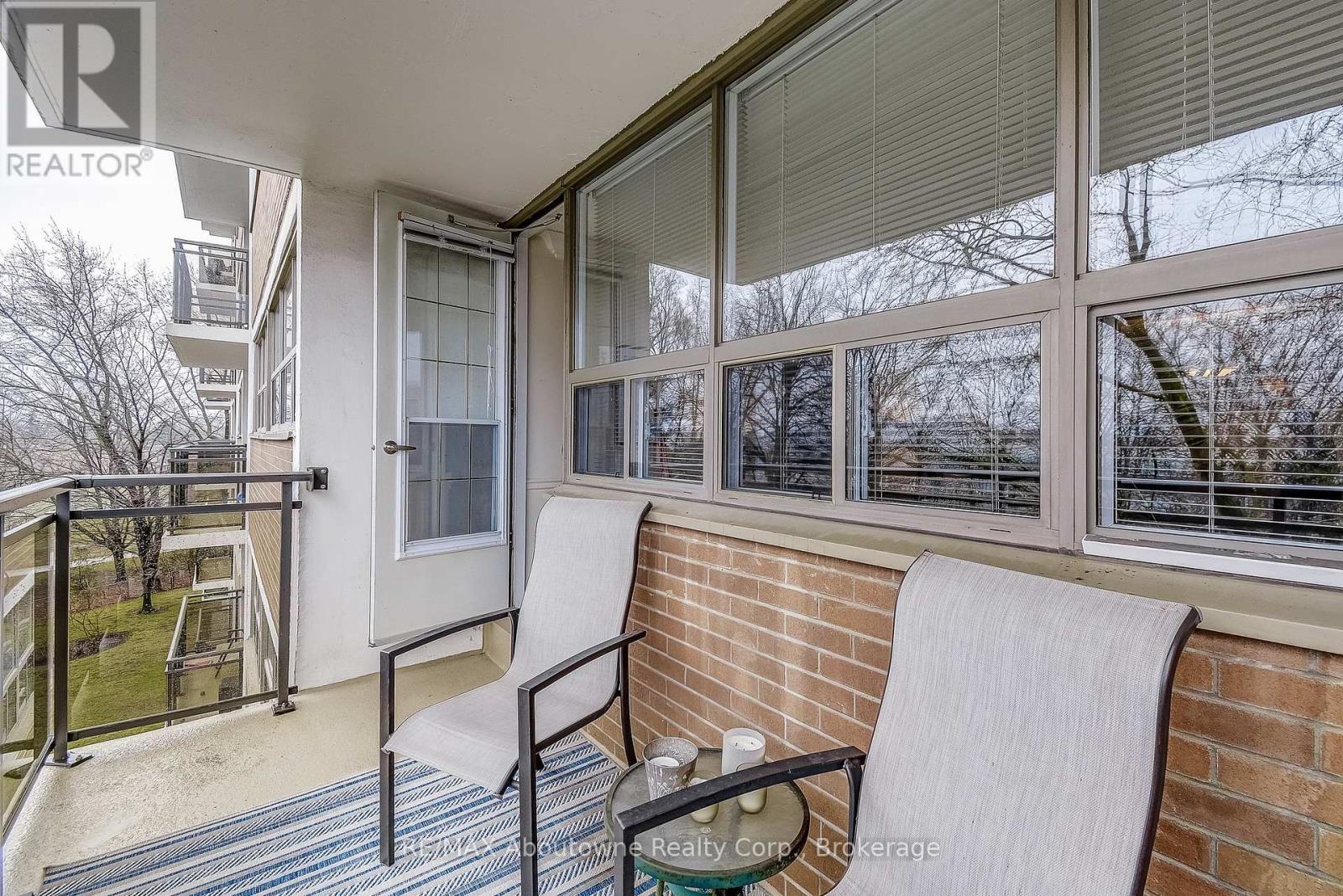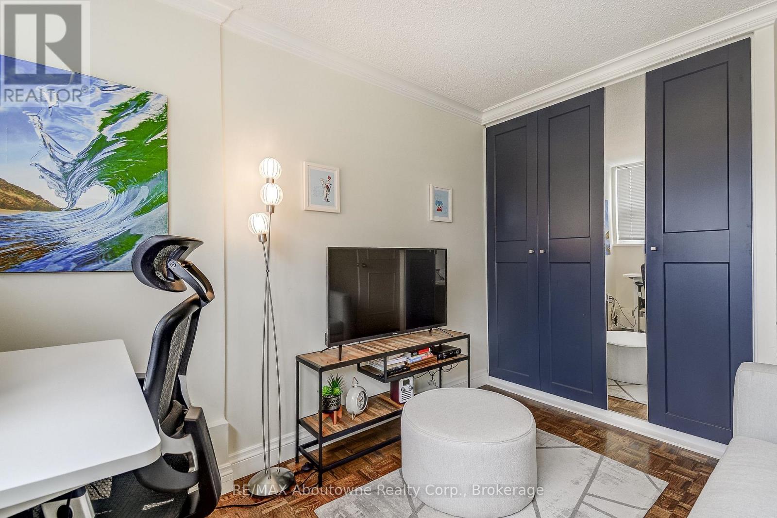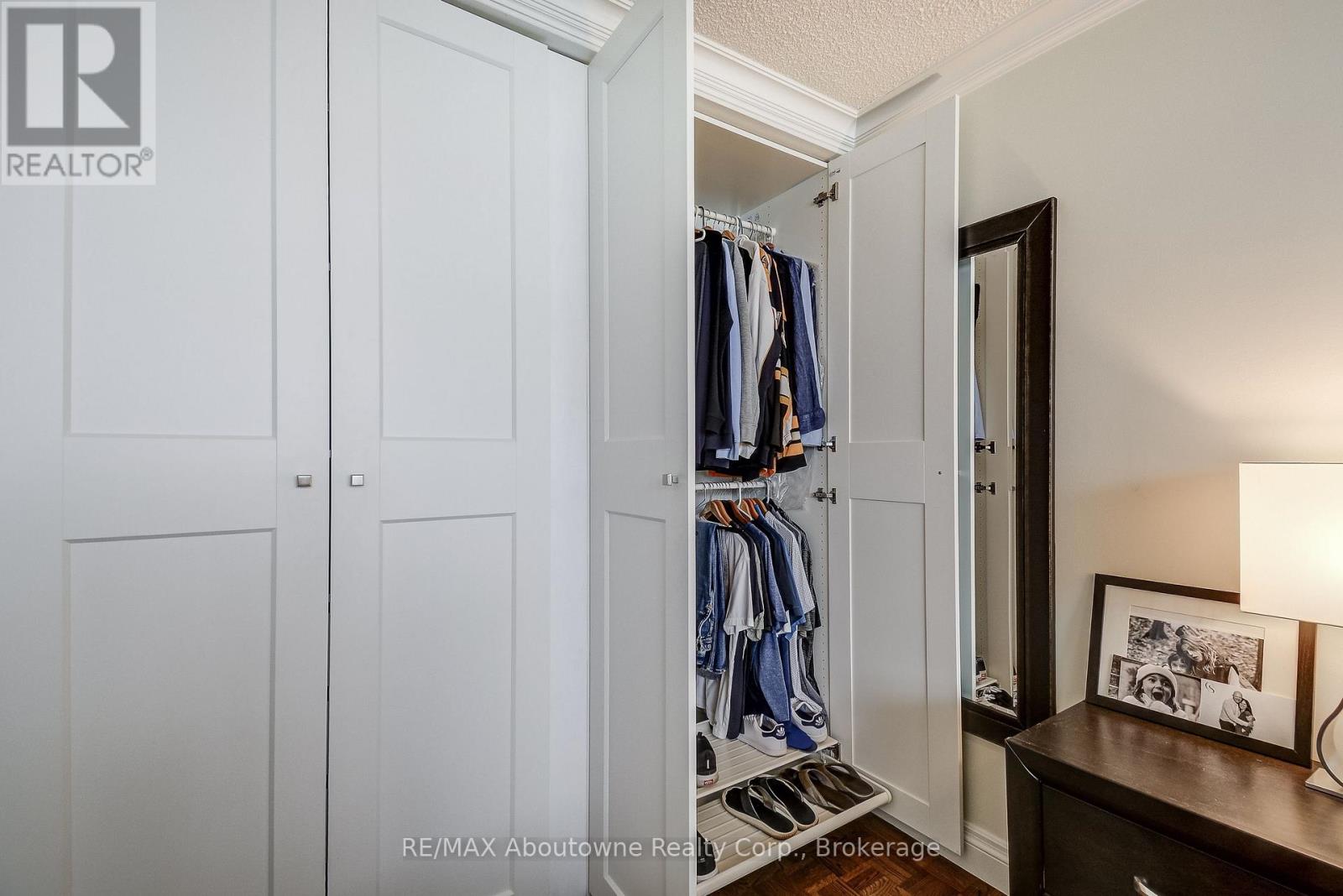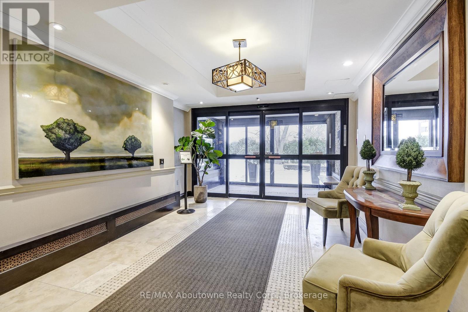 Welcome to this charming end-unit condo in the desirable Arbor Glen community. Tucked back from Kerr Street and surrounded by lush greenery, this building offers a peaceful setting while still being in the heart of vibrant Kerr Village. Enjoy convenient access to boutique shopping, restaurants, parks, and a near-by community centre-just minutes from the lake, downtown Oakville, and a Marina. A grocery store is only steps away. This bright and spacious 2-bedroom condo (approximately 960 sq. ft.) features a large open-concept living and dining area with warm hardwood floors, elegant wainscoting, and crown molding throughout. The updated interior includes beautiful custom closets in the hallway and both bedrooms, complete with built-in drawers and organizers for optimal storage. The kitchen showcases white cabinetry and quartz countertops, offering both style and functionality. Two generously sized bedrooms and a well-appointed 4-piece bathroom complete the interior. The hallways were recently renovated with porcelain tiles, carpet & tasteful wallpaper. Additional features include ensuite storage and a spacious balcony offering tranquil views of lush greenery. The unit comes with one underground parking space (A6) equipped with a **LEVEL 2 EV OUTLET**. Residents have access to a well-designed bicycle room and ample visitor parking, available both underground and outdoors. Impeccably maintained, this spacious and bright unit is an ideal home for a wide range of buyers. Convenient access to transit, highways, and all amenities makes this a truly exceptional opportunity. (id:64974)