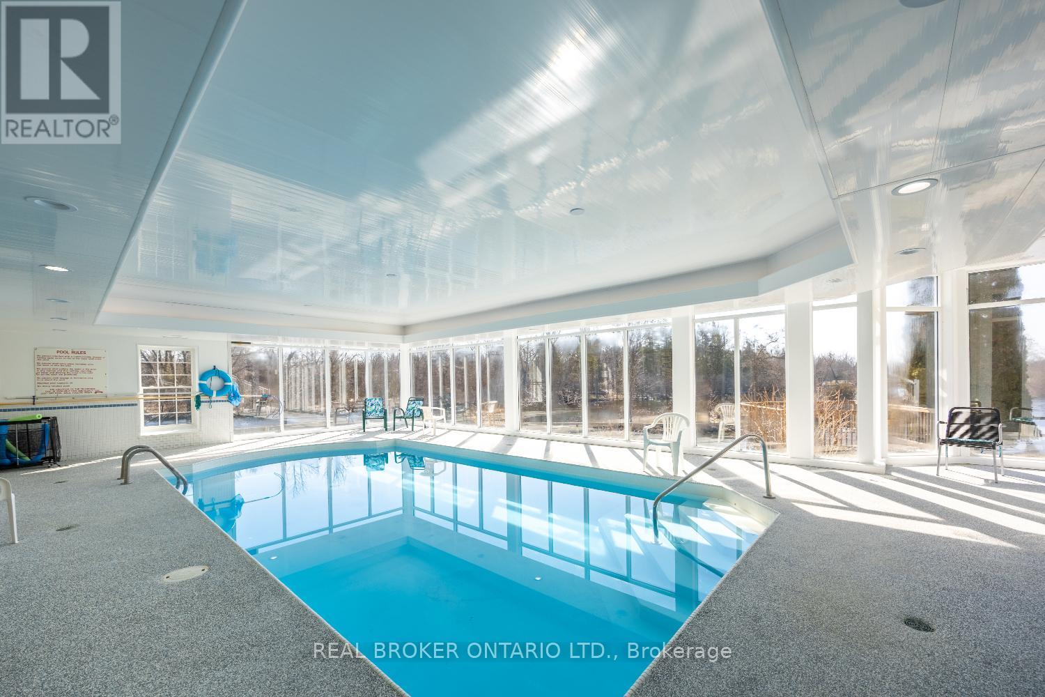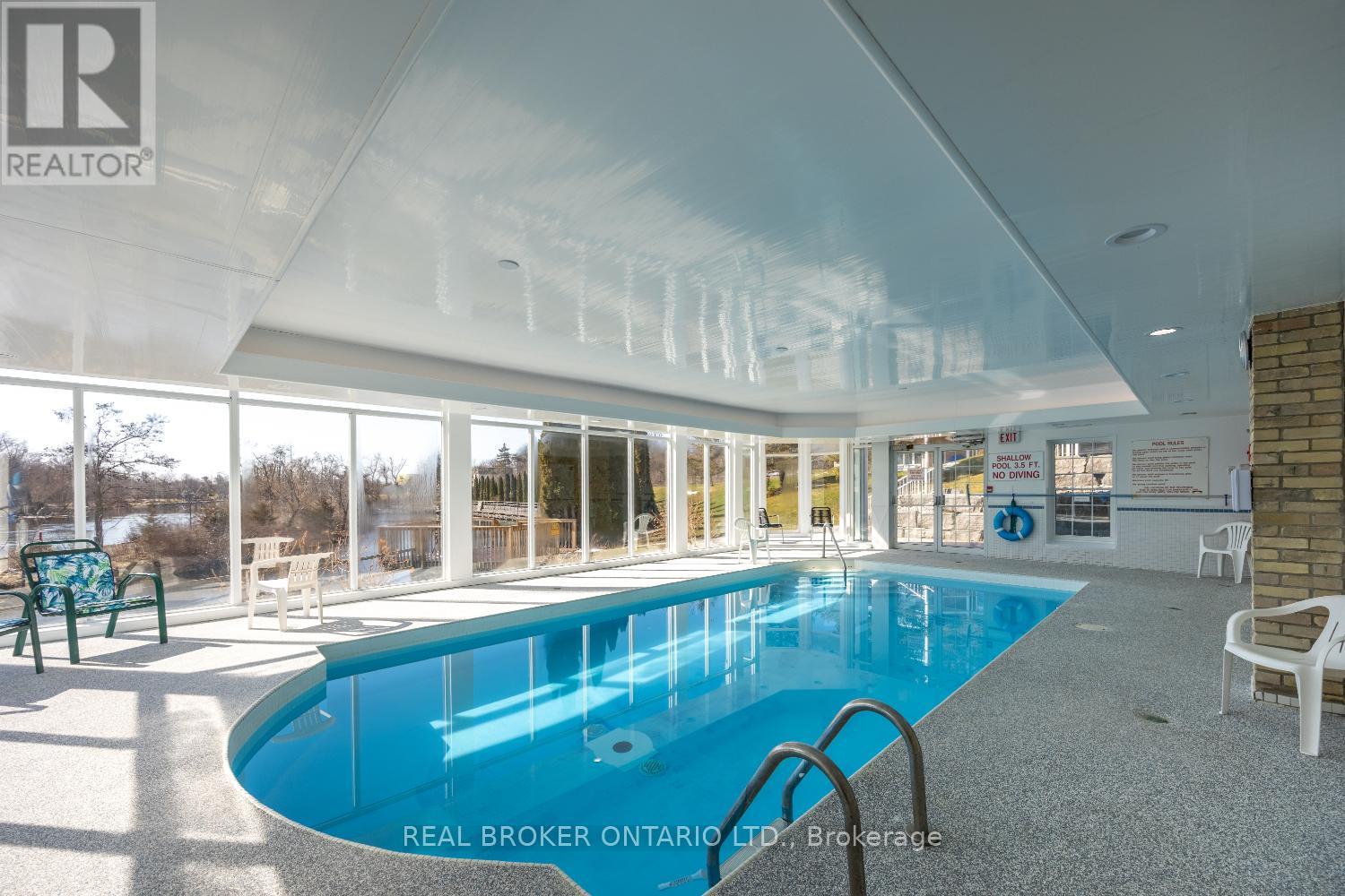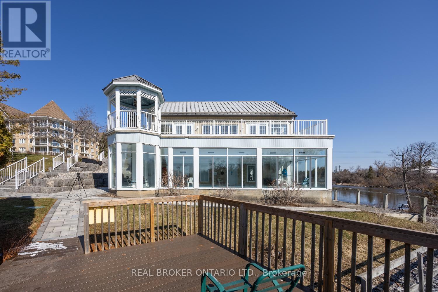 A rare penthouse find with wrap around balcony and spectacular views of the Scugog River. This impressive 3 bedroom unit offers approximately 1,705 sq ft of elevated, light-filled living space. From the moment you step inside, the spacious foyer with laminate flooring and crown moulding sets an elegant tone. The eat-in kitchen is designed for both everyday living and entertaining, featuring laminate flooring, a backsplash, pot lighting, tray ceiling, and a walk-out to the balcony that is perfect for soaking in the serene river views. Host guests in the formal dining room, complete with rich hardwood flooring and French doors. The showpiece of the home is the stunning octagon shaped living room, where walls of windows flood the space with natural light from the eastern exposure. Hardwood floors and a seamless walk-out to the oversized balcony create an unforgettable setting to relax or entertain while overlooking the water. The primary bedroom is a private retreat, highlighted by a cathedral ceiling, his and hers double closets, and an updated 3pc ensuite with a walk-in shower. Two additional bedrooms continue the impressive design with cathedral ceilings and hardwood flooring. One offers a massive, walk-in closet and its own private balcony access. A 4pc main bathroom and in-unit laundry room add everyday convenience. Enjoy maintenance free living with fees that include heat, hydro, and water, along with access to a well appointed clubhouse featuring an indoor pool, party room, games room, fitness area, and outdoor patio. Complete with two underground parking spaces, a locker, and visitor parking, this exceptional penthouse is perfectly situated close to all Lindsay amenities. A rare opportunity to own a spacious, sun filled condo with breathtaking river views, this is condo living at its finest. *Boat slip is first come first serve for approx $600/yr. (id:64974)