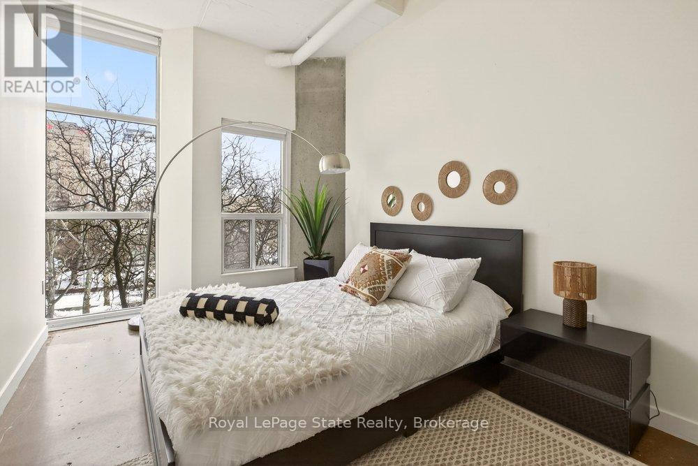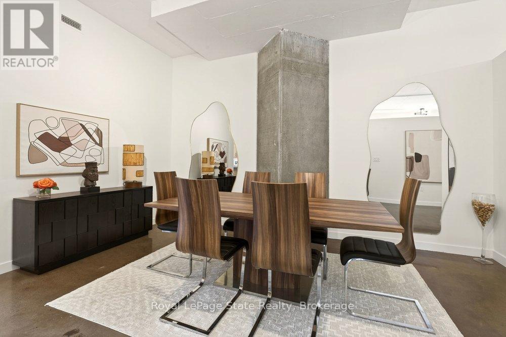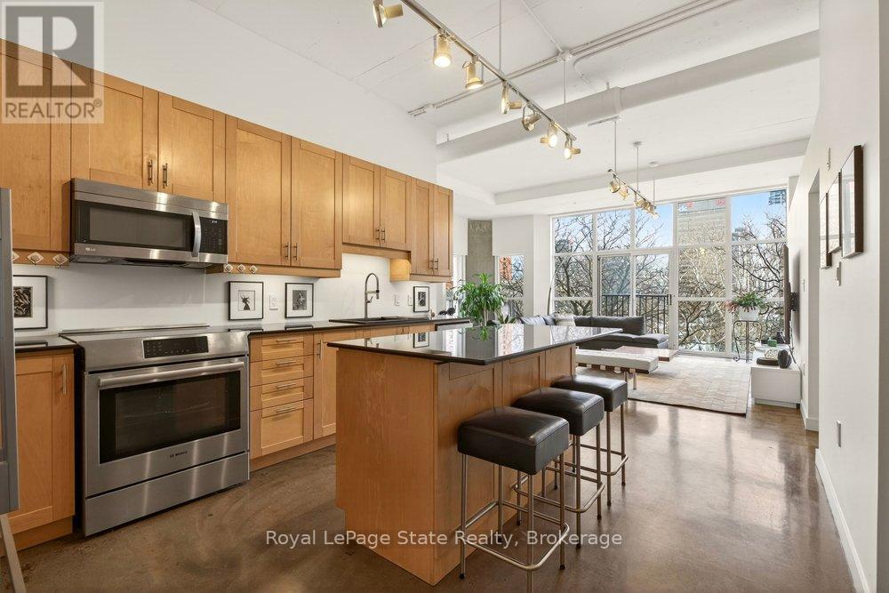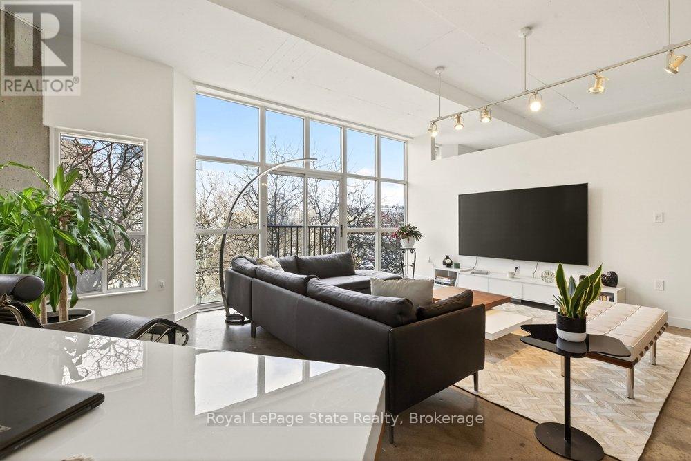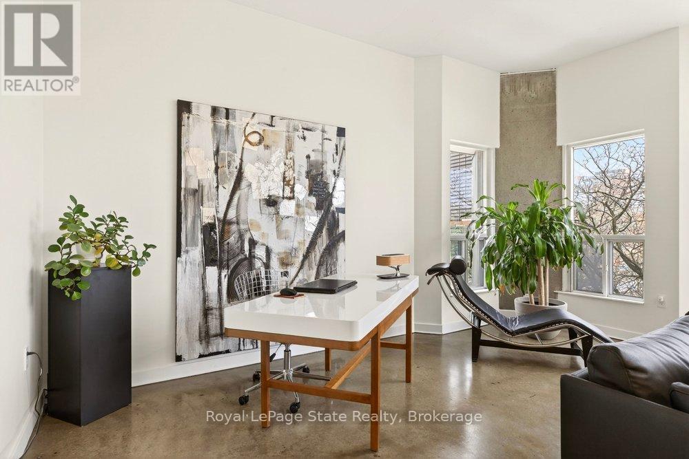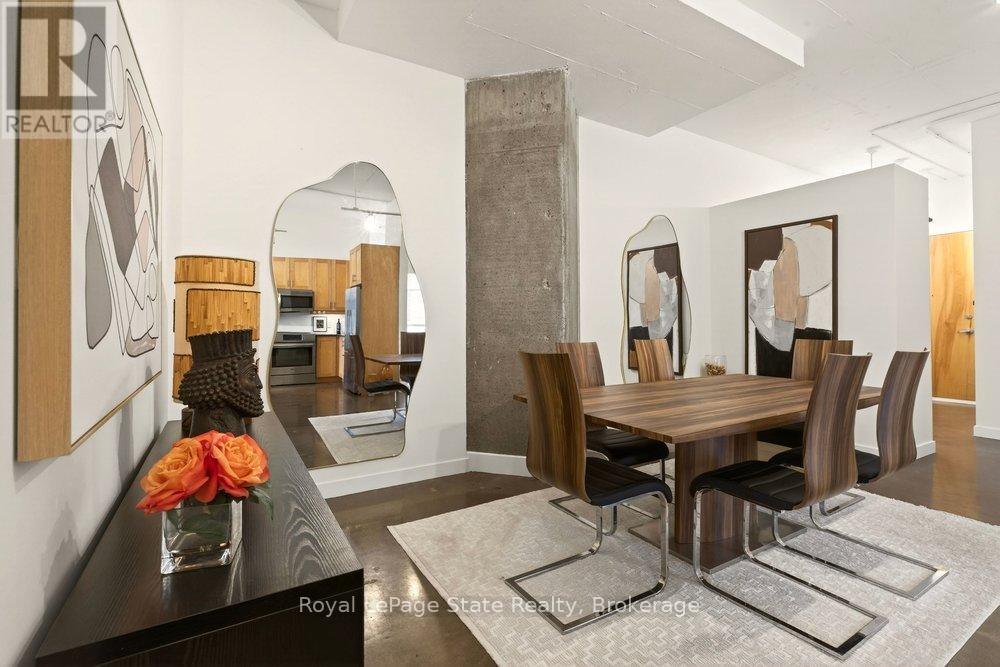 Welcome to Unit 401 at Core Lofts - a stunning corner suite in the heart of downtown Hamilton. Offering just over 1,500 sq ft of open-concept living space, this 2 bedroom, 2 bathroom loft combines industrial character with modern comfort. Featuring 10+ foot ceilings, polished concrete floors, and expansive floor-to-ceiling windows with desirable east and north exposures, this bright and airy unit is flooded with natural light. The spacious kitchen is equipped with granite countertops, stainless steel appliances, and a large island with granite surface, ideal for entertaining. The primary bedroom features floor-to-ceiling windows with custom window coverings and a beautifully appointed ensuite complete with a stand-up shower and soaker tub. The second bedroom offers flexibility for guests, office space, or additional living needs. The unit is tastefully decorated and can be purchased fully furnished. One parking space and a storage locker are included. Building amenities including a gym, meeting/party room, and a rooftop terrace with BBQs and seating areas. Located steps to Hess Street, Locke Street, King William dining district, Jackson Square, and the new TD Coliseum. Enjoy easy access to restaurants, cafés, shopping, entertainment, Bayfront Park, GO Transit, and major highway access. Experience convenient downtown living in one of Hamilton's most desirable loft buildings. (id:64974)