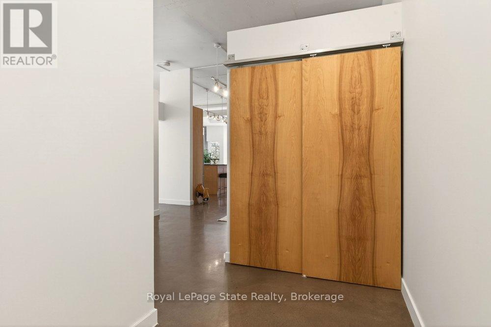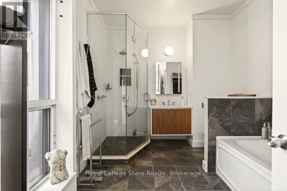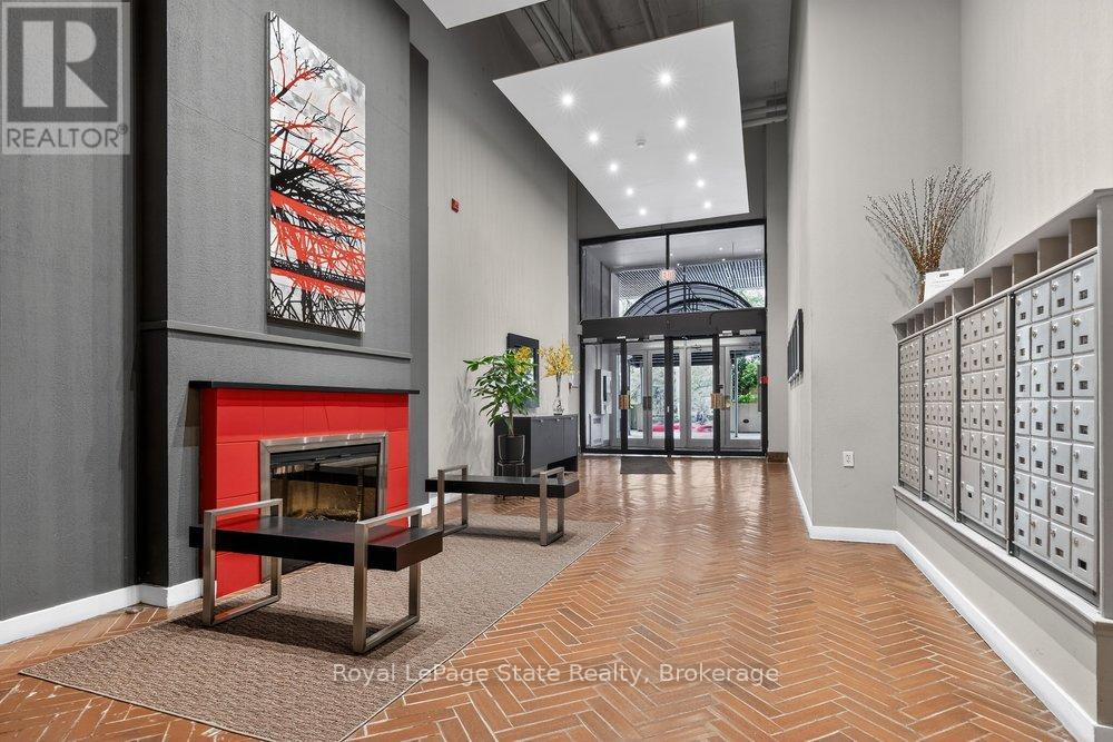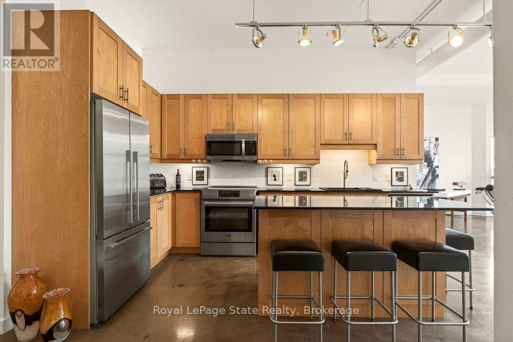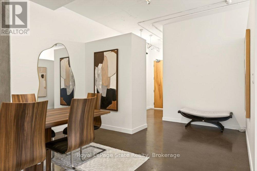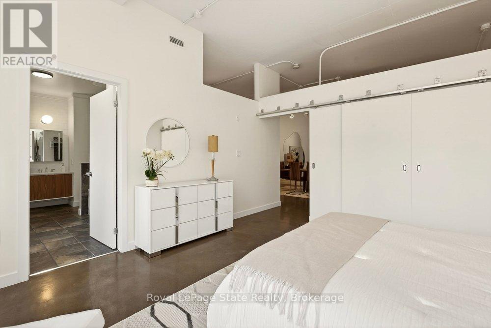 Welcome to Unit 401 at Core Lofts - a stunning corner suite in the heart of downtown Hamilton. Offering just over 1,500 sq ft of open-concept living space, this 2 bedroom, 2 bathroom loft combines industrial character with modern comfort. Featuring 10+ foot ceilings, polished concrete floors, and expansive floor-to-ceiling windows with desirable east and north exposures, this bright and airy unit is flooded with natural light. The spacious kitchen is equipped with granite countertops, stainless steel appliances, and a large island with granite surface, ideal for entertaining. The primary bedroom features floor-to-ceiling windows with custom window coverings and a beautifully appointed ensuite complete with a stand-up shower and soaker tub. The second bedroom offers flexibility for guests, office space, or additional living needs. The unit is tastefully decorated and can be purchased fully furnished. One parking space and a storage locker are included. Building amenities including a gym, meeting/party room, and a rooftop terrace with BBQs and seating areas. Located steps to Hess Street, Locke Street, King William dining district, Jackson Square, and the new TD Coliseum. Enjoy easy access to restaurants, cafés, shopping, entertainment, Bayfront Park, GO Transit, and major highway access. Experience convenient downtown living in one of Hamilton's most desirable loft buildings. (id:64974)