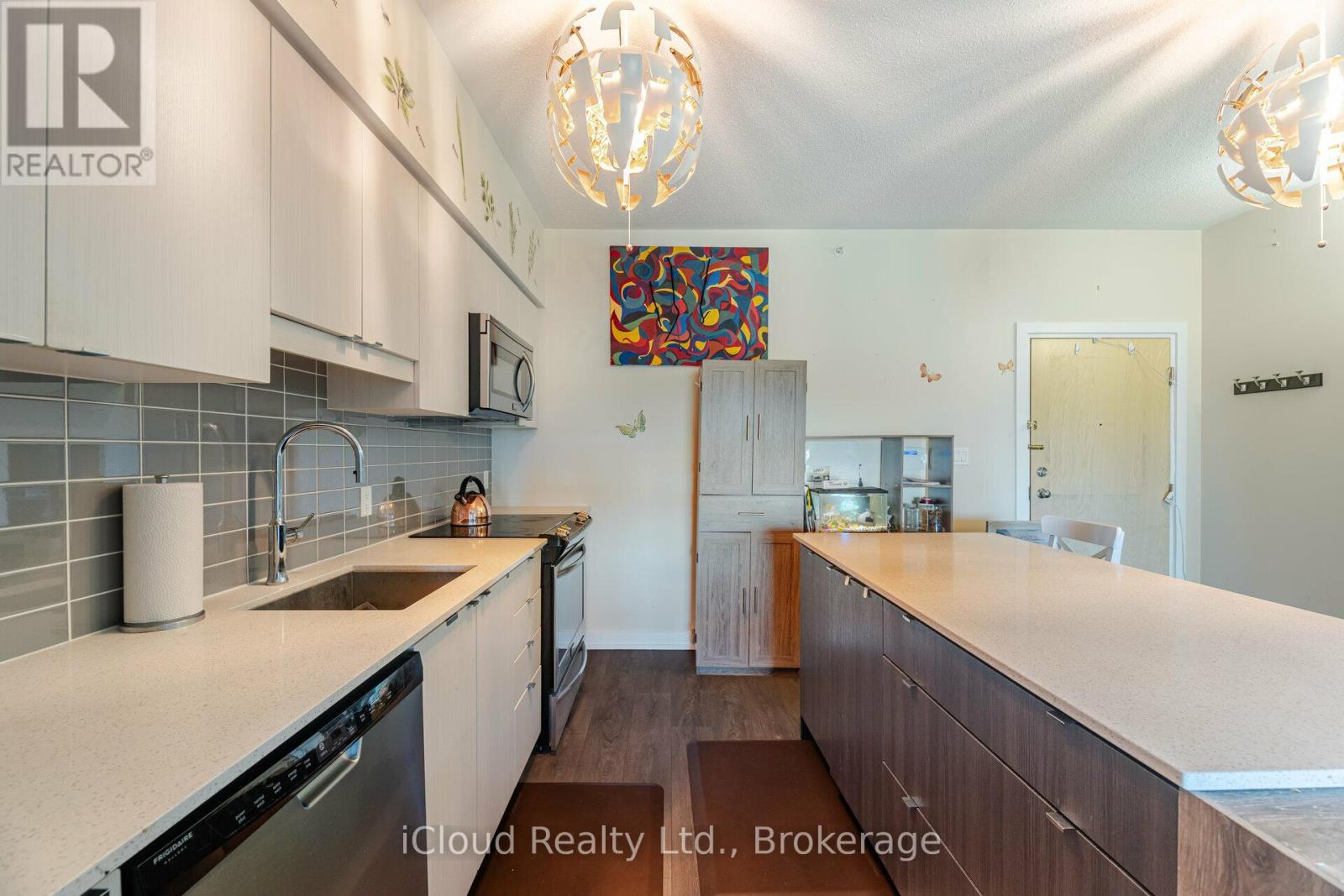 Generously Sized, Over 800 sqft Open Concept 1 Bedroom unit on the TOP Floor. No One Above! From the Living Room, Primary Bedroom and the Covered Balcony, Enjoy the Beautiful Tranquill View of the Trees and Beyond. The kitchen has, plenty of Cupboards, a Backsplash, Quartz Countertops and an Oversized Island with Breakfast Bar. Includes Stainless Steel Kitchen Appliances and White Washer & Dryer! High Ceilings Throughout. Convenient Full In Suite Laundry Facilities. Carpet Free with Laminate Flooring. Air Conditioning. Quite Sought After Building Located so Close to Amenities. Just a Convenient Walk or Short Drive Away. Honda is about a 5 minute drive and approx. a 15 min drive to the 400. A few photos have been virtually staged. (id:64974)