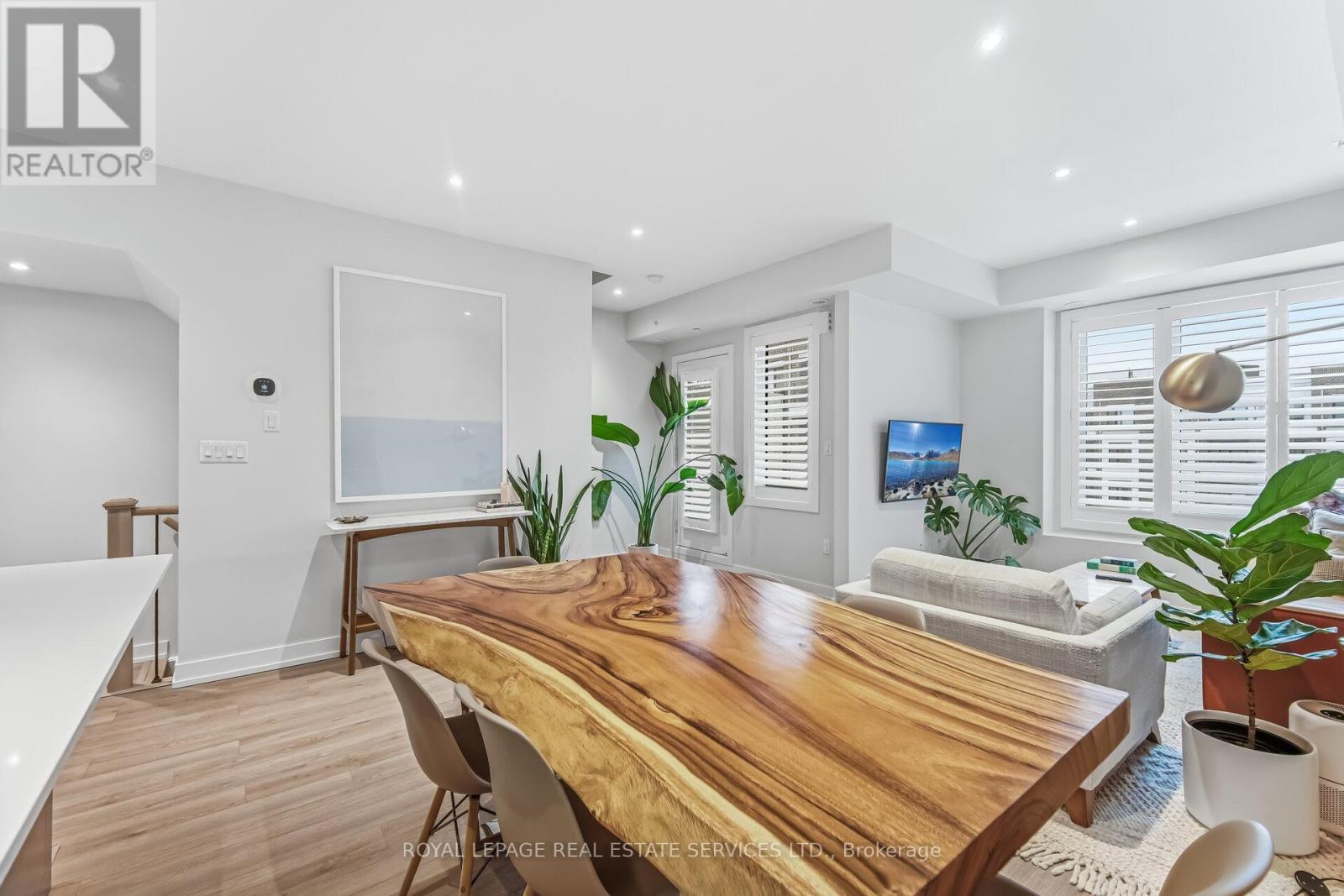 Bright and spacious end unit 2 bedroom, 3 bathroom home offering over 1,200 sq ft of functional living space in the heart of Mimico. With windows on both sides, the home is filled with natural light throughout the day. The open-concept main floor is designed for comfortable everyday living and easy entertaining, featuring quartz countertops, a generous peninsula, oversized kitchen cupboards, pot lights throughout, and custom California shutters. Step out to a private balcony off the living room for added outdoor space. Upstairs, the spacious primary bedroom includes its own balcony, two generous closets, and an ensuite bath. A well-sized second bedroom, additional full bathroom, and convenient second-floor laundry complete the upper level. Enjoy a large rooftop terrace, perfect for relaxing or hosting guests. Located just steps from the GO Train and TTC, this home offers exceptional convenience with easy access to shops, parks, restaurants, coffee shops, and the waterfront. (id:64974)