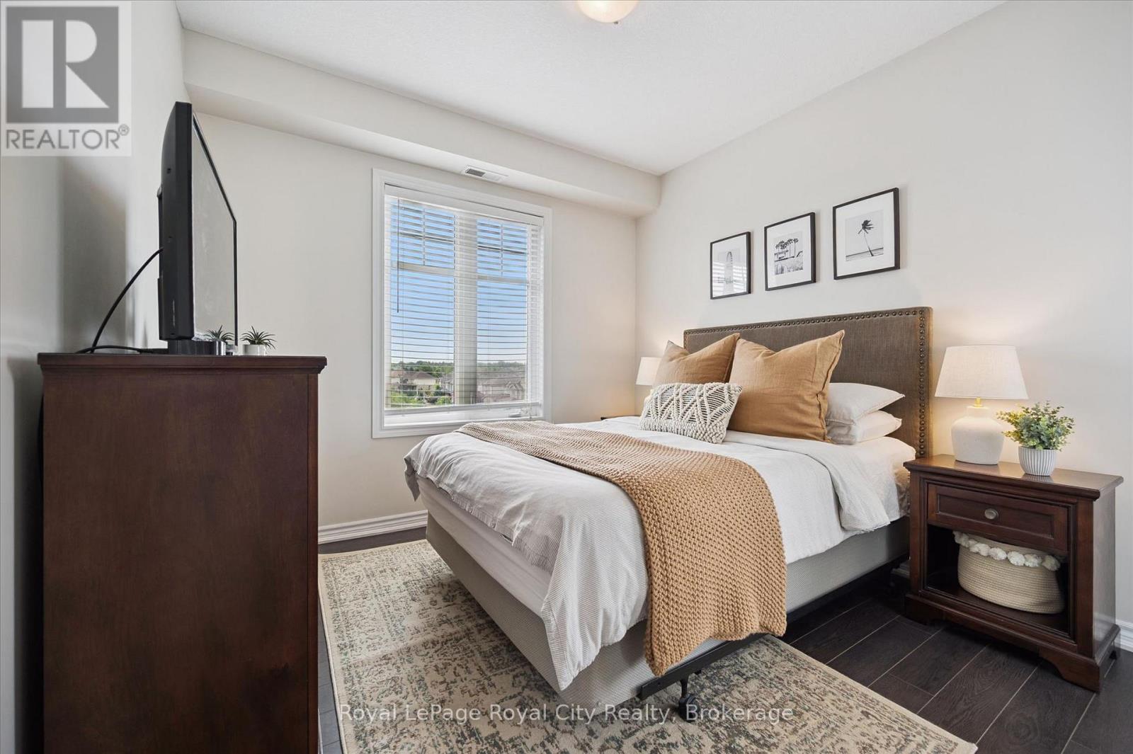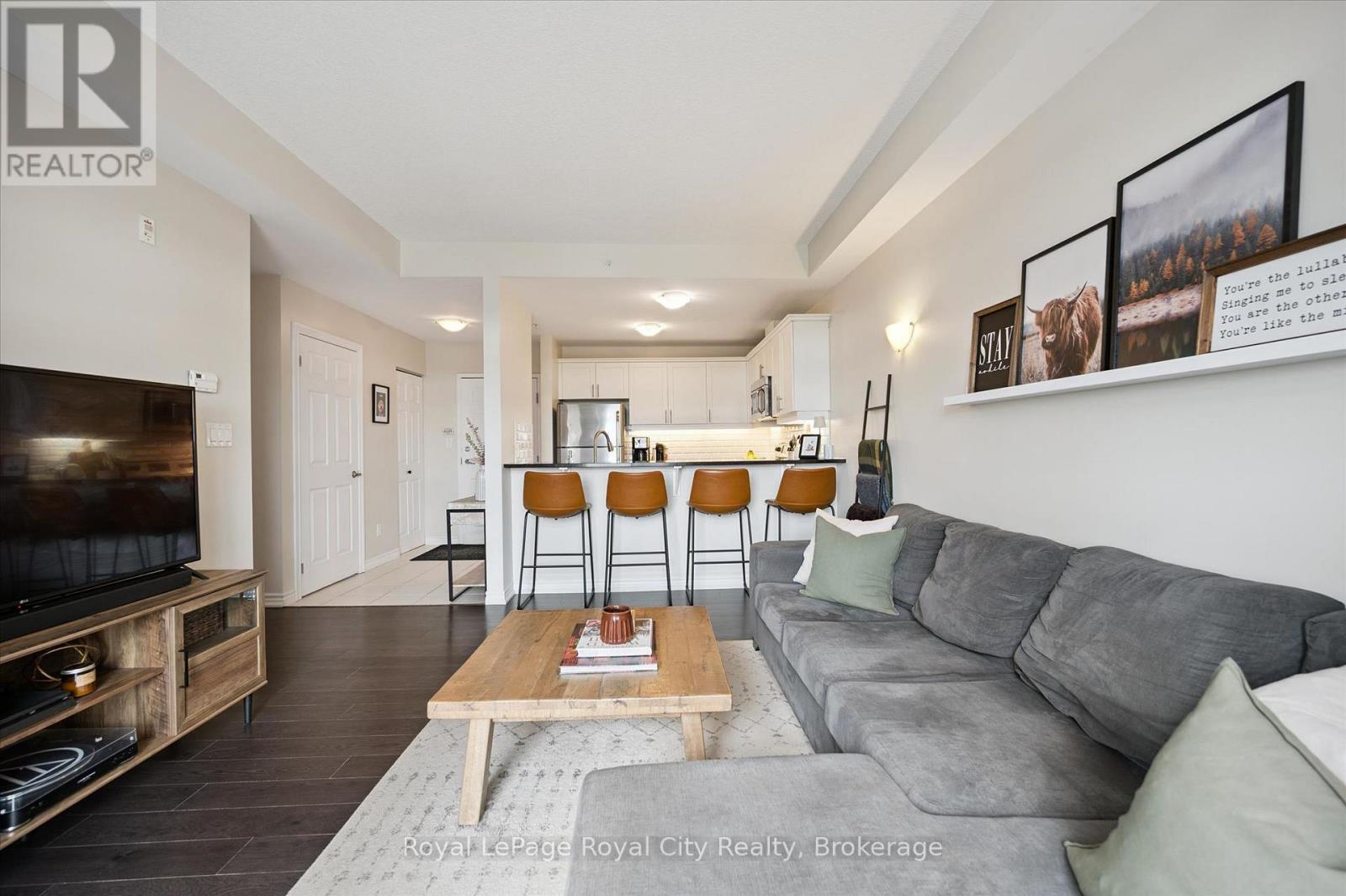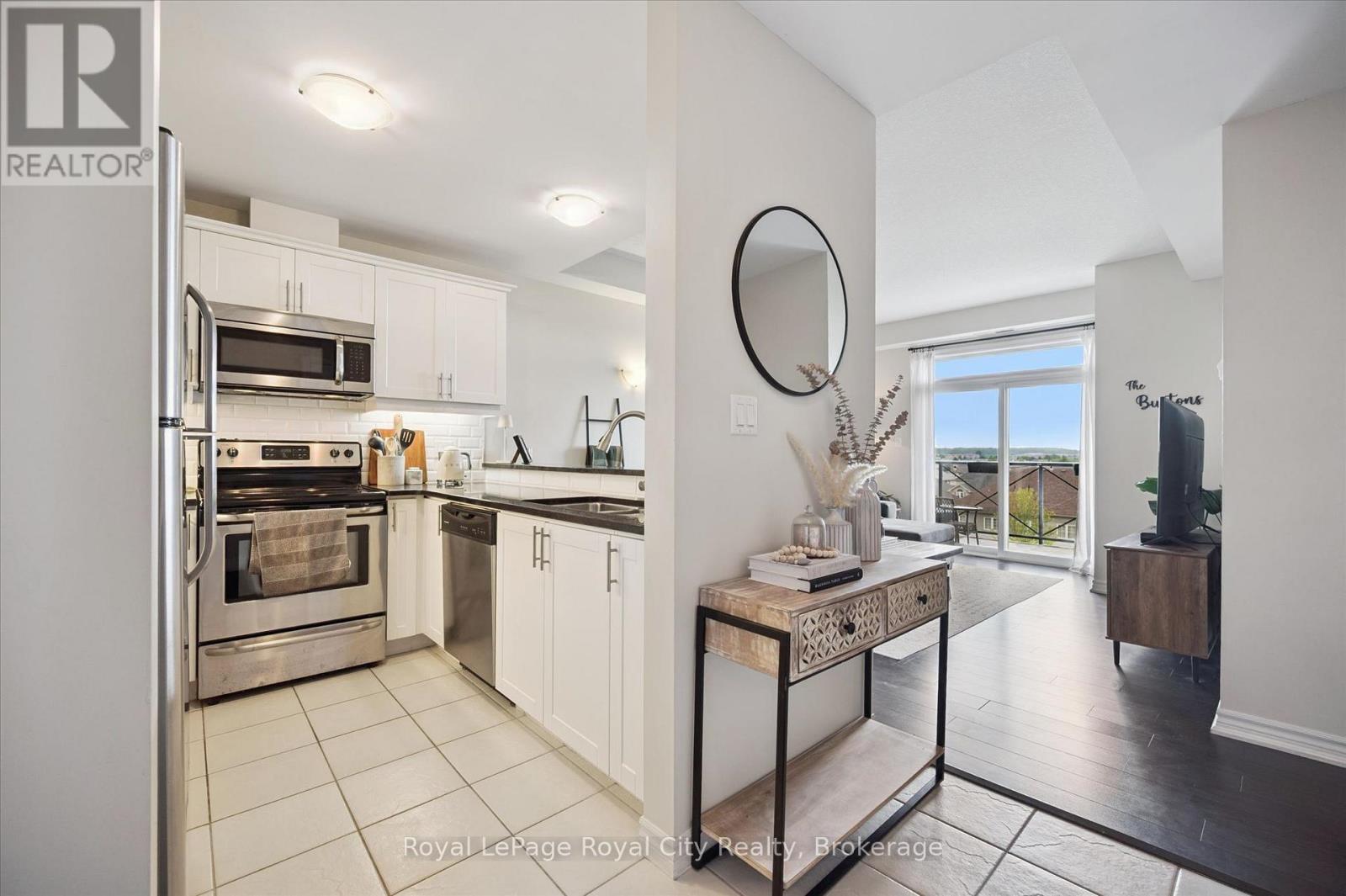 Absolutely gorgeous and move-in ready! This bright, stylish top floor, end-unit South End Guelph condo is dressed to impress with granite countertops, wood-look flooring, and soft, neutral finishes that make decorating a breeze. Offering over 810 sq. ft., it features two bedrooms and two full bathrooms, including a lovely primary suite with its own ensuite and a glass-enclosed shower. The open-concept layout feels fresh and inviting perfect for hosting friends with an updated kitchen complete with stainless steel appliances and a chic backsplash overlooking the living and dining area. Step through the patio doors to your private balcony, ideal for morning coffee or unwinding after a long day. Youll also enjoy an underground parking spot, plus building perks like a well-equipped gym, event/party room, and plenty of visitor parking. Just minutes from the University of Guelph, everyday conveniences, and the 401, its a beautiful choice for both homebuyers and investors. (id:64974)