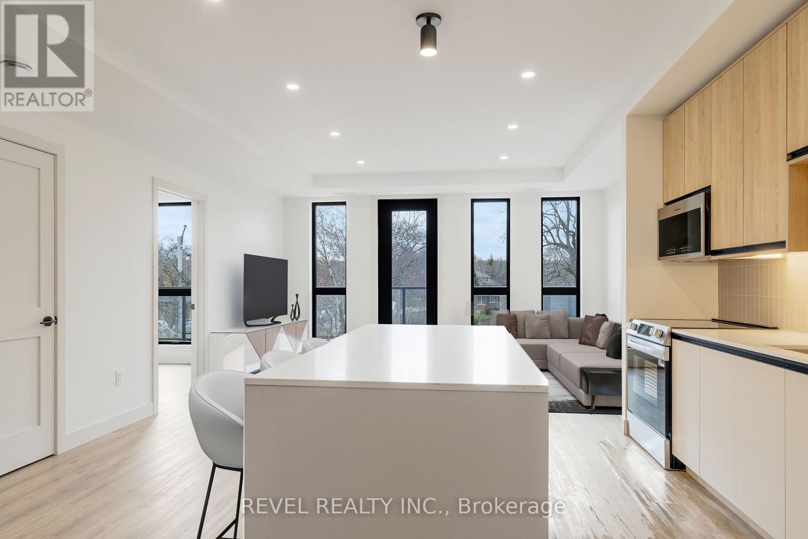 Experience modern living at The Madera with assigned secured/heated parking, smart home technology, and instant high-speed internet (included in rate from Cogeco) throughout the building. This pet-friendly community offers a safe and welcoming environment for those tenants seeking an upgraded lifestyle. This development offers modern interiors featuring luxury vinyl tile (LVT) in the foyer, kitchen, and living areas, with ceramic tile bathroom floors and tub/shower surrounds. Floor-to-ceiling windows, private balconies, and in-suite laundry are included in every unit, with two-bedroom layouts offering a tub in the main bath and a stand-up shower in the ensuite. Kitchens are equipped with large islands and quartz countertops, custom soft-close cabinetry, polished quartz counters with under mount stainless steel sinks and pull-down faucets, tiled backsplashes, under cabinet LED lighting, and a full stainless steel appliance package including dishwasher and microwave. Mechanical and plumbing features include air-source VRF heating and cooling, ERVs in each unit, modern plumbing fixtures, domestic hot water provided by an air-source heat pump, and a high-efficiency electric water heater. The building is finished with pot lights throughout, stylish flush-mount fixtures in living/dining areas and bedrooms, a TV-ready living room wall, and energy-efficient LED lighting across all common and private spaces (id:65010)
