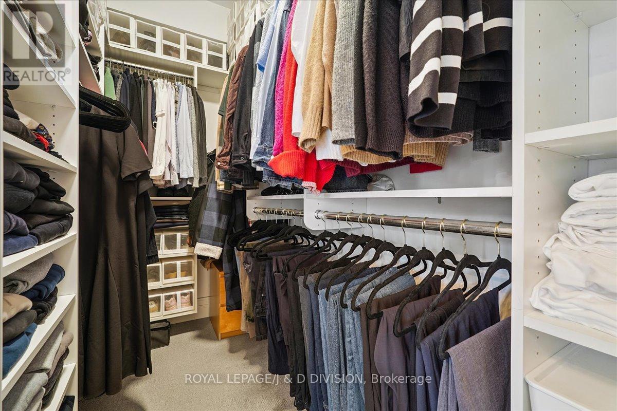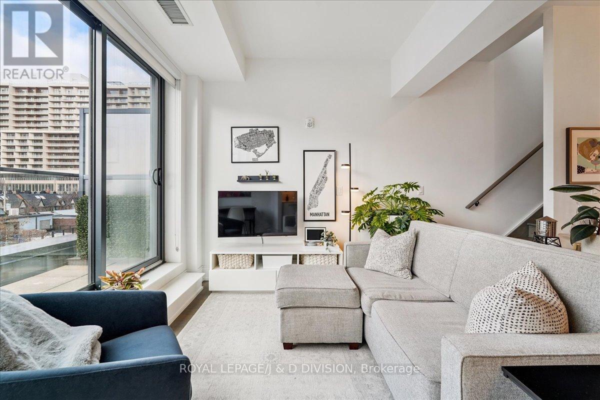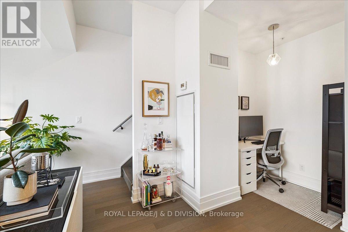 Rare two-storey King West condo with two private terraces. Large windows fill the home with abundant natural light creating a bright and welcoming living space. Picture your morning coffee on a private terrace while the city quietly wakes up below. The main level features soaring ceilings and an open living and dining area with a well-appointed kitchen, complete with Jenn-Air appliances and a Fisher & Paykel refrigerator and a powder room. The living area flows naturally to a private terrace with a gas BBQ line-perfect for relaxed outdoor dining. A dedicated home office on the main floor provides a comfortable and practical workspace. Upstairs, the primary bedroom easily accommodates a king-size bed and offers unobstructed northern views along with access to a second private terrace. A professionally customized walk-in closet by Simply Closets and convenient second-floor laundry add everyday functionality. The locker is on the second floor and parking is for a motorcycle. A quiet boutique building Residents enjoy a welcoming building community with a party room, bar, expansive outdoor terrace, TV and barbeque. Steps to King West restaurants, groceries, parks, 2 TTC street car access, the future Ontario Line at King & Bathurst nearby and Billy Bishop Airport is within walking distance. (id:64974)