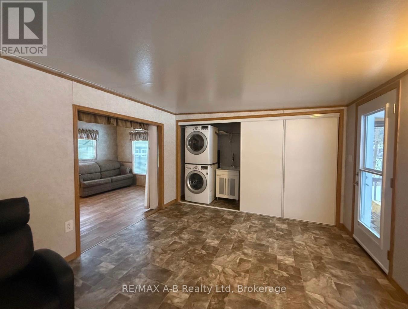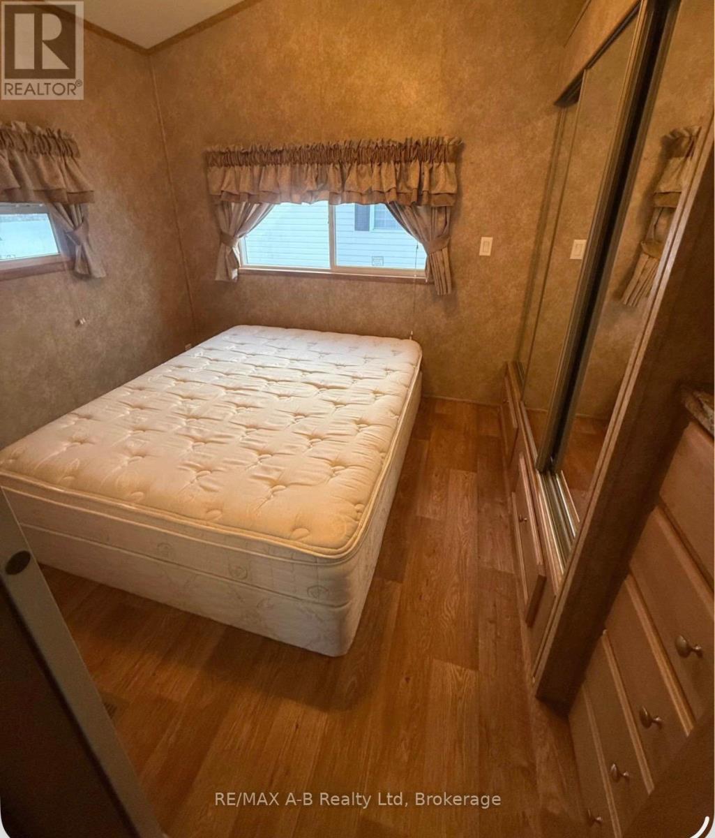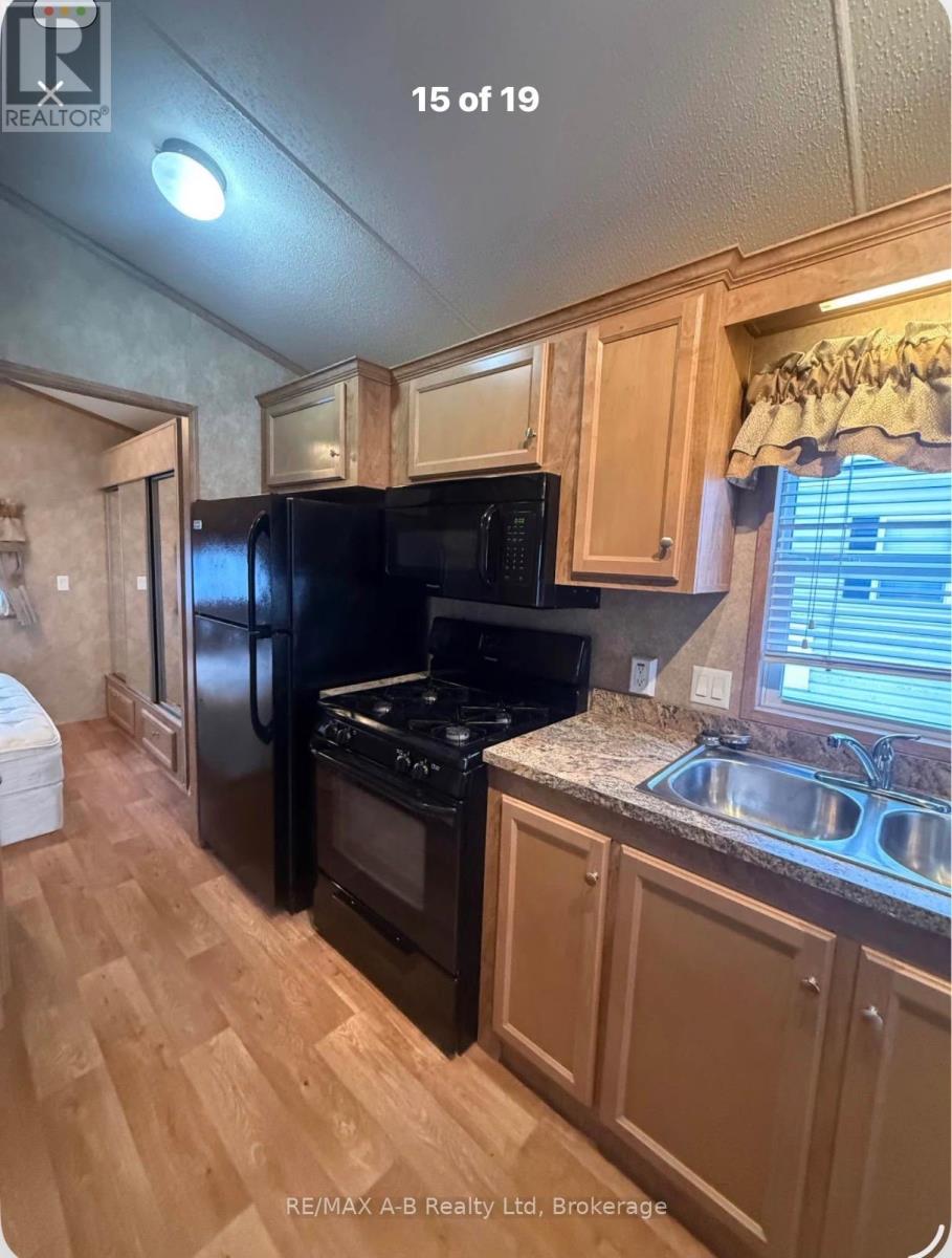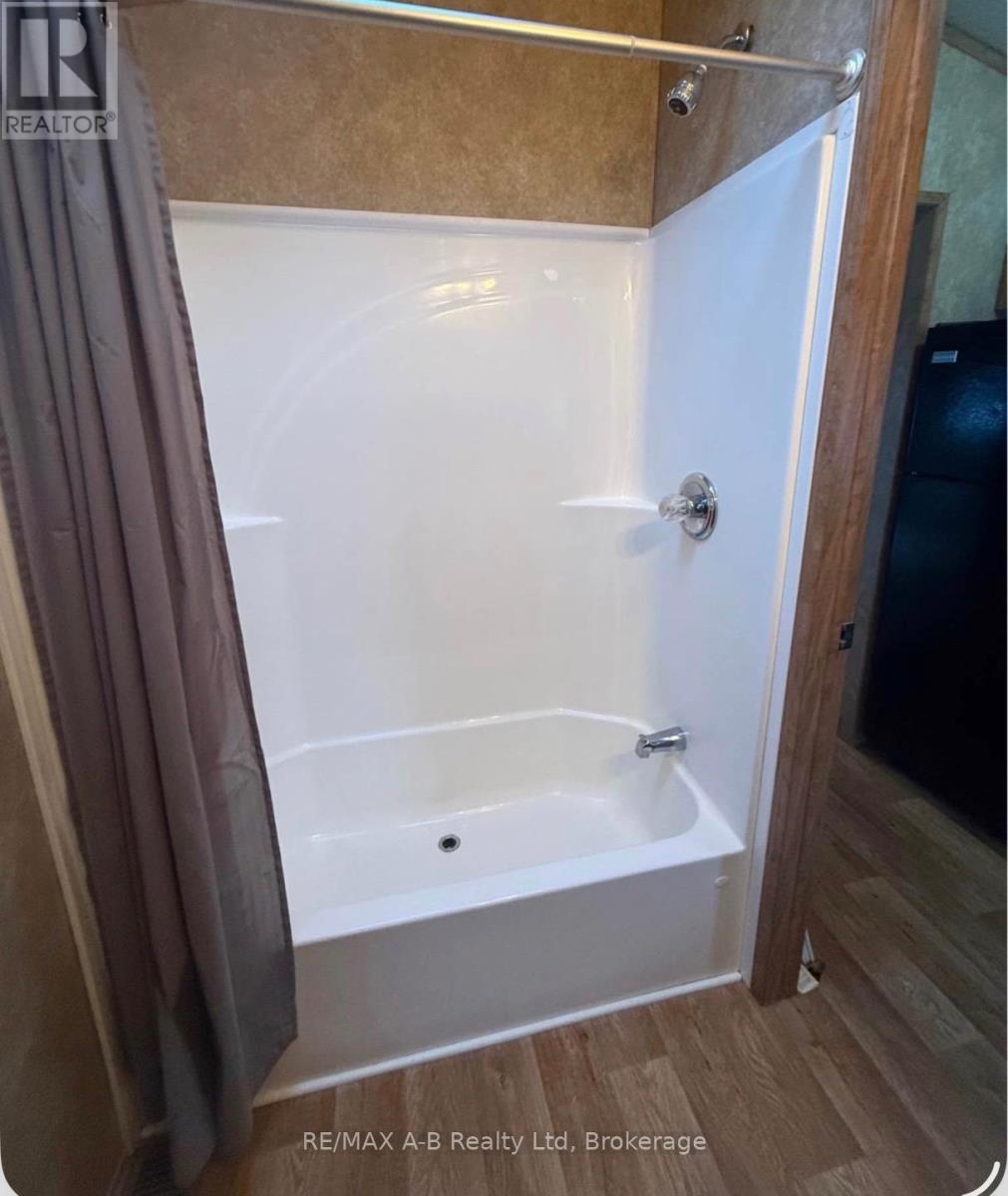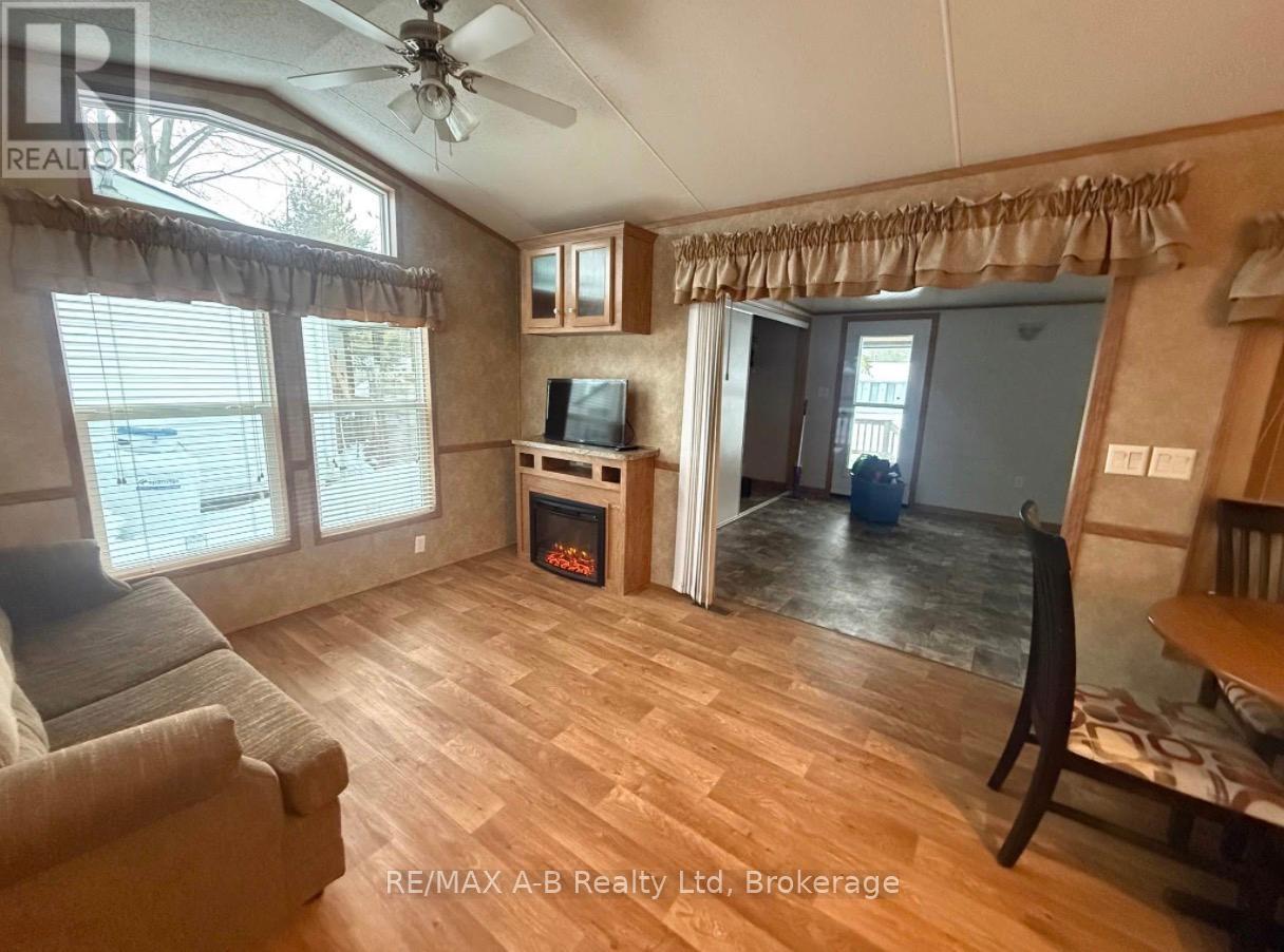 Escape to your own slice of seasonal paradise with this beautifully maintained 2017 Forest River park model, ideally located in the sought-after 9-month section of Happy Hills Resort. Tucked away in a quiet area of the park, this property offers relaxation, comfort, and outdoor enjoyment. Step inside to a bright and inviting front living room, complete with a cozy built-in fireplace, paddle fan with lighting, and sofa bed-perfect for hosting family and friends. The open-concept kitchen features black appliances, full-size fridge, propane stove, over the range microwave, and a dining area with seating for four, making entertaining easy and enjoyable. This unit offers 1 bedroom plus a versatile add-a-room, which can easily be converted into a second bedroom, giving you flexible space for guests or extended stays. The rear bedroom includes a queen-size bed and mirrored wardrobe, while the 4-piece bathroom provides both a tub and shower. Enjoy the convenience of in-suite laundry with a full-size washer and propane dryer, plus on-demand hot water for efficient, comfortable living. Outside is where this property truly shines-as you relax under the covered front porch, or unwind in the recessed hot tub. With a large carport and parking for up to 3 vehicles, there's plenty of space for family and friends. Whether you're looking for a weekend retreat, a seasonal getaway, or a place to create lasting memories, this Happy Hills gem delivers it all. (id:64974)