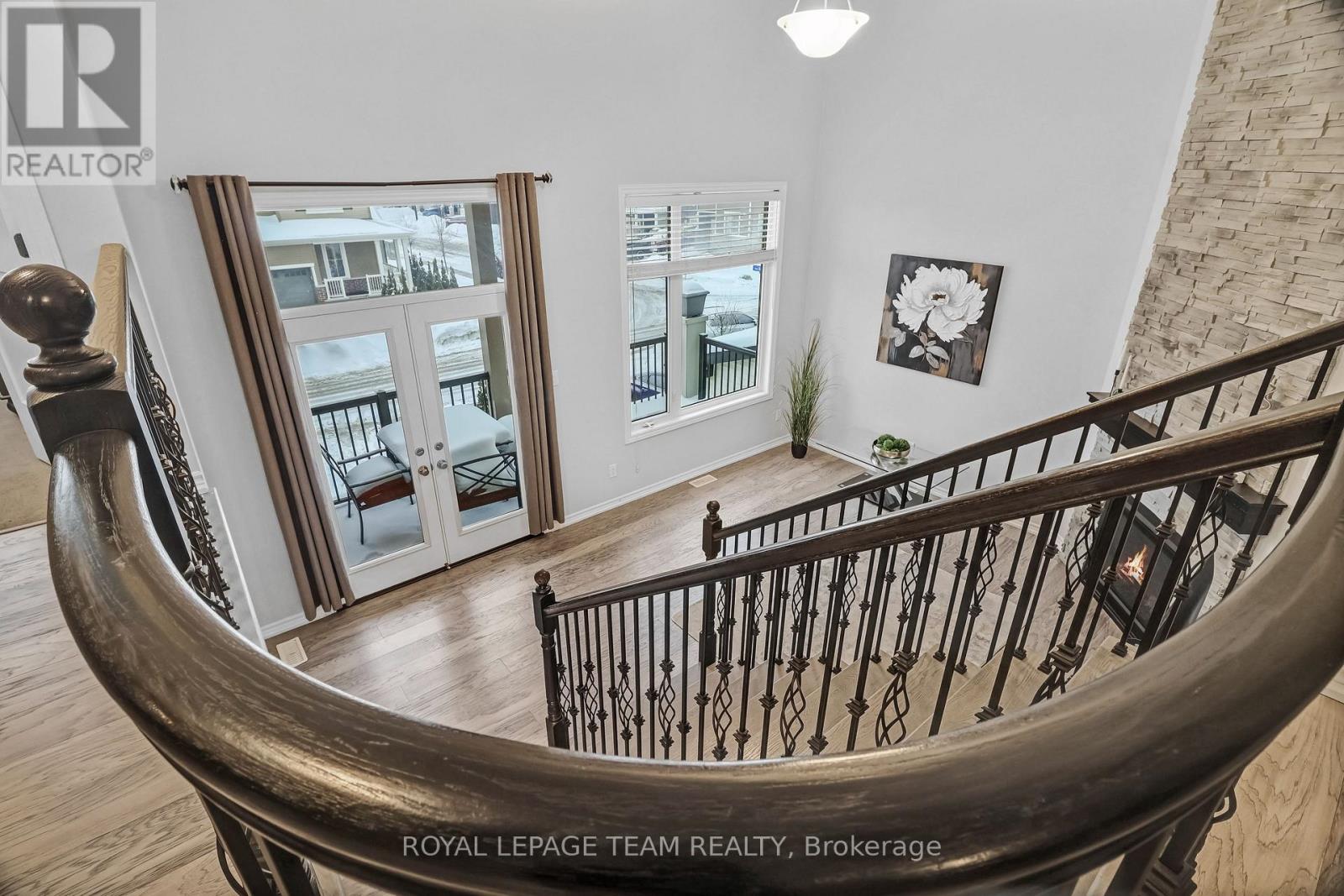 Located in the desirable enclave of Half Moon Bay, this prestigious home offers refined luxury and exceptional craftsmanship throughout. The main level features an elegant open-concept layout with a sophisticated living and dining area highlighted by a electric fireplace, flowing seamlessly into a chef-inspired kitchen appointed with custom extended cabinetry, quartz countertops, designer backsplash, and premium stainless steel appliances. The upper-level is truly impressive, featuring a dramatic great room with soaring ceilings, a striking stone-accented gas fireplace, and access to a private balcony-an ideal setting for both relaxation and entertaining. The upper level offers four spacious bedrooms, including a luxurious primary retreat with a spa-like five-piece ensuite, along with an additional full bathroom. Numerous high-end upgrades are showcased throughout, including enhanced lighting, premium finishes, and nine-foot ceilings on both the main and second floors. Ideally located near golf, parks, schools, shopping, and just 20 minutes from downtown Ottawa, this exceptional residence delivers an elevated lifestyle of comfort and elegance. (id:64974)