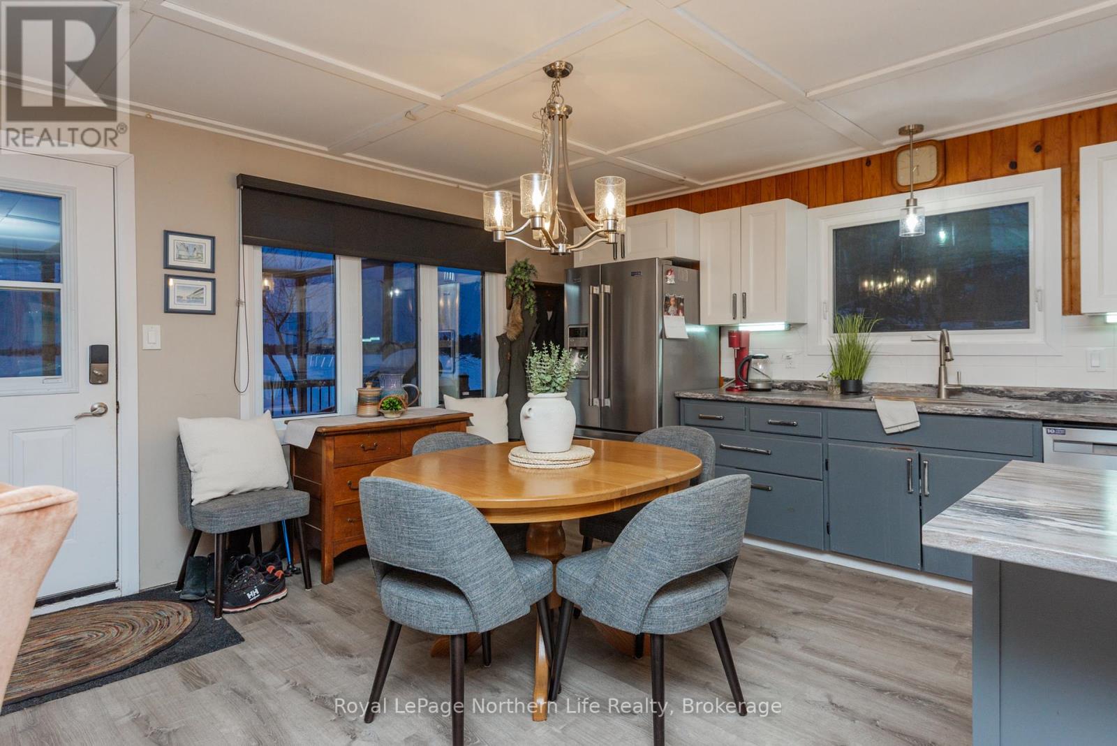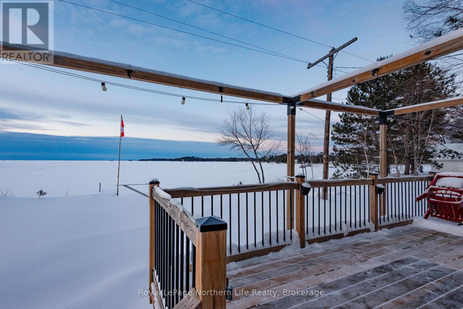 Welcome to 405 Bear Creek Road, a charming beachfront bungalow on Lake Nipissing, located in the highly desirable Bear Creek area. Enjoy the rare convenience of driving directly to your waterfront, making this an ideal year-round home or getaway. This level, well-usable property spans over 2 acres and extends on both sides of Bear Creek Road, offering added space, privacy, and ample parking. The cozy bungalow features 3 bedrooms, 1 bathroom, and just over 1,000 sq ft of living space. Inside, the open-concept kitchen, living, and dining area is filled with natural light and showcases breathtaking lake views from the living room. Electric heat provides efficient primary heating, complemented by the warmth and ambiance of a wood stove-perfect for cozy winter evenings. Step outside to enjoy the sandy beachfront and take in stunning sunsets over Lake Nipissing. A detached garage with drive-thru doors adds excellent functionality and easy yard access. A peaceful waterfront lifestyle awaits. (id:64974)