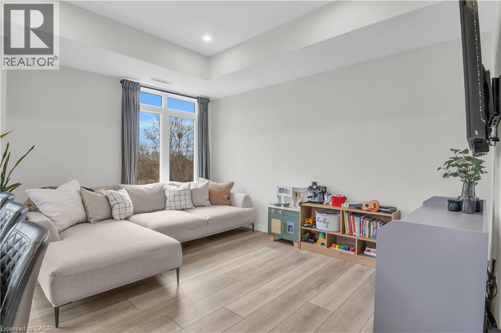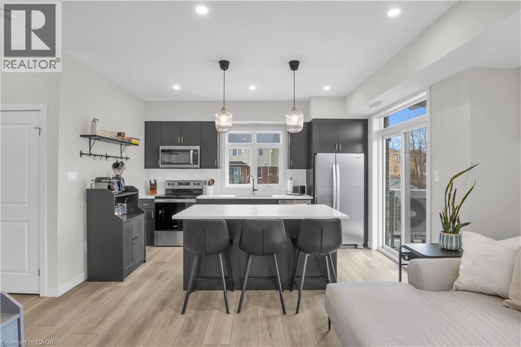 Welcome to 56-405 Myers Road in Cambridge! This bright and beautifully designed main floor end-unit stacked townhouse offers two bedrooms, two balconies, and a seamless blend of modern finishes and natural surroundings. As an end unit, the additional windows bring in an abundance of natural light, creating a warm and inviting atmosphere throughout. Backing onto peaceful trails and greenspace, this home offers a rare sense of privacy and a connection to nature, with both balconies facing the greenery. One balcony is conveniently located off the kitchen—perfect for morning coffee or evening unwinding—while the second is accessed from the bedroom, offering another quiet outdoor retreat. The open-concept layout is both functional and stylish, effortlessly connecting the living, dining, and kitchen areas. The kitchen is a standout feature, complete with stainless steel appliances, quartz countertops, ample cabinetry, and a large island with pendant lighting—ideal for gathering, cooking, or casual dining. Quartz surfaces continue into the bathrooms, adding a polished and cohesive feel throughout the home. Both bedrooms are well-sized and thoughtfully laid out, with the primary suite featuring its own ensuite with a glass shower. Ensuite laundry and a dedicated parking space add to the everyday convenience. Set in a well-connected neighbourhood close to schools, parks, shopping, and recreational amenities, this home offers a comfortable and vibrant lifestyle with nature right at your doorstep. (id:64974)
