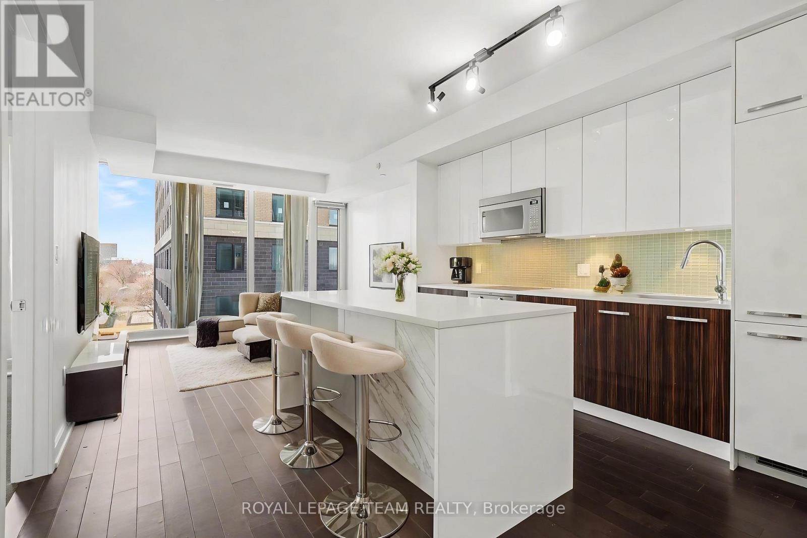 OPEN HOUSE THIS THURSDAY 5-7! Welcome to 111 Champagne #404, where the sophisticated SOHO lifestyle meets the vibrant energy of Little Italy. This sleek, freshly painted one-bedroom suite offers a premier urban retreat featuring an open-concept layout with engineered hardwood, quartz countertops, and premium cabinet-matched appliances. The spacious bedroom serves as a quiet haven with plush carpeting, while the three-piece bathroom features a luxurious walk-in tile shower and quartz vanity. Beyond the private, north-facing balcony and in-unit laundry, this unit includes one underground parking spot and an exclusive storage locker. Residents enjoy unmatched resort-style amenities, including an outdoor pool and hot tub, a gym, a private movie theatre, 24/7 concierge service, and a car wash equipped with EV chargers. With a Walk Score of 90, you are perfectly positioned steps from the iconic dining on Preston Street, Dow's Lake, and the Carling LRT, making this an incredible turnkey opportunity for professionals and investors alike. Additional information and full videos are available on the property website. (id:64974)